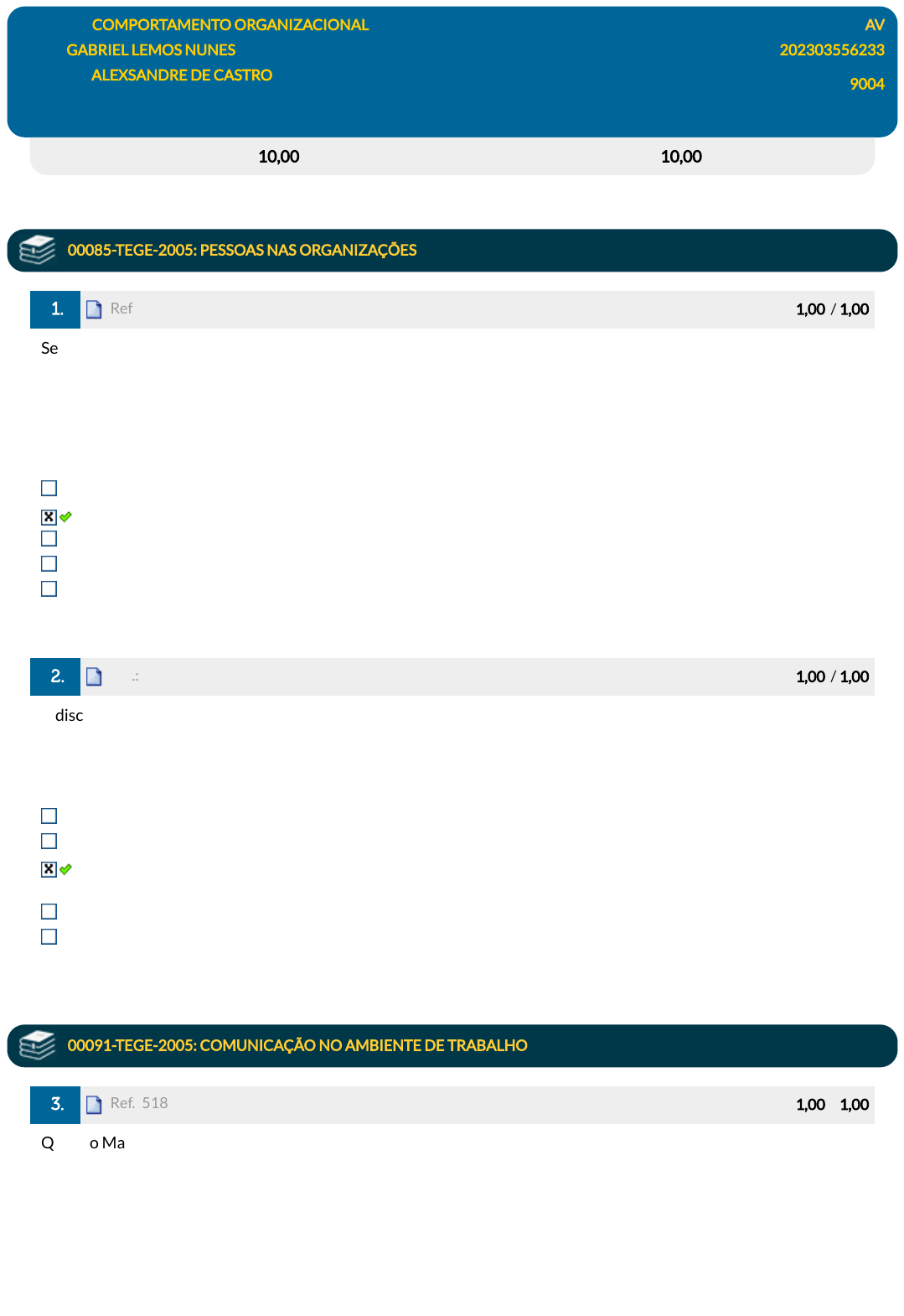 Disciplina: COMPORTAMENTO ORGANIZACIONAL AV Aluno: GABRIEL LEMOS NUNES 202303556233 Professor: ALEXSANDRE DE CASTRO Turma: 9004 DGT0002_AV_202303556233 (AG) 28/05/2023 20:06:50 (F) Avaliação: 10,00 pts Nota SIA: 10,00 pts 00085-TEGE-2005: PESSOAS NAS ORGANIZAÇÕES 1. Ref.: 7790004 Pontos: 1,00 / 1,00 Se a importância do potencial humano dentro das organizações não pode ser mais questionada, deve-se procurar formas de envolver as pessoas nos projetos que são desenvolvidos. Isso, no entanto, depende: I- da interação entre as pessoas. II- do compartilhamento das informações e do conhecimento. III- dos líderes, que precisam abrir espaço para o debato construtivo. É correto o que se a�rma em I e II, apenas. I, II e III. I e III, apenas. II e III, apenas. I, apenas. 2. Ref.: 5193639 Pontos: 1,00 / 1,00 A discussão sobre a inter-relação entre aprendizagem e organização não é recente. Exige-se cada vez mais das empresas uma postura voltada à ação e re�exão de suas práticas e a melhoria contínua de seus processos. Inúmeros são os imperativos que se fazem necessários para a transformação de empresas tradicionais em modelos de organizações de aprendizagem. Para isso, é preciso: uma postura passiva entre os empregados para que não se abra espaço à discussão. posturas autocráticas em relação às decisões, processos e resultados o autoconhecimento, que promove a clari�cação dos objetivos individuais e o fortalecimento das competências. o estímulo à aprendizagem em circuito simples, condição que leva ao questionamento dos padrões vigentes. a construção de uma cultura que tenha como característica a punição quando se erra. 00091-TEGE-2005: COMUNICAÇÃO NO AMBIENTE DE TRABALHO 3. Ref.: 5187876 Pontos: 1,00 / 1,00 Quando Maria analisou o sistema de comunicação existente entre os integrantes do local em que trabalha, ela detectou alguns pontos cuja correção se faz necessária. São eles: I- nos momentos de discussão, é notória a presença de julgamento pessoal entre os colegas; II- inexistência de feedback em qualquer mensagem; III- uso excessivo de rótulos pessoais. javascript:alert('C%C3%B3digo da quest%C3%A3o: 7790004.'); javascript:alert('C%C3%B3digo da quest%C3%A3o: 5193639.'); javascript:alert('C%C3%B3digo da quest%C3%A3o: 5187876.'); Está(ão) correto(s) o(s) item(ns): II, apenas II e III, apenas. I e II, apenas I, apenas I, II e III. 4. Ref.: 5196524 Pontos: 1,00 / 1,00 Hoje em dia, valoriza-se bastante a comunicação ascendente no ambiente organizacional interno. Isto ocorre, pois: os líderes tomam decisões diariamente e precisam comunicá-las às suas equipes de trabalho. os pares de trabalho, que atuam no mesmo nível organizacional, precisam se comunicar abertamente sobre os processos internos. a gestão conta com este tipo de comunicação para obter ideias de como pode melhorar processos internos. os líderes devem estabelecer os processos e comunicá-los às suas equipes de trabalho. manuais de procedimentos são essenciais para o bom funcionamento das atividades laborais diárias nas equipes. 00252-TEGE-2005: LIDERANÇA, PODER E AUTORIDADE 5. Ref.: 5196553 Pontos: 1,00 / 1,00 Os líderes conectivos são próprios do cenário atual. Em uma época de colaboração e cooperação, eles introduzem e exploram interconexões entre pessoas, instituições e processos quando atuam da seguinte maneira: I- reúnem os empregados em torno de objetivos comuns; II- incentivam os empregados a assumir responsabilidades em todos os níveis; III- reconhecem as contribuições e o desempenho do trabalho realizado. Está(ão) correto(s): os itens I, II e III. apenas os itens II e III. apenas o item II. apenas o item I. apenas os itens I e II. 6. Ref.: 7640488 Pontos: 1,00 / 1,00 A liderança situacional tem como pressuposto a análise do comportamento dos liderados sob a perspectiva de algumas variáveis. São elas: I. Maturidade II. Experiência III. Autonomia IV. Faixa etária É correto o que se a�rma em: javascript:alert('C%C3%B3digo da quest%C3%A3o: 5196524.'); javascript:alert('C%C3%B3digo da quest%C3%A3o: 5196553.'); javascript:alert('C%C3%B3digo da quest%C3%A3o: 7640488.'); I, II, III e IV I, II e III I, II e IV II e III apenas I e IV apenas 00283-TEGE-2005: A MOTIVAÇÃO E O TRABALHO 7. Ref.: 5190946 Pontos: 1,00 / 1,00 No que diz respeito ao comportamento humano no trabalho, a motivação é, sem dúvida, um dos aspectos que têm merecido mais estudos, com a apresentação de diferentes teorias. Uma das clássicas abordagens sobre o fenômeno da motivação foi proposta por Abraham Maslow, denominada Teoria da Hierarquia das Necessidades Humanas. De acordo com essa teoria: Existe uma clara prevalência das necessidades psicológicas, intrínsecas a cada indivíduo, como as de estima e pertencimento ao grupo, em relação a necessidades de subsistência, representadas por recompensas estritamente �nanceiras. O comportamento humano não comporta generalizações. Cada ser humano possui a própria escala de valores e, assim, a hierarquia das necessidades a serem satisfeitas para fomentar a motivação é variável para cada indivíduo. O papel do líder ou gestor é identi�car, em cada grupo de funcionários, as principais necessidades a serem supridas, buscando um perfeito alinhamento entre os objetivos perseguidos pela organização e as recompensas, �nanceiras ou não, oferecidas aos funcionários. A motivação é causada por necessidades �siológicas, de satisfação, sociais, de realização e de estima, respectivamente. Existe uma escala de valores a serem transpostos e o indivíduo só irá se sentir estimulado a buscar a satisfação de uma necessidade mais elevada, como a de autorrealização, se uma anterior, mais básica, como segurança, já estiver satisfeita. 8. Ref.: 3926906 Pontos: 1,00 / 1,00 Sabe-se que pessoas motivadas são criativas, envolvem-se na solução de problemas, aproveitam as oportunida