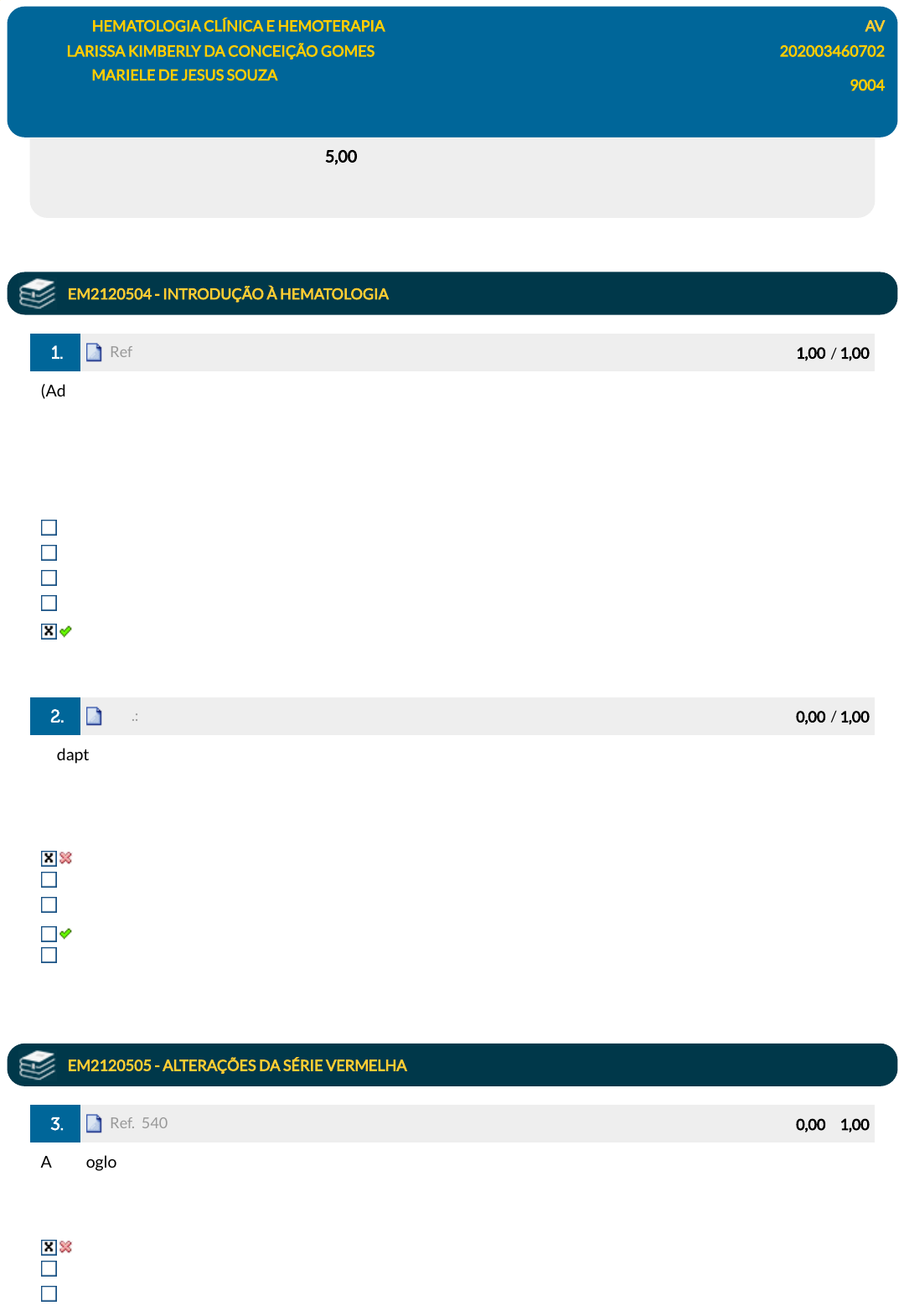 Disciplina: HEMATOLOGIA CLÍNICA E HEMOTERAPIA AV Aluno: LARISSA KIMBERLY DA CONCEIÇÃO GOMES 202003460702 Professor: MARIELE DE JESUS SOUZA Turma: 9004 SDE4538_AV_202003460702 (AG) 26/05/2023 15:25:38 (F) Avaliação: 5,00 pts Nota SIA: Dispositivo liberado pela Matrícula 202003460702 com o token 486202 em 26/05/2023 15:17:58. EM2120504 - INTRODUÇÃO À HEMATOLOGIA 1. Ref.: 5400411 Pontos: 1,00 / 1,00 (Adaptado de Instituto Uni�l -Prefeitura de Tupassi -PR -Farmacêutico Analista Clínico -Bioquímico -2019) A hemostasia é o conjunto de fenômenos biológicos que ocorre em resposta imediata a lesões, com o objetivo de deter a hemorragia pela formação, e posterior dissolução, do coágulo, restabelecimento do �uxo sanguíneo e reparação tecidual. A seguir é listada uma série de exames que avalizam a homeostasia. Assinale a alternativa que não representa um teste utilizado para essa avaliação: dosagem dos fatores de coagulação contagem de plaquetas tempo de sangramento tempo de protrombina dosagem de ferro 2. Ref.: 5400418 Pontos: 0,00 / 1,00 (Adaptado de CCV-UFC -UFC - 2017 -Farmacêutico) O �brinogênio é um dos treze fatores de coagulação responsáveis pela coagulação normal do sangue. O �brinogênio é uma proteína produzida no fígado que é essencial para uma variedade de processos, incluindo formação de coágulos sanguíneos, cicatrização de feridas, in�amação e crescimento de vasos sanguíneos. Uma avaliação rápida da atividade do �brinogênio pode ser realizada por: Tempo de protrombina (TP) Tempo de coagulação Tempo de tromboplastina Parcial Ativada (TTPA) Tempo de Trombina (TT) Adesividade plaquetária (AP) EM2120505 - ALTERAÇÕES DA SÉRIE VERMELHA 3. Ref.: 5400603 Pontos: 0,00 / 1,00 A hemoglobina H é composta de tetrâmeros de cadeias β-globínicas, que apresentam nos eritrócitos um aspecto de bola de golfe e que pode ser detectado a partir da coloração com azul de cresil brilhante. A presença dessa hemoglobina é característica de que tipo de anemia? Anemia falciforme. Anemia ferropriva. β-talassemia. javascript:alert('C%C3%B3digo da quest%C3%A3o: 5400411.'); javascript:alert('C%C3%B3digo da quest%C3%A3o: 5400418.'); javascript:alert('C%C3%B3digo da quest%C3%A3o: 5400603.'); α-talassemia. Hemoglobinúria paroxística moturna. 4. Ref.: 5406286 Pontos: 1,00 / 1,00 Foi admitida, no pronto-socorro de um hospital, uma mulher de 80 anos com história de parestesias em membros inferiores, piora cognitiva progressiva e queda do estado geral. Na admissão, apresentava-se em regular estado geral, descorada, hiporresponsiva e confusa. Nos exames laboratoriais, foram encontrados os seguintes dados: Qual o possível diagnóstico da paciente? Anemia megaloblástica. Anemia falciforme. Esferocitose hereditária. Anemia autoimune Talassemia. EM2120506 - ALTERAÇÕES DA SÉRIE BRANCA E DAS PLAQUETAS 5. Ref.: 5418419 Pontos: 0,00 / 1,00 Paciente de 60 anos foi ao médico após notar a presença de nódulos nos gânglios linfáticos. O médico então solicitou alguns exames, são eles, a biópsia do linfonodo e o hemograma. No hemograma, foi encontrado linfocitose e células linfoides grandes com a cromatina difusa. No linfonodo, foi realizado análise citogenética que revelou a translocação (14,18). Na imunofenotipagem, observou-se a expressão dos antígenos CD19, CD20 e CD79b, IGM e IgG com restrição da cadeia leve da imunoglobulina, CD45, e ausência dos antígenos CD5, CD10 e CD23. Qual é o possível diagnóstico? Linfoma de Burkitt. javascript:alert('C%C3%B3digo da quest%C3%A3o: 5406286.'); javascript:alert('C%C3%B3digo da quest%C3%A3o: 5418419.'); Linfoma nodular de predomínio linfocitário. Linfoma difuso de grandes células B. Linfoma de Hodgkin Linfoma folicular. 6. Ref.: 5418339 Pontos: 1,00 / 1,00 (Adaptado de EMSEH MA-FUNCAB-2015- farmacêutico) Um paciente adulto do sexo feminino com suspeita de leucemia, ao apresentar o mielograma com mais de 30% de promilócitos, hipergranulares da série não eritroide, 5% de blastos, teste da peroxidase e Sudan Black positivos, terá como diagnóstico? LMA-M0. LLA-L3. LLA-L2. LMA -M3. LLA-L1. EM2120507 - SÍNDROMES E TRANSTORNOS HEMATOLÓGICOS 7. Ref.: 5423645 Pontos: 1,00 / 1,00 As neoplasias mieloproliferativas crônicas são doenças clonais das células-tronco caracterizadas pela superprodução de uma ou mais linhas celulares sanguíneas. Sobre o assunto, assinale a alternativa correta. Apesar de as neoplasias mieloproliferativas serem alterações que acometem todas as séries da linhagem mieloide, a série eosinofílica não é reportada como uma NMP. Na mutação JAK2V617F, há uma substituição da tirosina, encontrada em 90% dos casos de policitemia vera, pelo ácido glutâmico. A policitemia vera é uma doença clonal de uma linhagem, estando limitada às células vermelhas. Quando a mielo�brose progride com falência medular, o único tratamento com potencial curativo é o transplante de medula óssea. Na trombocitemia essencial, o risco de transformação leucêmica é em torno de 30% ao longo dos primeiros 15 anos. 8. Ref.: 5423709 Pontos: 0,00 / 1,00 Paciente de dois anos deu entrada no hospital com clínica de infecção respiratória apresentando tosse, febre alta e secreção mucopurulenta. O médico de plantão pediu um exame. No hemograma, foi relatado leucocitose intensa (150.000 células/µL), com o predomínio de linfócitos. No esfregaço sanguíneo, os linfócitos eram pequenos e maduros, atípicos pela presença de linfócitos lobulares. A partir desse hemograma, qual é o possível diagnóstico? LLC Dengue Mononucleose infecciosa Coqueluche Mieloma múltiplo EM2120702 - INTRODUÇÃO À HEMOTERAPIA javascript:alert('C%C3%B3digo da quest%C3%A3o: 5418339.'); javascript:alert('C%C3%B3digo da quest%C3%A3o: 5423645.'); javascript:alert('C%C3%B3digo da quest%C3%A3o: 5423709.'); 9. Ref.: 5292454 Pontos: 0,00 / 1,00 Os procedimentos especiais são importantes 