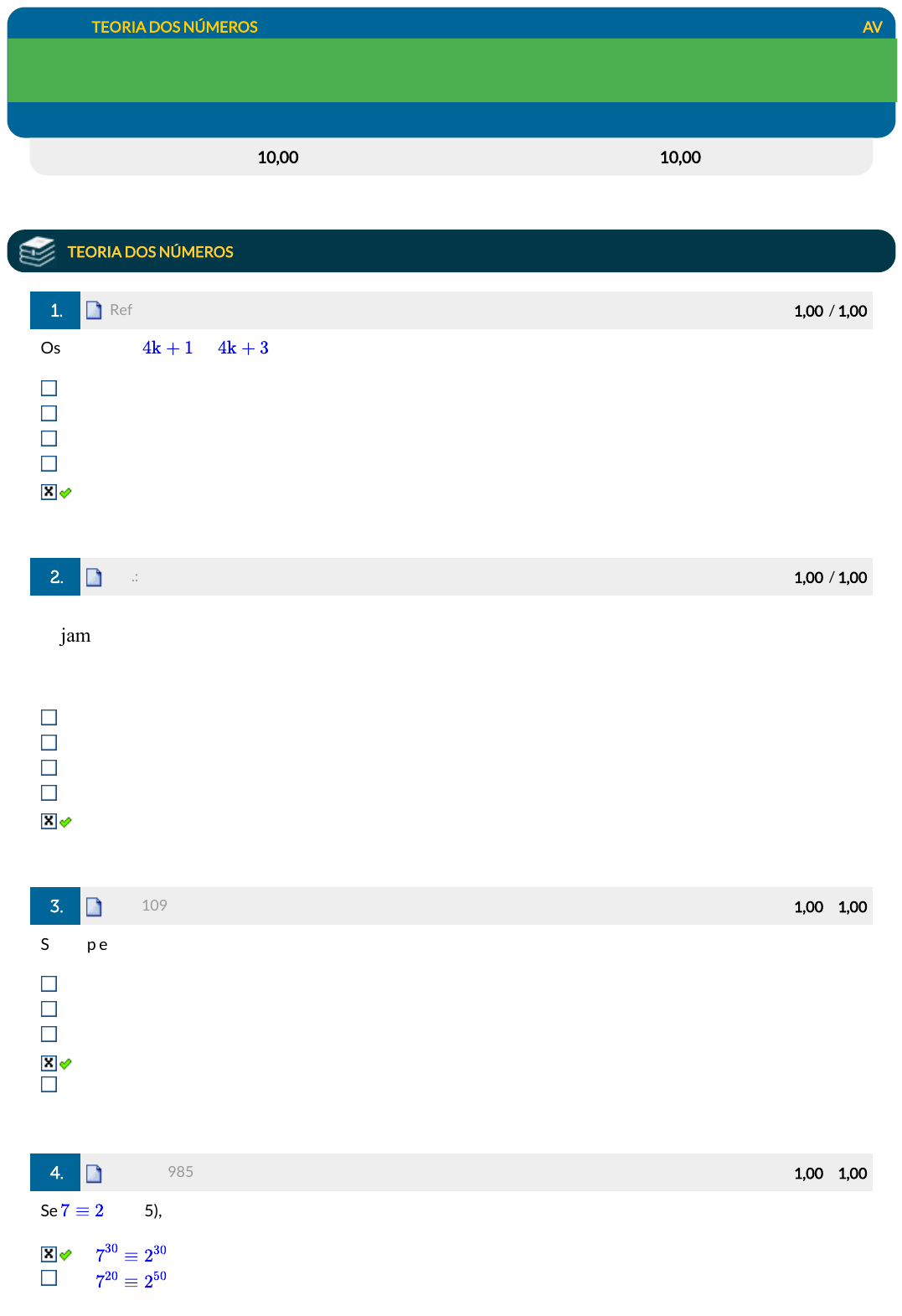 12/06/2023, 13:12 EPS https://simulado.estacio.br/alunos/template.asp?pagina=bdq_alunos_agendamento.asp&f_cod_disc=# 1/3 Disciplina: TEORIA DOS NÚMEROS AV Aluno: LUIZ HENRIQUE DA SILVA SORIANO 202004142917 Professor: JULIANA VICENTE DOS SANTOS Turma: 9004 DGT0699_AV_202004142917 (AG) 05/06/2023 14:03:26 (F) Avaliação: 10,00 pts Nota SIA: 10,00 pts TEORIA DOS NÚMEROS 1. Ref.: 103093 Pontos: 1,00 / 1,00 Os inteiros da ou são sempre: quadrados perfeitos múltiplos de 7 divisores de 4 pares impares 2. Ref.: 103042 Pontos: 1,00 / 1,00 Sejam a e b inteiros menores que 100. O produto de a por b é 1728 e o mdc(a,b) é 12. Podemos afirmar que: 27 e 64 96 e 18 16 e 108 32 e 54 36 e 48 3. Ref.: 109775 Pontos: 1,00 / 1,00 Sejam p e q os dois maiores números primos que aparecem na decomposição do número 420,então p+q é igual a: 7 10 9 12 8 4. Ref.: 102985 Pontos: 1,00 / 1,00 Se (mod5), podemos a�rmar que: (mod 5) (mod 2) 4k + 1 4k + 3 7 ≡ 2 7 30 ≡ 2 30 7 20 ≡ 2 50 javascript:alert('C%C3%B3digo da quest%C3%A3o: 103093.'); javascript:alert('C%C3%B3digo da quest%C3%A3o: 103042.'); javascript:alert('C%C3%B3digo da quest%C3%A3o: 109775.'); javascript:alert('C%C3%B3digo da quest%C3%A3o: 102985.'); 12/06/2023, 13:12 EPS https://simulado.estacio.br/alunos/template.asp?pagina=bdq_alunos_agendamento.asp&f_cod_disc=# 2/3 (mod 15) (mod 2) (mod 7) 5. Ref.: 876501 Pontos: 1,00 / 1,00 Dada a equação diofantina 14x + 22y = 50, determine a sua solução geral. x = -75 + 11t e y = 50 - 7t x = -45 + 8t e y = 24 - 8t x = -55 + 10t e y = 70 - 5t x = -25 + 11t e y = 35 - 7t x = -5 + 12t e y = 5 - 8t 6. Ref.: 102917 Pontos: 1,00 / 1,00 Seja a congruência 65x 143(mod 130). Podemos a�rmar que: Só tem solução com valores negativos de x Zero é uma solução Não tem solução -1 é uma solução Só tem solução com valores positivos de x. 7. Ref.: 731031 Pontos: 1,00 / 1,00 Um criador de aves tem um certo número de ovos; quando os divide por 3, sobra-lhe 1; quando os divide por 4, sobram 2 ovos; e quando os divide por 5, sobram 3. Quantos ovos tem o criador de aves, sabendo que esse número não ultrapassa 70 ovos? 56 59 57 58 55 8. Ref.: 124137 Pontos: 1,00 / 1,00 O resto da divisão de 310 por 7 é igual a : 3 2 4 1 5 9. Ref.: 573372 Pontos: 1,00 / 1,00 7 30 ≡ 2 15 7 20 ≡ 7 50 7 30 ≡ 2 30 ≡ javascript:alert('C%C3%B3digo da quest%C3%A3o: 876501.'); javascript:alert('C%C3%B3digo da quest%C3%A3o: 102917.'); javascript:alert('C%C3%B3digo da quest%C3%A3o: 731031.'); javascript:alert('C%C3%B3digo da quest%C3%A3o: 124137.'); javascript:alert('C%C3%B3digo da quest%C3%A3o: 573372.'); 12/06/2023, 13:12 EPS https://simulado.estacio.br/alunos/template.asp?pagina=bdq_alunos_agendamento.asp&f_cod_disc=# 3/3 Calcular o reto da divisão de x por y sendo x = 15! e Y = 17. 5 4 2 3 1 10. Ref.: 124093 Pontos: 1,00 / 1,00 O valor de phi(4!) é: 6 5 3 4 8 javascript:alert('C%C3%B3digo da quest%C3%A3o: 124093.');