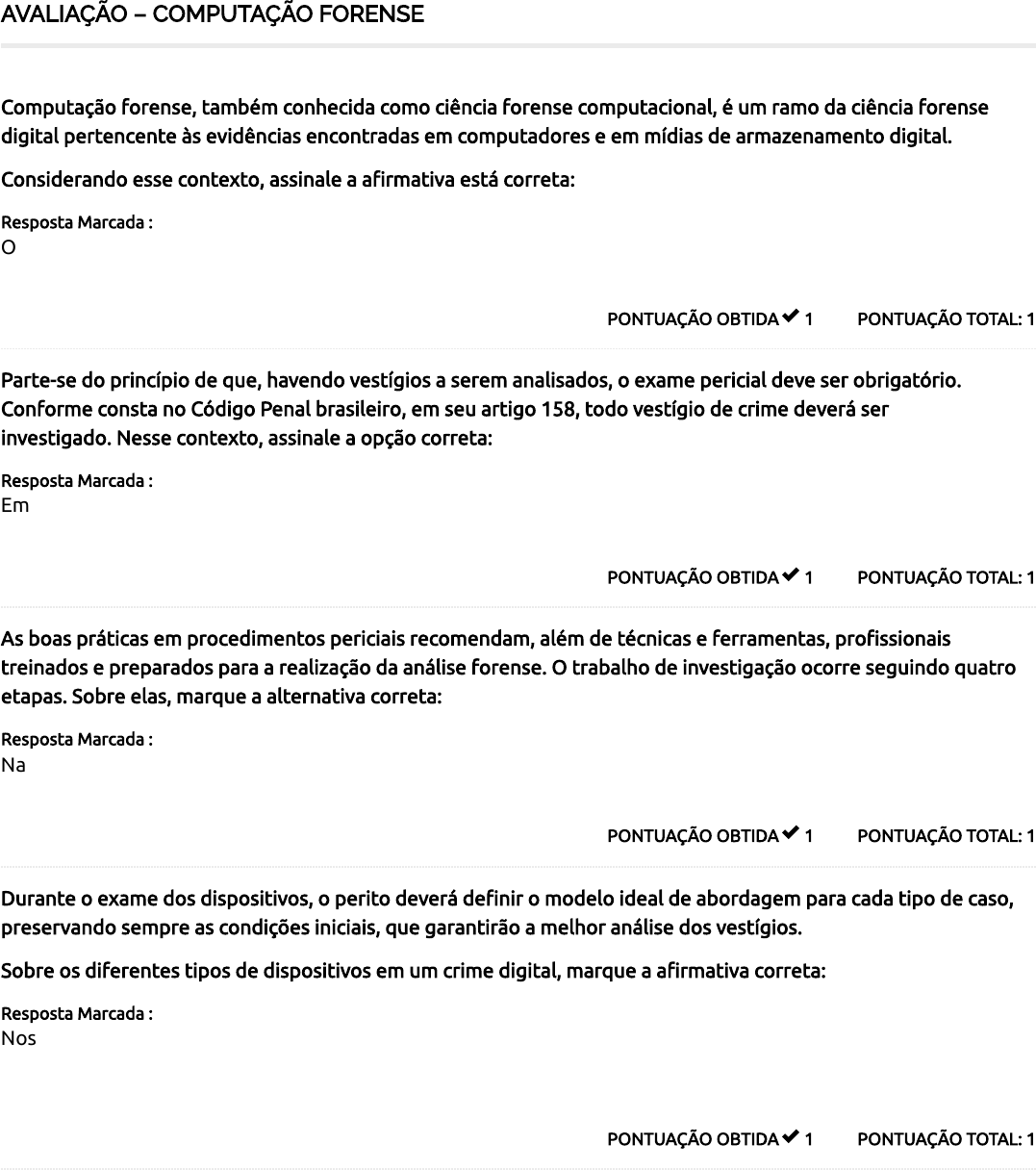 12/06/2023, 14:41 Course Status – Pós Graduação Cerquilho https://ava.faculdadecerquilho.com.br/course-status/ 1/2 AVALIAÇÃO – COMPUTAÇÃO FORENSE PONTUAÇÃO TOTAL: 1PONTUAÇÃO OBTIDA 1 Computação forense, também conhecida como ciência forense computacional, é um ramo da ciência forense digital pertencente às evidências encontradas em computadores e em mídias de armazenamento digital. Considerando esse contexto, assinale a a�rmativa está correta: Resposta Marcada : O cenário de impunidade no ambiente digital tem mudado, com métodos de investigação para os crimes digitais utilizando técnicas e conhecimentos especí�cos, o que permite a investigação e comprovação desses crimes. PONTUAÇÃO TOTAL: 1PONTUAÇÃO OBTIDA 1 Parte-se do princípio de que, havendo vestígios a serem analisados, o exame pericial deve ser obrigatório. Conforme consta no Código Penal brasileiro, em seu artigo 158, todo vestígio de crime deverá ser investigado. Nesse contexto, assinale a opção correta: Resposta Marcada : Em caso de não possibilidade de aquisição de novos equipamentos, a esterilização das mídias deve ser realizada para evitar contaminação. PONTUAÇÃO TOTAL: 1PONTUAÇÃO OBTIDA 1 As boas práticas em procedimentos periciais recomendam, além de técnicas e ferramentas, pro�ssionais treinados e preparados para a realização da análise forense. O trabalho de investigação ocorre seguindo quatro etapas. Sobre elas, marque a alternativa correta: Resposta Marcada : Na fase de análise, nem todos os dados levantados poderão ser analisados devido ao grande volume de informações. PONTUAÇÃO TOTAL: 1PONTUAÇÃO OBTIDA 1 Durante o exame dos dispositivos, o perito deverá de�nir o modelo ideal de abordagem para cada tipo de caso, preservando sempre as condições iniciais, que garantirão a melhor análise dos vestígios. Sobre os diferentes tipos de dispositivos em um crime digital, marque a a�rmativa correta: Resposta Marcada : Nos casos de crimes que envolvem e-mails, o grande desa�o é acessar computadores utilizados que podem estar em território nacional ou em outros países. É necessário localizar remetentes, endereço IP, domínio da Internet e conteúdo. 12/06/2023, 14:41 Course Status – Pós Graduação Cerquilho https://ava.faculdadecerquilho.com.br/course-status/ 2/2 10 / 10 PONTUAÇÃO TOTAL: 1PONTUAÇÃO OBTIDA 1 A di�culdade em investigar, comprovar e julgar crimes cibernéticos ocorre pela complexidade da falta de fronteira digital, uma vez que qualquer conteúdo é acessado de qualquer lugar no mundo. Nesse contexto, várias iniciativas podem ser observadas no Brasil e em todo o mundo, como aprovação de leis e marcos civis que visam a tornar o ambiente digital mais seguro e também garantir a devida punição para crimes computacionais. Nesse contexto, assinale a a�rmativa correta: Resposta Marcada : Entre as ações previstas no Decreto nº 10.222/2020, uma delas é ampliar a cooperação internacional do Brasil em segurança cibernética. PONTUAÇÃO TOTAL: 1PONTUAÇÃO OBTIDA 1 O que o perito deve buscar? Resposta Marcada : Todas as alternativas anteriores. PONTUAÇÃO TOTAL: 1PONTUAÇÃO OBTIDA 1 O perito deve: Resposta Marcada : Identi�car o serviço web, identi�car o site hospedeiro, preservar as evidências, analisar as logs e analisar os aplicativos e serviços da rede. PONTUAÇÃO TOTAL: 1PONTUAÇÃO OBTIDA 1 Os principais tipos de crimes cometidos por meio de sites são: Resposta Marcada : Ataques a sites, invasões, plágio, phishing (páginas falsas), malware, pornogra�a e furto de dados. PONTUAÇÃO TOTAL: 1PONTUAÇÃO OBTIDA 1 Os principais tipos de crimes cometidos por meio de e-mail são: Resposta Marcada : Questões trabalhistas, calúnia, difamação, desonra, concorrência desleal, ameaças anônimas e espionagem. PONTUAÇÃO TOTAL: 1PONTUAÇÃO OBTIDA 1 Os principais tipos de crimes cometidos por meio de celular são: Resposta Marcada : Invasões, espionagem, calúnia, difamação e pornogra�a. Total
