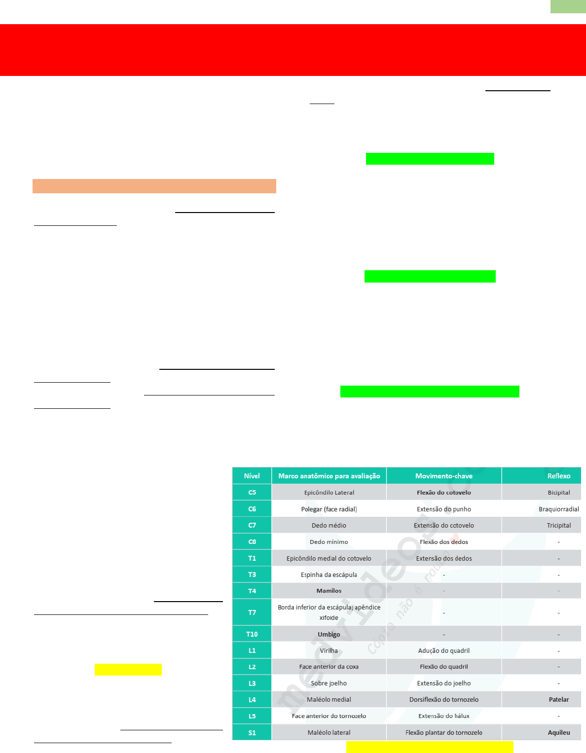 1 Marcela Oliveira - Medicina UNIFG 2023 Trauma raquimedular (trm) A medula espinhal é considerada como SNC (primeiro neurônio), mas as raízes nervosas são consideradas como sistema nervoso periférico (segundo neurônio). Isso implica que lesões da medula espinhal terão apresentação com liberação piramidal, enquanto lesões das raízes não terão. TRAUMA RAQUIMEDULAR É um trauma que envolve a coluna vertebral e a medula espinhal. É um trauma predominantemente de adultos jovens. Mais frequentemente acomete a coluna cervical; O TRM associa-se basicamente com acidentes automobilísticos ou queda de altura. TCE associam-se ao TRM em até 74% dos casos. Pela energia do trauma pode ocorrer uma fratura do corpo vertebral, que colapsa e comprime o canal medular, ou pode ocorrer uma luxação vertebral, igualmente diminuindo o diâmetro do canal vertebral. Em ambos os casos, a transmissão de impulsos pela medula espinhal é interrompida, parcial ou totalmente. Isso gera o que chamamos de nível neurológico: um nível abaixo do qual não há mais funcionamento neurológico normal. Com isso, há liberação piramidal e perda de função simpática, o que leva a descontrole autonômico, particularmente importante para o choque neurológico. SCIWORA: é uma lesão que ocorre em crianças na qual ocorre lesão medular sem alteração radiográfica óssea. O mecanismo de trauma principal é flexão-distração - que ocorre na coluna cervical. EXAME FÍSICO Nível neurológico: ultimo nível de função sensitiva e motora normais! Obs: somente a lesão medular pode gerar um nível neurológico, nenhuma outra lesão do SNC é capaz de gerar uma lesão dessa forma. Em uma lesão medular completa, abaixo desse nível, haverá abolição total da função neurológica, abolição de reflexos, paralisia flácida, anestesia e sinais de liberação piramidal (ex: sinal de babinsk). LESÕES CERVICAIS (C1-C8) - Tetraplegia - Insuficiência respiratória (diafragma C3-C5) - Perda do tônus vasomotores e inervação simpática. Ombros - deltoide C5 LESÕES TORÁCICAS (T1-T12) - Paraplegia; Axilas T2 Mamilo T4 Apêndice Xifoide T8 Umbigo T10 Púbis T12 LESÕES LOMBO-SACRAIS (L1-L5 S1-S5) - MMII Joelho L3 Esfíncter perianal S4-S5 AVALIAÇÃO DA FORÇA MUSCULAR GRAU 0: Sem contratura ou movimento 2 Marcela Oliveira - Medicina UNIFG 2023 GRAU 1: alguma contração muscular GRAU 2: Movimentação no plano, sem influência da gravidade. GRAU 3: Vence a gravidade, mas não vence a resistência. GRAU 4: Vence alguma resistência, mas força ainda abaixo do normal. GRAU 5: Força normal; CLASSIFICAÇÃO DE FRANKEL Obs; a definição do nivel neurologico só é feita após a resolução do choque medular (retorno do reflexo bulbocarvernoso). CHOQUE MEDULAR É como se com o desligamento subito de suas conexões, a medula espinhal abaixo do nivel lesado, mesmo que não lesada diretamente, entra em choque e para de funcionar. Isso é importante porque qualquer déficit motor ou sensitivo avaliado nas primeiras 48h de trauma pode estar superestimado e não deve ser considerado como definitivo. O choque medular apresenta-se com: PARALISIA, ARREFLEXIA E HIPOTONIA. O sinal que deve ser pesquisado em todo paciente com trauma raquimedular é o sinal da piscadela anal através do reflexo bulbocavernoso. Esse sinal é importante pois no choque medular, esse reflexo está ausente por 24-48h e seu retorno indica o final do choque. REFLEXO BULBOCAVERNOSO: Deve-se fazer um toque retal, na sequencia, estimula-se a glande em homens ou o clítoris em mulheres (se o paciente estiver sondado, pode-se tracionar a sonda). Esse estimulo aferente levará a contração reflexa do esfincter anal, que pode ser sentida no toque retal. Ele está ausente no choque medular e seu retorno indica o fim do choque. Isso indica que as lesoes indentificadas inicialmente no trauma raquimedular não são lesoes deifinitivas. A partir do fim do choque medular, pode-se avaliar novamente o nivel neurológico e as sequelas futuras. CHOQUE NEUROGÊNICO O controle simpático é exercido por fibras que emergem, nivel a nivel, da medula. Dessa forma, uma lesao completa, haverá perda de função desses nervos abaixo do nivel da lesao. Os nervos simpáticos são responsaveis por manter o tônus dos vasos sanguíneos e assim a pressão arterial. Ao mesmo tempo, fazem o controle da FC. A apresentação clínica é; HIPOTENSÃO BRADICARDIA EXTREMIDADES FRIAS E ÚMIDAS PRIAPISMO Para que o choque efetivamente ocorra, a lesao deve ser no nível de T6 ou mais alta. Como temos uma perda de controle neurológico com diminuição da pré-carga, aumentar essa pré-carga por meio de liquidos não será suficiente. Esse é um choque que não responde a volume!! 3 Marcela Oliveira - Medicina UNIFG 2023 O melhor tratamento é com agentes vasoconstrictores, que permite contração dos vasos e aumento da FC e contratilidade cardiaca. SÍNDROMES MEDULARES Síndrome centromedular: é clássica do idoso; a artrose vertebral pré-existente com o trauma, leva a compressao central da medula. Ocorre o acometimento dos membros superiores mais do que os inferiores, preservação sacral. Síndrome de Brown-Sequard: há uma hemissecção medular. Assim teremos perda de força motora e preservação de sensibilidade dolorosa do mesmo lado. Síndrome medular anterior: perda total de sensibilidade e motricidade abaixo do nivel. Mal prognóstico. Sindrome medular posterior: comprometimento da sensibilidade vibratoria e propriocepção. Função motora e sensibilidade termico-dolorosa preservada. Sindrome cone medular: arreflexia da bexiga, intestino e MMII. Síndrome da cauda equina: anestesia em sela, arreflexia total. Urgencia ortopédica. ATENDIMENTO INICIAL E CONDUTAS É prática considerar todos os pacientes como traumatizados medulares até que se prove o contrário. Dessa forma são imobilizados com colar cervical, headblock e colocados em prancha rígida. A prancha rigida é ex