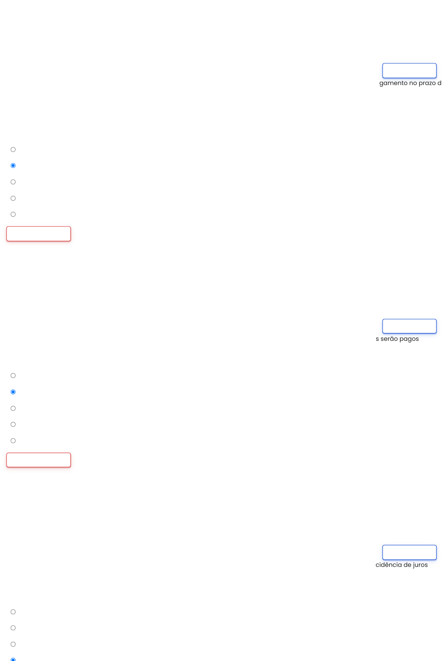 11/06/2023, 15:08 Questionário Online www.unipvirtual.com.br/avaunip/mod/quiz/attempt.php?attempt=1366566&cmid=102054 2/5 Uma sociedade empresária adquiriu, em 16.11.20X2, mercadorias de um fornecedor estrangeiro por US$ 100,000.00 para pagamento no prazo de 90 dias. A moeda funcional da entidade é o Real. A cotação do dólar era de R$ 2,25, em 16.11.20X2, e de R$ 2,42 em 31.12.20X2. Até o encerramento do balanço, as mercadorias permaneciam em estoque e o saldo de fornecedores permanecia em aberto. Considerando o que determina a NBC TG 02 – Efeitos das Mudanças nas Taxas de Câmbio e Conversão de Demonstrações Contábeis, em 31.12.20X2, os saldos de Estoque de Mercadorias e Fornecedores no Balanço Patrimonial eram, respectivamente: Escolha uma opção: a. R$ 225.000,00 e R$ 225.000,00. b. R$ 225.000,00 e R$ 242.000,00. c. R$ 242.000,00 e R$ 242.000,00. d. R$ 242.000,00 e R$ 225.000,00. e. R$ 0,00 e R$ 242.000,00. Limpar minha escolha Uma sociedade empresária obteve, em 01.09.20X1, um empréstimo de R$ 120.000,00, com juros simples de 12% a.a. Os juros serão pagos semestralmente. O valor registrado em despesas financeiras até 31.12.20X1 é de: Escolha uma opção: a. R$ 4.872,48. b. R$ 4.800,00. c. R$ 2.400,00. d. R$ 7.200,00. e. R$ 7.382,42. Limpar minha escolha Uma empresa obteve em 1º de julho um empréstimo de R$ 800.000,00 a ser pago integralmente após três meses, com incidência de juros compostos de 5% ao mês. Ao final do mês de agosto, a empresa apresentará o valor de despesa financeira acumulada referente a esse empréstimo no valor de: Escolha uma opção: a. R$ 800.000,00. b. R$ 0,00. c. R$ 80.000,00. d R$ 82 000 00 Marcar questão Questão 1 Ainda não respondida Vale 1,00 ponto(s). Marcar questão Questão 2 Ainda não respondida Vale 1,00 ponto(s). Marcar questão Questão 3 Ainda não respondida Vale 1,00 ponto(s). http://www.unipvirtual.com.br/avaunip/mod/quiz/attempt.php?attempt=1366566&cmid=102054 http://www.unipvirtual.com.br/avaunip/mod/quiz/attempt.php?attempt=1366566&cmid=102054 11/06/2023, 15:08 Questionário Online www.unipvirtual.com.br/avaunip/mod/quiz/attempt.php?attempt=1366566&cmid=102054 3/5 d. R$ 82.000,00. e. R$ 126.100,00. Limpar minha escolha De acordo com a NBC TG 2 – Efeitos das Mudanças nas Taxas de Câmbio e Conversão de Demonstrações Contábeis, na data de cada balanço, assinale a opção correta. Escolha uma opção: a. Todas as alternativas. b. Os itens monetários em moeda estrangeira devem ser convertidos usando-se a taxa de fechamento; e os itens não monetários que são mensurados ao custo histórico em uma moeda estrangeira devem ser convertidos, usando-se a taxa cambial da data de fechamento. c. Nenhuma das alternativas. d. Os itens monetários em moeda estrangeira devem ser convertidos usando-se a taxa de fechamento; e os itens não monetários que são mensurados ao custo histórico em uma moeda estrangeira devem ser convertidos, usando-se a taxa cambial da data da transação. e. Os itens monetários em moeda estrangeira devem ser convertidos usando-se a taxa da transação; e os itens não monetários que são mensurados ao custo histórico em uma moeda estrangeira devem ser convertidos, usando-se a taxa cambial da data de fechamento. Limpar minha escolha De acordo com a NBC TG Estrutura Conceitual, quando os gastos incorridos não proporcionarem a expectativa provável de geração de benefícios econômicos para a entidade além do período contábil corrente, o item será reconhecido como: Escolha uma opção: a. Patrimônio líquido. b. Intangível. c. Ativo. d. Despesa. e. Receita. Limpar minha escolha Qual é a conta utilizada para registro das variações existentes no processo de conversão de demonstrações contábeis? Escolha uma opção: a. Prejuízos acumulados. Marcar questão Questão 4 Ainda não respondida Vale 1,00 ponto(s). Marcar questão Questão 5 Ainda não respondida Vale 1,00 ponto(s). Marcar questão Questão 6 Ainda não respondida Vale 1,00 ponto(s). http://www.unipvirtual.com.br/avaunip/mod/quiz/attempt.php?attempt=1366566&cmid=102054 http://www.unipvirtual.com.br/avaunip/mod/quiz/attempt.php?attempt=1366566&cmid=102054 http://www.unipvirtual.com.br/avaunip/mod/quiz/attempt.php?attempt=1366566&cmid=102054 11/06/2023, 15:08 Questionário Online www.unipvirtual.com.br/avaunip/mod/quiz/attempt.php?attempt=1366566&cmid=102054 4/5 b. Ajuste acumulado de conversão. c. Patrimônio líquido. d. Variação cambial. e. Caixa e equivalentes de caixa. Limpar minha escolha Uma sociedade empresária não conseguiu liquidar uma duplicata dentro do prazo de vencimento e o fornecedor enviou a duplicata para cobrança em cartório. Foram cobrados juros simples à taxa de 1% ao mês, além de uma taxa de cobrança no valor de R$ 150,00. A duplicata venceu há 14 meses. O valor da duplicata era de R$ 12.000,00 na data de vencimento. Considerando os dados, o valor atualizado da duplicata, a ser pago no cartório, é de: Escolha uma opção: a. R$ 12.000,00. b. R$ 13.830,00. c. R$ 13.743,69. d. R$ 13.943,69. e. R$ 13.680,00. Limpar minha escolha De acordo com a NBC TG Estrutura Conceitual para Relatório Financeiro, para a informação contábil-financeira ser útil, ela precisa ter as seguintes características qualitativas fundamentais: Escolha uma opção: a. Verificabilidade e objetividade. b. Prudência e conservadorismo. c. Tempestividade e materialidade. d. Comparabilidade e valor justo. e. Relevância e representação fidedigna. Limpar minha escolha Qual dos itens abaixo não está no escopo do Pronunciamento Técnico CPC 02 – Efeitos das Mudanças nas Taxas de Câmbio e Conversão de Demonstrações Contábeis? Marcar questão Questão 7 Ainda não respondida Vale 1,00 ponto(s). Marcar questão Questão 8 Ainda não respondida Vale 1,00 ponto(s). Marcar questão Questão 9 Ainda não respondida Vale 1,00 ponto(s). http://www.unipvirtual.com.br/avaunip/mod/quiz/attempt.php?attempt=1366566&