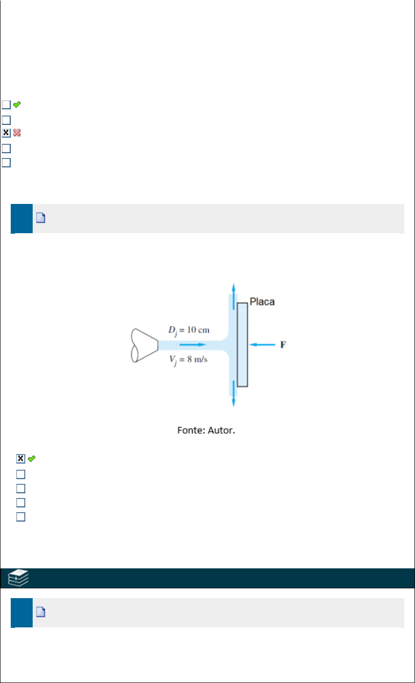 Uma tubulação de 6"6" de diâmetro conduz a uma velocidade de 0,6m/s0,6�/� óleo combustível à temperatura de 33ºC33º� e 1atm1���. Em relação ao nível de influência das forças viscosas, qual a classificação do escoamento? Dados do óleo combustível a 33ºC33º� e 1atm1���: µ=0,15mP(Milipoise)µ=0,15��(Milipoise); ρ=964kg/m3ρ=9 64��/�3. Turbulento Incompressível Laminar Permanente Transiente 2. Ref.: 5433753 Pontos: 1,00 / 1,00 O jato de água da figura abaixo atinge perpendicularmente uma placa. Qual é, aproximadamente, a intensidade da força necessária para manter a placa fixa? 500 N 64.000 N 0,4 N 60 N 100 N 4386 - PROPRIEDADE DOS FLUIDOS 3. Ref.: 7737454 Pontos: 0,00 / 1,00 (CESGRANRIO - 2010 - Adaptada). Os conceitos da mecânica dos fluidos são extremamente importantes em diversas aplicações de engenharia. Ser capaz de expressar fenômenos por meio de descrições quantitativas é fundamental. Nesse contexto, considere um sistema de aritmética em ponto flutuante que opere com 4 javascript:alert('C%C3%B3digo%20da%20quest%C3%A3o:%205433753.'); javascript:alert('C%C3%B3digo%20da%20quest%C3%A3o:%207737454.'); dígitos na mantissa na base 10 e expoente no intervalo [ -5, 5 ]. A soma do número 0,6673×104 com o número 0,2358×102, utilizando a regra do arredondamento, é igual a 6,700 X 103 0,6696 X 104 669,60 X 101 66,965 X 102 0,669658 X 104 4. Ref.: 7737438 Pontos: 0,00 / 1,00 (CESGRANRIO - 2010 - Adaptada). Os conceitos da mecânica dos fluidos são extremamente importantes em diversas aplicações de engenharia. Ser capaz de expressar fenômenos por meio de descrições quantitativas é fundamental. Nesse contexto, a respeito dos fluidos newtonianos e não newtonianos, verifica-se que o(s) fluido(s) não newtoniano tem, na viscosidade aparente, uma propriedade constante que identifica cada fluido. dilatantes mostram um aumento da viscosidade aparente com o tempo quando submetidos a uma tensão cisalhante constante. não newtonianos dilatante tem como exemplo o plástico de Bingham nos quais a viscosidade aparente decresce, conforme a taxa de deformação aumenta, são chamados de pseudoplásticos. reopéticos mostram um decréscimo da viscosidade aparente com o tempo quando submetidos a uma tensão cisalhante constante. 4387 - ESTÁTICA DOS FLUIDOS 5. Ref.: 7774511 Pontos: 0,00 / 1,00 (CESGRANRIO - 2011 - Adaptado). A Mecânica dos Fluidos é a ciência que estuda o comportamento físico dos fluidos, assim como as leis que regem esse comportamento, seja dinâmico ou estático. A figura apresenta uma comporta AB com 2 metros de largura e 3 metros de altura, que separa dois tanques de seções retangulares. O tanque à esquerda contém água (γágua=10 kN⁄m3), e o da direita, óleo (γóleo=8 kN⁄m3). javascript:alert('C%C3%B3digo%20da%20quest%C3%A3o:%207737438.'); javascript:alert('C%C3%B3digo%20da%20quest%C3%A3o:%207774511.'); Fonte: CESGRANRIO - Petrobras - 2011 - Engenheiro(a) Júnior Naval. Considere que a comporta pode girar em torno de A. Qual o módulo da força, em kN, a ser aplicada em B a fim de manter a composta na vertical? 120 88 100 69 30 6. Ref.: 7774554 Pontos: 0,00 / 1,00 (ÇENGEL-CIMBALA ¿ Mecânica dos fluidos - Fundamentos e aplicações ¿ 2008 ¿ Adaptado). A Mecânica dos Fluidos é a ciência que estuda o comportamento físico dos fluidos, assim como as leis que regem esse comportamento, seja dinâmico ou estático.Considere a comporta articulada em A, na forma de um quarto de círculo com peso desprezível, largura w=4,0 m e raio R=3,0 m. Uma mola em B mantém a comporta fechada. Fonte: ÇENGEL, Y. A.; CIMBALA, J. M. Mecânica dos fluidos - Fundamentos e aplicações: 3 ed. Porto Alegre: AMGH, 2015. p. 120. A componente vertical da força resultante que a água, com peso específico γ=10kNm3, exerce sobre a comporta é igual, aproximadamente, a; 77 KN. 83 KN. 95 KN. 110 KN. 150 KN. javascript:alert('C%C3%B3digo%20da%20quest%C3%A3o:%207774554.'); 4389 - EQUAÇÕES DIFERENCIAIS DE MOVIMENTO DE FLUIDOS 7. Ref.: 7797590 Pontos: 0,00 / 1,00 (Fonte: COPEL/UFPR, Companhia Paraense de Energia. Processo seletivo público, aplicado em 09/10/2011, para o cargo de Engenheiro Químico Júnior) A equação mostrada a seguir é conhecida como equação de Navier-Stokes, na notação usual. p(∂u∂t+u∂u∂x+v∂u∂y+w∂u∂z)=pgx − ∂p∂x + μ(∂2u∂x2+∂u∂y2+∂2u∂z2)�(∂�∂�+�∂�∂�+�∂�∂�+ �∂�∂�)=��� − ∂�∂� + �(∂2�∂�2+∂�∂�2+∂2�∂�2) Acerca dessa equação, considere as seguintes afirmativas: 1. A equação pode ser aplicada ao escoamento de um fluido para determinar a componente x do campo de velocidades. 2. A equação pode ser obtida a partir do balanço diferencial da quantidade de movimento, em coordenadas retangulares, para um elemento de fluido. 3. A equação aplica-se exclusivamente para fluidos Newtonianos e incompressíveis, com viscosidade constante. 4. É uma equação vetorial e o termo à esquerda do sinal de igualdade pode ser interpretado como a derivada substantiva da componente u da velocidade, multiplicada pela massa específica do fluido. Assinale a opção correta. Somente as afirmativas 1 e 4 são verdadeiras. Somente as afirmativas 3 e 4 são verdadeiras. Somente as afirmativas 1 e 2 são verdadeiras. Somente as afirmativas 2, 3 e 4 são verdadeiras. Somente as afirmativas 1, 2 e 3 são verdadeiras. 8. Ref.: 7797386 Pontos: 0,00 / 1,00 (Fonte: Fundação CESGRANRIO, Petrobras Transporte S.A.. Processo seletivo público, aplicado em 08/02/2018, para o cargo de Engenheiro(a) Júnior - Mecânica) A equação de Navier-Stokes para um escoamento na direção x do sistema cartesiano é dada por: ρ(∂u∂t+u∂u∂xv∂u∂yW∂u∂z) = − ∂ρ∂x + pgx + μ (∂2u∂x2 + ∂2u∂y2 + ∂2u∂z2)�(∂�∂�+�∂�∂��∂�∂ ��∂�∂�) = − ∂�∂� + ��� + μ (∂
