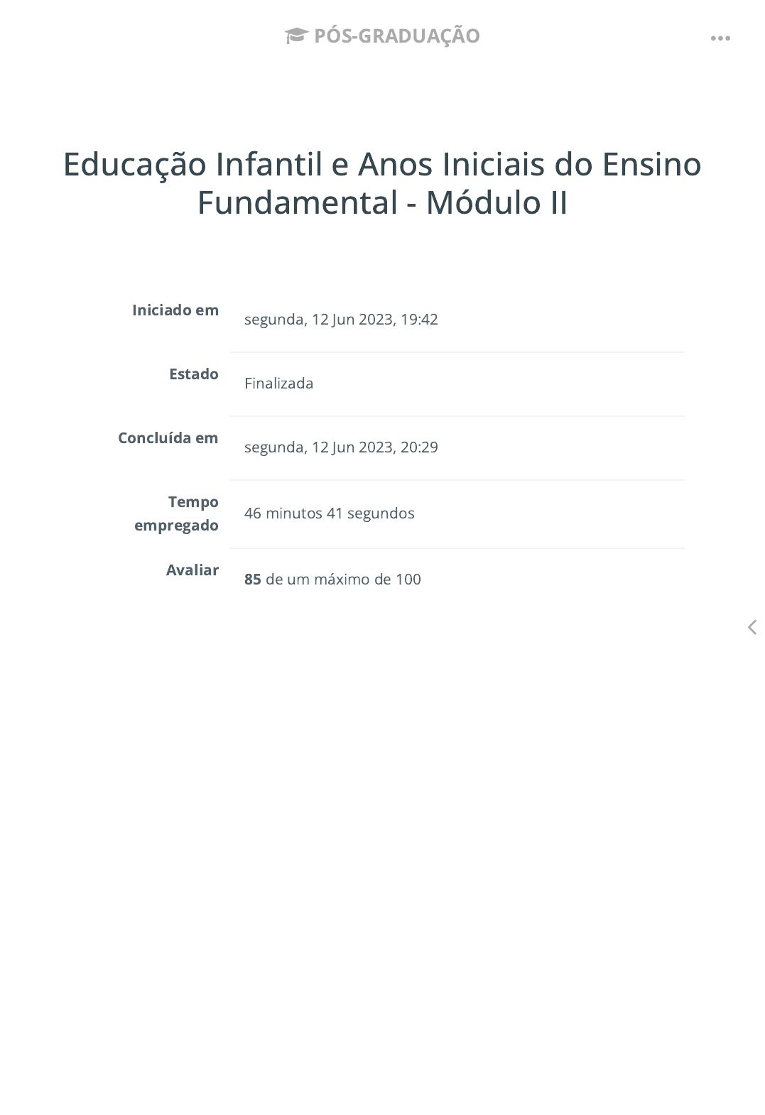 12/06/2023, 20:29 ATIVIDADE AVALIATIVA 4 https://www.portalitec.com.br/sala/pos-graduacao/mod/quiz/review.php?attempt=40506 1/19 Educação Infantil e Anos Iniciais do Ensino Fundamental - Módulo II Iniciado em segunda, 12 Jun 2023, 19:42 Estado Finalizada Concluída em segunda, 12 Jun 2023, 20:29 Tempo empregado 46 minutos 41 segundos Avaliar 85 de um máximo de 100 PÓS-GRADUAÇÃO https://www.portalitec.com.br/sala/pos-graduacao 12/06/2023, 20:29 ATIVIDADE AVALIATIVA 4 https://www.portalitec.com.br/sala/pos-graduacao/mod/quiz/review.php?attempt=40506 2/19 Questão 1 Correto Atingiu 6 de 6 As funções da avaliação para a aprendizagem voltada para o domínio do conhecimento para a vida são, EXCETO: Escolha uma: Sua resposta está correta. A resposta correta é: Função representativa.. a. Função formativa. b. Função representativa. c. Função somativa. d. Função diagnóstica. PÓS-GRADUAÇÃO https://www.portalitec.com.br/sala/pos-graduacao 12/06/2023, 20:29 ATIVIDADE AVALIATIVA 4 https://www.portalitec.com.br/sala/pos-graduacao/mod/quiz/review.php?attempt=40506 3/19 Questão 2 Correto Atingiu 6 de 6 Maria Helena, professora do 4º ano de uma Escola Municipal, com o objetivo de obter informações sobre os conhecimentos, aptidões e competências dos seus alunos e identi�car a realidade da turma observando se as crianças apresentam ou não habilidades e pré- requisitos para os processos de ensino e aprendizagem deve utilizar a avaliação: Escolha uma: Sua resposta está correta. A resposta correta é: Diagnóstica.. a. Seletiva. b. Somatória. c. Diagnóstica. d. Classi�catória. PÓS-GRADUAÇÃO https://www.portalitec.com.br/sala/pos-graduacao 12/06/2023, 20:29 ATIVIDADE AVALIATIVA 4 https://www.portalitec.com.br/sala/pos-graduacao/mod/quiz/review.php?attempt=40506 4/19 Questão 3 Incorreto Atingiu 0 de 6 A avaliação somativa confere resultados já obtidos por avaliações do tipo formativo e aponta indicadores que permitem o aperfeiçoamento do processo de ensino, mostrando assim o progresso do aluno ao �nal do estudo de uma unidade. Segundo os estudos essa avaliação tem como objetivos: I. Classi�car, segundo os níveis de aproveitamento: curso, unidade, semestre, ano. II. Fundamentar decisões de seleção ou de orientação em função da aptidão presumida para seguir uma nova formação. III. Informar o rendimento de aprendizagem. IV. Permitir o replanejamento. Escolha uma: Sua resposta está incorreta. A resposta correta é: As alternativas III, IV, estão incorretas.. a. As alternativas III, IV, estão incorretas. b. As alternativas I, II, III, estão incorretas. c. As alternativas II, IV, estão incorretas. d. As alternativas I, IV, estão incorretas. PÓS-GRADUAÇÃO https://www.portalitec.com.br/sala/pos-graduacao 12/06/2023, 20:29 ATIVIDADE AVALIATIVA 4 https://www.portalitec.com.br/sala/pos-graduacao/mod/quiz/review.php?attempt=40506 5/19 Questão 4 Correto Atingiu 6 de 6 A avaliação da aprendizagem precisa ser coerente com a forma de ensinar. São princípios que sustentam a concepção de aprendizagem, segundo Moretto (2005): I. Os indicadores (palavras, gestos, �guras, textos) são interpretados pelo professor e essa interpretação corresponde �elmente ao que o aluno pensa. II. A aprendizagem é um processo interior ao aluno, ao qual temos acesso por meio de indicadores externos. III. O conhecimento é um conjunto de relações estabelecidas entre os componentes de um universo simbólico. IV. O conhecimento construído signi�cativamente é estável e estruturado. Estão corretas apenas as a�rmativas Está CORRETO o que se a�rma em: Escolha uma: Sua resposta está correta. A resposta correta é: II, III e IV apenas.. a. I e II apenas. b. I e III apenas. c. II e IV apenas. d. II, III e IV apenas. PÓS-GRADUAÇÃO https://www.portalitec.com.br/sala/pos-graduacao 12/06/2023, 20:29 ATIVIDADE AVALIATIVA 4 https://www.portalitec.com.br/sala/pos-graduacao/mod/quiz/review.php?attempt=40506 6/19 Questão 5 Parcialmente correto Atingiu 4 de 6 A avaliação da aprendizagem é uma atividade inerente ao processo educativo e não pode ser praticada isoladamente, sob o risco de perder a sua dimensão pedagógica. Assim, a �m de cumprir a sua dimensão pedagógica, a avaliação apresenta modalidades que estão intimamente relacionadas às suas �nalidades. São três as modalidades presentes nos processos de ensino e de aprendizagem: Diagnóstica, Formativa ou Somativa. O critério que distingue, basicamente, uma da outra é o lugar que a avaliação ocupa em relação à ação docente. Analise as a�rmativas e as julgue escolhendo VERDADEIRA ou FALSA. A Avaliação Formativa auxilia o professor na regulação dos processos de ensino e de aprendizagens, informando o que deve ser feito. A Avaliação Diagnóstica precede a ação, identi�cando características do aluno e conhecimentos prévios. A Avaliação Somativa é utilizada ao longo do processo pedagógico para acompanhamento do desenvolvimento, reorientando a aprendizagem. A Avaliação Diagnóstica leva a processos de exclusão e classi�cação no �nal de cada unidade de ensino em que se organiza o processo educativo. A Avaliação Formativa é utilizada para uma apresentação �nal sobre o que o aluno pode obter em um determinado período. FALSA VERDAD VERDAD FALSA FALSA PÓS-GRADUAÇÃO https://www.portalitec.com.br/sala/pos-graduacao 12/06/2023, 20:29 ATIVIDADE AVALIATIVA 4 https://www.portalitec.com.br/sala/pos-graduacao/mod/quiz/review.php?attempt=40506 7/19 Sua resposta está parcialmente correta. Você selecionou corretamente 3. A resposta correta é: A Avaliação Formativa auxilia o professor na regulação dos processos de ensino e de aprendizagens, informando o que deve ser feito. → VERDADEIRA, A Avaliação Diagnóstica precede a ação, identi�cando características do aluno e conhecimentos prévios. → VERDADEIRA, A Avaliação Somativa é utilizada ao longo