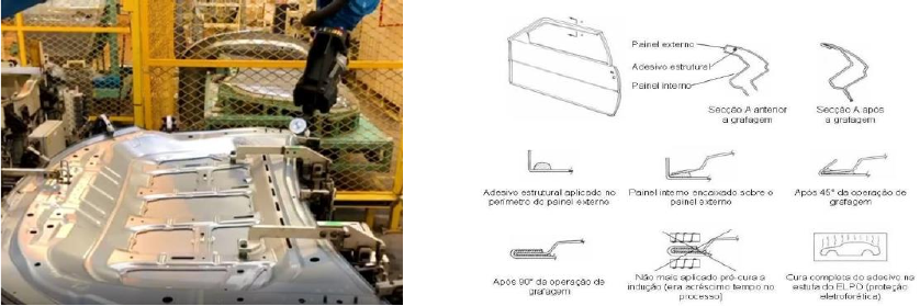 NOME: JEFERSON ROCHA LIMA RA: FO3ICI3 TURMA: EM8P13 NOME: VINICIUS GONÇALVES MACHADO RA:D8969J4 TURMA:EM9P13 COMPLEMENTOS DE PROCESSOS DE FABRICAÇÃO Avaliação para NP1 Processo de grafagem em chapa •CONCEITO: A grafagem em chapa é um processo pelo qual a borda externa de uma chapa metálica é dobrada em torno de uma borda interna. A grafagem robotizada é um processo relativamente novo que combina produtividade, qualidade e baixo investimento. Imagens 1 e 2: Processos de grafagem em chapas. •APLICAÇÃO: O processo de grafagem é largamente utilizado na fabricação de automóveis, cujo objetivo é unir, por meio de conformação mecânica, a parte na qual os painéis de chapa metálicos são posicionados na face externa com os painéis de chapa metálica, que são posicionados na face interna, como se observa em portas de veículos, capôs e tampa do porta-malas. •VANTAGENS: -Unir matérias difíceis de soldar e materiais dissimilares. -Não emite fumaça, geração de calor, baixa emissão de calor, baixo consumo de energia. -Mínimo de distorção geométrica. Processo de clinching em chapa •CONCEITO: O processo de clinching em chapa consiste em unir chapas por meio da deformação plástica local sem uso de nenhum elemento adicional de união, apenas por meio da ação de um punção que deforma as placas contra uma matriz provocando o entrosamento entre elas. Imagem 3: Processo de clinching em chapa. •APLICAÇÃO: O processo de clinching em chapa é muito usado na indústria metal mecânica em geral, é muito comum a necessidade de unir componentes feitos de chapas metálicas. O setor automotivo, por exemplo, tem a necessidade de unir componentes feitos de chapas para montar a Carroceria de veículos. O setor aeronáutico tem a necessidade de unir chapas, principalmente de alumínio, na montagem das aeronaves. Na linha branca, há necessidade de unir chapas de aço de baixo carbono que compõe eletrodomésticos dos mais variados, além de outros setores como de estruturas metálicas, embalagens e outros diversos. •VANTAGENS: O clinching em chapas tem como vantagens não requerer nenhum elemento de união adicional( tais como rebites e parafusos)e não produzir gases nocivos na etapa de obtenção da junta. Processo de solda por difusão •CONCEITO: A soldagem por difusão é um processo que liga materiais por meio de aplicação simultânea de pressão e calor. Quando ocorre deformação plástica por ação de calor, as camadas de átomos que compõem a estrutura cristalina do metal vibram e se movimentam em várias direções, ocupando lugares diferentes nos planos cristalinos; a essa movimentação dá-se o nome de difusão. Uma temperatura definida é aplicada na região de soldagem ou em toda a peça, durante certo tempo, resultando em uma deformação plástica localizada. O contato entre as superfícies provoca difusão dos átomos, que se movimentam pelo interior das superfícies, promovendo a ligação perfeita das partes. Imagem 4: Processo de solda por difusão. •APLICAÇÃO: A soldagem por difusão é aplicada preferencialmente nas situações em que a união por processos de soldagem convencionais, notadamente os processos por fusão a arco elétrico, não é possível. Como exemplos, podem-se destacar a soldagem de secções transversais com revestimentos anticorrosivos e a união de materiais diferentes e metalurgicamente incompatíveis, como o aço e o alumínio. A soldagem por difusão confere alta qualidade à junta, podendo alcançar valores de resistência mecânica semelhantes aos do material de base. •VANTAGENS: - Não modificar o estado do material. - Montagens de grandes superfícies. - Menores deformações quando comparados a solda por fusão. - Montagens complexas, próximo ao estágio final. - Juntas múltiplas em uma só operação. - União de metais e materiais considerados não soldáveis ou de difícil Soldabilidade por fusão ( cerâmicas, ligas refratárias). - União de metais dissimilares sob o aspecto metalúrgico ( Aços austeníticos com liga de alumínio ). - O custo do investimento inicial e a não aplicação para produção em grande escala São fatores importantes quanto a limitações. Processo de ruptura por fluência CONCEITO: O fenômeno da fluência, por ser um fenômeno termicamente ativado, pode ser definido como um processo dependente do tempo pelos quais metais e ligas tendem a sofrer deformação plástica progressiva, lenta e gradual quando submetidos a ação prolongada de tensão constante e temperatura. Esse fenômeno ocorre como resultado, principalmente, do movimento termicamente ativado de discordâncias, escorregamento de contornos de grãos e transporte de átomos por difusão. Uma vez que a difusão dos átomos cresce exponencialmente com a temperatura, tem-se que os processos controlados por difusão exerçam um efeito significativo sobre as propriedades mecânicas a altas temperaturas dos materiais metálicos. Imagem 4 : Processo de ruptura por fluência. •APLICAÇÃO: A seleção e o emprego de materiais para serviços sob tensão e temperaturas elevadas Envolvem diversos problemas e, portanto o estudo dos mecanismos de deformação Plástica por fluência se torna extremamente desejável. Os aços ferríticos vêm sendo Extensivamente usados na indústria, em componentes críticos de plantas Petroquímicas e de geração de energia devido principalmente à sua elevada resistência à fluência. •VANTAGENS: -Turbinas a vapor e aeronáutica. -Vasos de pressão em sistemas geradores de energia. - Outros exemplos: filamento de lâmpadas, o relaxamento dos Aros das armações oculares e deformação em tubos de Plástico. REFERÊNCIAS BIBLIOGRAFICAS: www.infosolda.com.br/download/61dep.pdf www.demec.ufpr.br http://www.infosolda.com.br/download/61dep.pdf http://www.demec.ufpr.br/ www.respondeai.com.br www.autoform.com.br http://www.respondeai.com.br/ http://www.autoform.com.br/