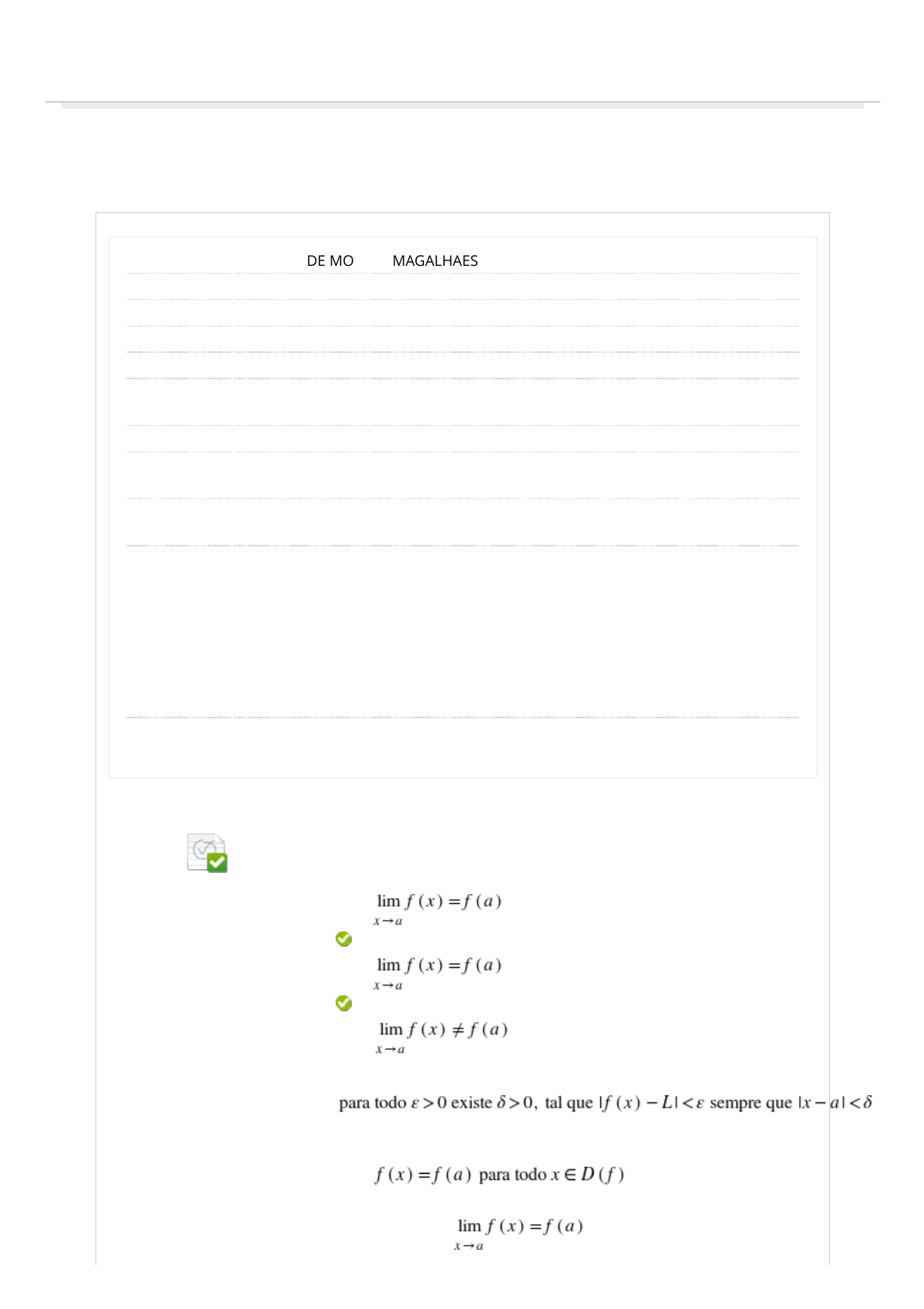 09/05/2022 18:56 Revisar envio do teste: Semana 1 - Atividade Avaliativa &ndash... https://ava.univesp.br/ultra/courses/_5891_1/cl/outline 1/3 Revisar envio do teste: Semana 1 - Atividade AvaliativaCálculo I - MCA501 - Turma 001 Atividades Revisar envio do teste: Semana 1 - Atividade Avaliativa Usuário ROGERIO DE MORAES MAGALHAES Curso Cálculo I - MCA501 - Turma 001 Teste Semana 1 - Atividade Avaliativa Iniciado 09/05/22 18:33 Enviado 09/05/22 18:55 Data de vencimento 30/06/22 23:59 Status Completada Resultado da tentativa 10 em 10 pontos Tempo decorrido 22 minutos Instruções Resultados exibidos Todas as respostas, Respostas enviadas, Respostas corretas, Comentários, Perguntas respondidas incorretamente 1. Para responder a esta atividade, selecione a(s) alternativa(s) que você considerar correta(s); 2. Após selecionar a resposta correta em todas as questões, vá até o fim da página e pressione “Enviar teste”. 3. A cada tentativa, as perguntas e alternativas são embaralhadas Olá, estudante! Pronto! Sua atividade já está registrada no AVA. Pergunta 1 Resposta Selecionada: a. Respostas: a. b. c. d. e. Comentário da resposta: Com relação à definição do conceito de continuidade de uma função, dizemos que uma função 𝑓(𝑥) é dita contínua em um ponto 𝑎 do seu domínio quando: Nenhuma das demais alternativas está correta. Por definição, 𝑓(𝑥) é dita contínua em um ponto 𝑎 do seu domínio se, e somente se, 2,5 em 2,5 pontos https://ava.univesp.br/webapps/blackboard/execute/courseMain?course_id=_5891_1 https://ava.univesp.br/webapps/blackboard/content/listContent.jsp?course_id=_5891_1&content_id=_808977_1&mode=reset 09/05/2022 18:56 Revisar envio do teste: Semana 1 - Atividade Avaliativa &ndash... https://ava.univesp.br/ultra/courses/_5891_1/cl/outline 2/3 Pergunta 2 Resposta Selecionada: a. Respostas: a. b. c. d. e. Comentário da resposta: Considere a função Qual o limite da função 𝑓(𝑥) para 𝑥 tendendo a 1 ? Nenhuma das demais alternativas está correta. Note que 𝑥2 − 3𝑥 + 2 é um polinômio de grau 2 com raízes 1 e 2. Assim, podemos escrever 𝑥2 − 3𝑥 + 2 = (𝑥 − 1)(𝑥 − 2). Logo, ao simplificar a função 𝑓(𝑥), 𝑥 − 2. Portanto, . Pergunta 3 Resposta Selecionada: c. Respostas: a. b. c. d. e. Comentário da resposta: Considere a função 𝑓(𝑥) = . Identifique o domínio 𝐷(𝑓) e a imagem 𝐼𝑚(𝑓) da função 𝑓. A função 𝑓(𝑥) está bem definida para quaisquer valores de 𝑥, com excessão de 𝑥 = 1, pois, neste caso, teríamos uma divisão por 0, logo, 𝐷(𝑓) = ℝ − {1}. Note que 𝐼𝑚(𝑓) = ℝ − {1}, pois a equação 𝑓(𝑥) = 𝑦 admite solução em 𝑥 para quaisquer valores reais de 𝑦, com excessão de 𝑦 = 1. 2,5 em 2,5 pontos 2,5 em 2,5 pontos 09/05/2022 18:56 Revisar envio do teste: Semana 1 - Atividade Avaliativa &ndash... https://ava.univesp.br/ultra/courses/_5891_1/cl/outline 3/3 Segunda-feira, 9 de Maio de 2022 18h55min52s BRT Pergunta 4 Resposta Selecionada: a. Respostas: a. b. c. d. e. Comentário da resposta: Considere a função . Identifique o domínio 𝐷(𝑓) e a imagem 𝐼𝑚(𝑓) da função 𝑓. Da definição da função logaritmo, segue que a função 𝑓(𝑥) está bem definida para os valores de 𝑥, tais que 𝑥2 − 1 > 0, portanto, 𝐷(𝑓) = {𝑥 ∈ ℝ: 𝑥 < 1ou𝑥 > 1}. Para identificarmos o conjunto 𝐼𝑚(𝑓), devemos analisar para quais valores de 𝑦 a equação 𝑓(𝑥) = 𝑦 admite soluções em 𝑥. Assim, da definição da função logaritmo, temos que 𝑙𝑜𝑔2 (𝑥 2 − 1) = 𝑦 ⇔ 𝑥 2 − 1 = 2 y ⇔ 𝑥 2 = 1 + 2y ⇔ 𝑥 = ± , os quais são reais, pois 1 + 2y > 0 para todo 𝑦 ∈ ℝ. Portanto, 𝐼𝑚(𝑓) = ℝ . ← OK 2,5 em 2,5 pontos