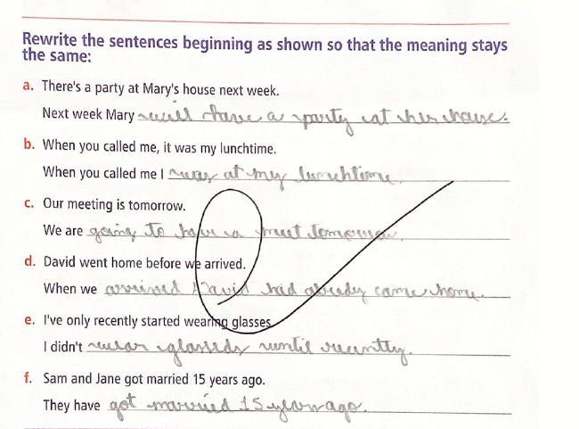 Rewrite the sentences beginning as shown so that the meaning stays the same: a. There's a party at Mary's house next week. Next week Mary will have a at b. When you called me, it was my lunchtime. When you called me I at my C. Our meeting is tomorrow. We are going to d. David went home before we arrived. When we arrived had already came e. I've only recently started wearing glasses I didn't f. Sam and Jane got married 15 years ago. They have got married 15 a. Next week Mary will have a party at her house. b. When you called me I was at my lunchtime. c. We are going to have our meeting tomorrow. d. When we arrived, David had already gone home. e. I didn't start wearing glasses until recently. f. They have been married for 15 years.