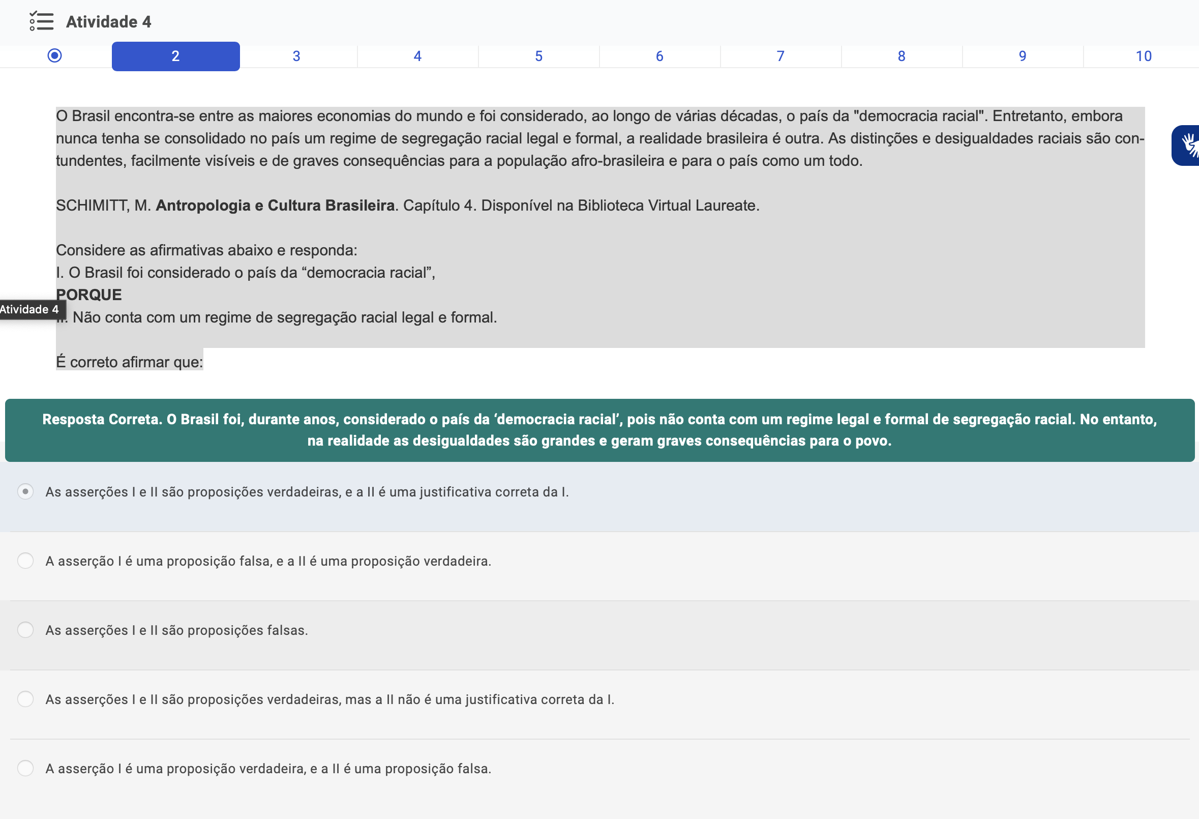 I. Brasil foi considerado o país da 'democracia racial', PORQUE Não conta com um regime de segregação racial legal e formal. A asserção é uma proposição verdadeira, e a II é uma justificativa correta da I. A asserção é uma proposição falsa, e a II é uma proposição verdadeira. As asserções I e II são proposições falsas. As asserções I e II são proposições verdadeiras, mas a II não é uma justificativa correta da I. A asserção é uma proposição verdadeira, e a II é uma proposição falsa.