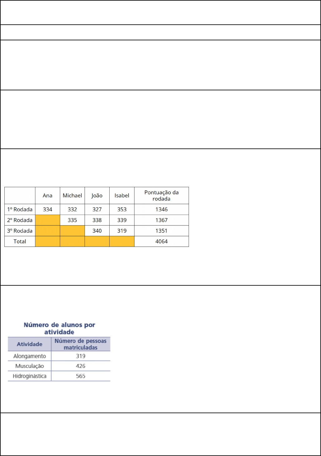 EEB Emílio G Médici - Componente Curricular Matemática - Professora Lilian Zanella Estudante(s): ______________________________________________________________________ Lista de Exercícios - Adição e Subtração com Números Naturais 1 - Em um galpão cabem, aproximadamente, 5.000 caixas de um produto de limpeza. Diariamente, são retiradas, logo pela manhã, 1 500 dessas caixas para distribuição em supermercados. Ao final do dia de ontem havia 3.950 caixas nesse galpão. Hoje à tarde chegarão mais 2.000. Estas caixas caberão todas no galpão? Com quantas caixas ele ficará ao todo? Explique sua resposta 2 - Luiz está juntando dinheiro para comprar seu carro, que custa R$40.000 na versão com o pacote básico de itens, R$43.000 no pacote de tecnologia e R$47.000 no pacote completo. Sabe-se que se ele pagar o carro à vista, receberá um desconto de R$1.000 em qualquer um dos pacotes. Atualmente, ele possui R$38.000 em sua conta e pretende depositar nela um valor de R$: 5.500, quais modelos de carro Luiz poderá comprar? Escreva como você conseguiu chegar a uma resposta. 3 - Em um jogo de corrida na casa de Isabel, seus colegas Ana, Michael e João resolveram anotar, a cada rodada, suas pontuações individuais e também a soma de todas as pontuações. Ao finalizar todas as rodadas de jogo, todos decidiram fazer um lanche, quando, sem querer, Ana derramou seu suco em cima da tabela, deixando-a da seguinte forma: Ana conseguiu lembrar que fez 25 pontos a mais que Isabel na terceira rodada e Michael lembrou que fez 10 pontos a mais que João no total. Como esses colegas poderiam fazer para descobrir quem fez mais pontos ao todo? 4 - Uma academia de ginástica oferece três opções de atividades físicas aos seus alunos. Considerando que cada pessoa pode fazer uma única opção, e que os alunos estão organizados conforme tabela abaixo, responda: a) Quantas pessoas estão matriculadas nessa academia? b) Qual a diferença entre a quantidade de pessoas na modalidade que têm mais matriculado, para que têm menos matriculado? 5 - Hidrômetro é um aparelho semelhante a um relógio: marca o consumo de água de uma casa. A leitura de um hidrômetro em 20 de março indicava 2568 uma nova leitura, feita um mês depois, indicava 2727. Qual foi o consumo de água desta casa, nesse período? Exercícios - Adição e Subtração com Números Naturais 1 - João está construindo um castelo de areia. Toda manhã a altura do castelo aumenta em 10 centímetros. Entretanto, durante a noite o vento leva a areia e reduz a altura em 2 centímetros. Após 3 dias completos, qual será a altura do castelo? 2 - A soma de dois números é 75. Se um deles é 31, qual é o outro? 3 - Qual a soma de todos os números de três algarismos que podem ser formados com os algarismos 1, 5 e 6? 4 - Telma comprou uma boneca, usando 50 reais. Se o troco foi 13 reais, quanto custou a boneca? 5 - Jonas nasceu em 1992. Quantos anos tinha em 2011? 6 - Numa escola havia 436 meninos e 328 meninas. No final do ano, 87 alunos saíram da escola e entraram 59 novos alunos. Quantos alunos há na escola? 7 - Bia saiu de casa com 5 notas de 10 reais, 2 notas de 2 reais e 3 moedas de 1 real. Gastou 35 reais. a) Com que quantia Bia ficou? b) Como Bia pode pagar a conta, sem receber troco? Diga todas as maneiras possíveis. 8 - Minha família é muito grande. Somos 7 filhos. Minha irmã mais velha tem 2 filhos e 5 netos, minha segunda irmã também tem 2 filhos e 5 netos, meu terceiro irmão tem 2 filhos e 3 netos, minha quarta irmã tem 1 filho e nenhum neto, meu quinto irmão tem 3 filhos e 4 netos, eu tenho 2 filhos e 2 netas e minha irmã mais nova tem 3 filhos e nenhum neto. Quantos netos tem minha mãe? E quantos bisnetos? 9 - Havia 35.876 espectadores quando um jogo de futebol acabou. No intervalo, 1.056 torcedores haviam saído do estádio, porque o time deles estava perdendo. Quantos espectadores estavam no estádio quando o jogo começou? 10 - Hoje, Álvaro tem que pagar suas contas. Foi ao banco e pagou R$123,00 de conta de água, R$251,00 de conta de luz e R$570,00 de cartão de crédito. Lembrou que tinha que comprar um presente, passou em uma loja e comprou um buquê de flores de R$158,00. Quanto Álvaro gastou nesse dia? 11 - Paula possuía 423 figurinhas no seu álbum. Hoje, ela colou 128 figurinhas, mas ainda faltam 93 figurinhas para completar o álbum. O álbum completo possui quantas figurinhas? 12 - Fernando tem 48 anos e a diferença entre a idade de Fernando e a de Thais, sua filha, é de 29 anos. Qual a idade de Thaís? EEB Emílio G Médici - Componente Curricular Matemática - Professora Lilian Zanella Estudante(s): ______________________________________________________________________ Atividade Avaliativa - Adição e Subtração com Números Naturais 1 - À vista, o preço de um automóvel é de 26.454 reais. A prazo, o mesmo automóvel custa 38.392 reais. A diferença entre os preços cobrados é chamada juros. Nessas condições, se você comprar o automóvel a prazo, quanto pagará de juros? 2 - Em um colégio, onde estudam 3015 alunos, foram realizadas uma Gincana Cultural e uma Gincana Esportiva. Cada aluno pôde participar de apenas um dos eventos. Se 1809 alunos participaram da Gincana Esportiva, quantos participaram da Gincana Cultural? 3 - Numa eleição para prefeito de uma cidade, concorreram dois candidatos: O vencedor obteve 15.627 votos. O outro obteve 10.969 votos. Entre brancos e nulos, foram 2.374 votos. Quantos eleitores votaram nessa eleição? 4 - Seu Joaquim comprou uma pequena propriedade rural, comprometendo-se a pagá-la em três parcelas mensais: a primeira parcela de 15.000 reais; a segunda parcela de 4.000 reais a mais que a primeira; a terceira parcela igual a soma das duas primeiras. Quanto custou a propriedade? 5 - O desenho a seguir mostra o trajeto percorrido por Nilson e Sérgio que saem juntos do mesmo ponto A para o ponto D. Nilson vai de A até B , de B até C e em 