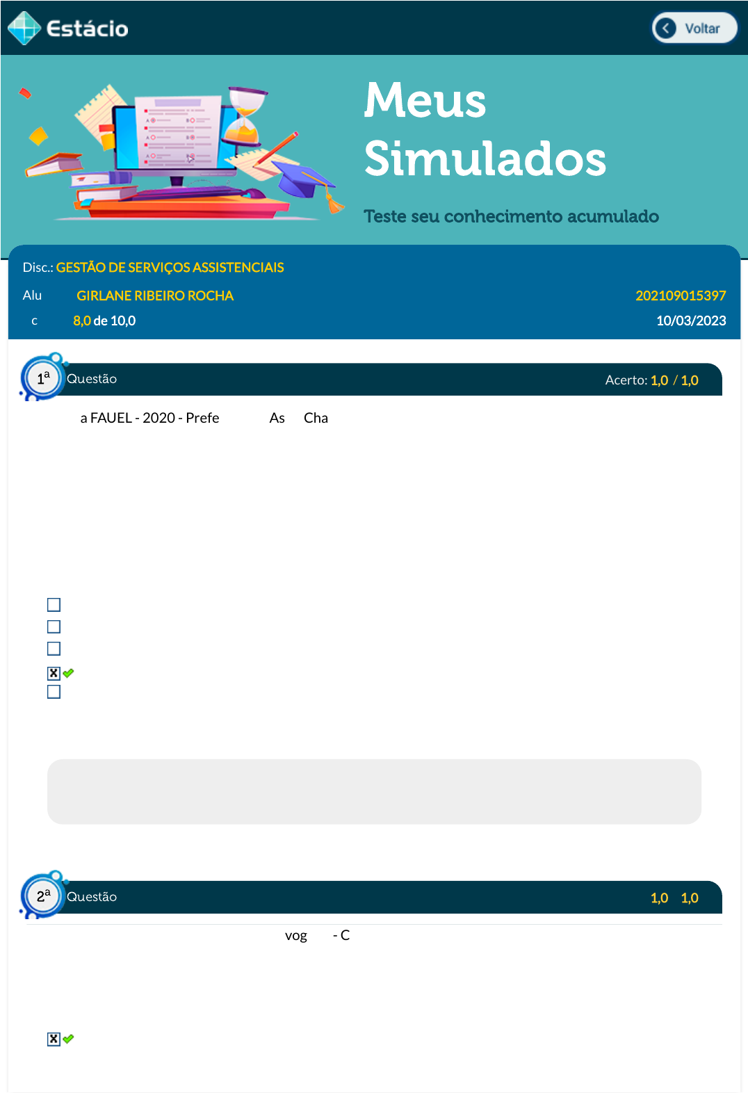 13/06/2023, 21:03 Estácio: Alunos https://simulado.estacio.br/alunos/ 1/5 Meus Simulados Teste seu conhecimento acumulado Disc.: GESTÃO DE SERVIÇOS ASSISTENCIAIS Aluno(a): GIRLANE RIBEIRO ROCHA 202109015397 Acertos: 8,0 de 10,0 10/03/2023 Acerto: 1,0 / 1,0 (Prova FAUEL - 2020 - Prefeitura de Assis Chateaubriand/PR - Técnico - Enfermagem O Sistema Único de Saúde (SUS) deve ter a mesma doutrina e a mesma forma de organização em todo o país. Mas é preciso compreender bem essa ideia de unicidade. Em um país com tamanha diversidade cultural, econômica e social como o Brasil, pensar em organizar um sistema sem levar em conta essas diferenças seria uma temeridade. O que é de�nido como único na Constituição é um conjunto de elementos doutrinários e de organização do SUS. Esses elementos se relacionam com as peculiaridades e determinações locais. O SUS pode, então, ser entendido a partir da seguinte imagem: um núcleo comum (único), que concentra os princípios doutrinários, e uma forma de organização e operacionalização, os princípios organizativos. Assinale a alternativa que contempla os princípios doutrinários do SUS: Integralidade, promoção da saúde, prevenção de doença Regionalização, igualdade social, participação social Equidade e participação social Universalidade, integralidade, equidade Equidade, participação Social, descentralização e comando único Respondido em 10/03/2023 00:34:20 Explicação: A resposta certa é:Universalidade, integralidade, equidade Acerto: 1,0 / 1,0 (Provas VUNESP - 2020 - EBSERH - Advogado - Conhecimentos Básicos) O Sistema Único de Saúde (SUS) é uma conquista da sociedade e foi criado para promover a justiça social e superar as desigualdades na assistência à saúde da população. Assinale a alternativa correta: A Constituição de 1988 assegurou a saúde como direito de todos e dever do Estado, garantido mediante políticas sociais e econômicas. Questão1 a Questão2 a https://simulado.estacio.br/alunos/inicio.asp javascript:voltar(); 13/06/2023, 21:03 Estácio: Alunos https://simulado.estacio.br/alunos/ 2/5 O SUS, quando foi criado, tinha como principal característica ser centralizado e de responsabilidade federal, sem a participação dos usuários. O Ministério da Saúde, criado nos primórdios da história da saúde pública brasileira, em 1808, tinha como responsabilidade a organização e a elaboração de planos e políticas públicas voltadas à promoção, prevenção e assistência à saúde dos brasileiros. Antes de 1988, o sistema público de saúde atendia apenas quem não contribuía para a Previdência Social. A 8ª Conferência Nacional de Saúde, realizada em 1988, foi um marco da reforma sanitária, que tratou da saúde como direito, da reformulação do sistema nacional de saúde e do �nanciamento setorial. Respondido em 10/03/2023 00:35:14 Explicação: A resposta certa é: A Constituição de 1988 assegurou a saúde como direito de todos e dever do Estado, garantido mediante políticas sociais e econômicas. Acerto: 1,0 / 1,0 As três características estruturantes da gestão são: foco na pessoa e usuário, sensibilidade e dinamismo. Marque a opção correta que descreve a sensibilidade. O trabalho está focado na produção de serviços de saúde. Serve para que não haja comodidade. Trabalho da gestão deve estar concentrado nas pessoas e coletividades. É fundamental para possibilitar uma boa leitura das necessidades e dos problemas a serem enfrentados. Possibilita um trabalho dinâmico o su�ciente para se adequar às necessidades das pessoas e territórios. Respondido em 10/03/2023 00:26:06 Explicação: A resposta certa é: É fundamental para possibilitar uma boa leitura das necessidades e dos problemas a serem enfrentados. Acerto: 1,0 / 1,0 São desa�os ou aspectos di�cultadores para a assistência, exceto a área física inadequada. a alta rotatividade dos pro�ssionais. a gestão de risco estrutura. o processo de gestão de pessoas mal de�nidos. a de�ciência nos processos de trabalho. Respondido em 10/03/2023 00:26:42 Explicação: Questão3 a Questão4 a 13/06/2023, 21:03 Estácio: Alunos https://simulado.estacio.br/alunos/ 3/5 A resposta certa é: a gestão de risco estrutura. Acerto: 1,0 / 1,0 As redes de atenção à saúde são arranjos organizativos formados por ações e serviços de saúde. Dentre as alternativas qual não compreende uma �nalidade da RAS? Expandir o acesso da população. Garantir a articulação e integração dos pontos de atenção. Acompanhamento regular e assistência aos casos com menor gravidade. Priorizar o acolhimento. Promover o vínculo da equipe. Respondido em 10/03/2023 00:27:11 Explicação: A resposta correta é: Acompanhamento regular e assistência aos casos com menor gravidade. Acerto: 1,0 / 1,0 O reconhecimento de competências essenciais favorece o desdobramento dos processos de trabalho. Sinalize qual opção não corresponde à competência do gestor. Territorialização. Visão estratégica. Gestão de pessoas. Habilidades analíticas. Liderança e desenvolvimento pessoal. Respondido em 10/03/2023 00:27:34 Explicação: A resposta correta é: Territorialização. Acerto: 0,0 / 1,0 Analise as assertivas a seguir: I. A gestão estratégica difere da gestão operacional do dia a dia. PORQUE Questão5 a Questão6 a Questão7 a 13/06/2023, 21:03 Estácio: Alunos https://simulado.estacio.br/alunos/ 4/5 II. Tenta criar metas de resultados corporativos de longo prazo, em vez de metas de desempenho departamental. Ambas estão incorretas. I e II estão corretas, e a II justi�ca a I. Somente a II está correta. Somente a I está correta. I e II estão corretas, e a II não justi�ca a I. Respondido em 10/03/2023 00:43:35 Explicação: A resposta correta é: I e II estão corretas, e a II justi�ca a I. Acerto: 0,0 / 1,0 Quando o hospital é voltado para atendimentos que exigem subespecialidades, por conta de comp