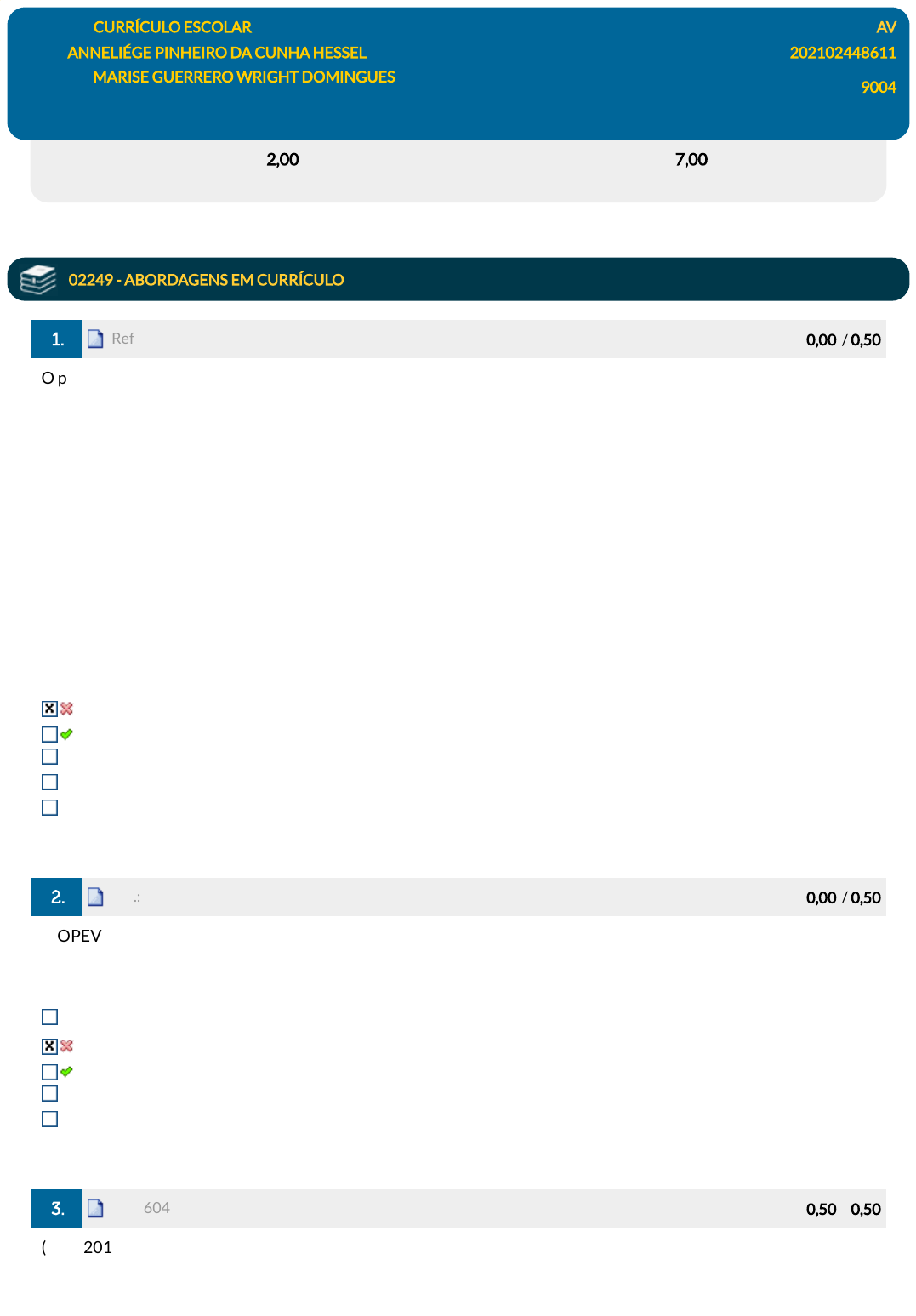 Disciplina: CURRÍCULO ESCOLAR AV Aluno: ANNELIÉGE PINHEIRO DA CUNHA HESSEL 202102448611 Professor: MARISE GUERRERO WRIGHT DOMINGUES Turma: 9004 EEL0020_AV_202102448611 (AG) 07/06/2023 14:10:56 (F) Avaliação: 2,00 pts Nota SIA: 7,00 pts O aproveitamento da Avaliação Parcial será considerado apenas para as provas com nota maior ou igual a 4,0. 02249 - ABORDAGENS EM CURRÍCULO 1. Ref.: 6041096 Pontos: 0,00 / 0,50 O pós-estruturalismo é considerado por Silva (2009) como uma continuidade e uma crítica ao estruturalismo. Podemos, de forma geral, entender o estruturalismo como um pensamento que I - privilegia uma concepção do mundo como estrutura fechada, marcada por uma lógica geral que envolve e orienta todos os fenômenos. II - como exemplo de visão estrutural, podemos pensar nos estudos críticos reprodutivistas de enfoque economicista, que interpretam o mundo como organizado por uma estrutura econômica que o controla. III - entre destacáveis pensadores estruturalistas, estão Saussure e Lévi-Strauss, cujos trabalhos buscam estabelecer uma lógica universal de funcionamento para a linguagem e a cultura, respectivamente. IV - o pós-estruturalismo possui em comum com o estruturalismo o foco na linguagem, mas se diferencia ao criticar a ideia de uma estrutura fechada que regularia todos os processos de signi�cação. Estão corretas as a�rmativas: I, III e IV somente. I, II, III e IV. II, III e IV somente. I e II somente. I, II e III somente. 2. Ref.: 6041284 Pontos: 0,00 / 0,50 (COPEVE/UFAL 2017 - Professor - Prefeitura de Maceió) As questões sobre o currículo estão no centro das discussões atuais. Segundo Marisa Vorraber Costa (2001), as teorias curriculares expressam determinadas visões de mundo e de currículo. Na teoria pós-crítica, o currículo precisa levar em consideração, principalmente: Classe social, identidades, avaliação, planejamento e avaliação da aprendizagem. Identidades, classe social, currículo oculto, diferenças e avaliação. Identidades, diferenças, alteridades, gênero e multiculturalismo. Conteúdos, avaliação da aprendizagem, planejamento de ensino, classe social e identidades. Conteúdos, identidades, planejamento de ensino, avaliação e multiculturalismo. 3. Ref.: 6041316 Pontos: 0,50 / 0,50 (Ano: 2019 Banca: FAU Órgão: IF-PR Prova: FAU - 2019 - IF-PR - Professor - Pedagogia) O currículo escolar abrange as experiências de aprendizagens implementadas pelas instituições escolares e que deverão ser vivenciadas pelos estudantes. Nele estão contidos os conteúdos que deverão ser abordados no processo de ensino-aprendizagem e a javascript:alert('C%C3%B3digo da quest%C3%A3o: 6041096.'); javascript:alert('C%C3%B3digo da quest%C3%A3o: 6041284.'); javascript:alert('C%C3%B3digo da quest%C3%A3o: 6041316.'); metodologia utilizada para os diferentes níveis de ensino. Assinale a alternativa correta sobre as teorias do currículo: Teorias tradicionais, teorias cínicas e teorias pós-críticas. Teorias tradicionais, teorias críticas e teorias pós-críticas. Teorias tradicionais, teorias cívicas e teorias pós-críticas. Teorias abismais, teorias críticas e teorias pós-críticas. Teorias tradicionais, teorias críticas e teorias pós-tradicionais. 02372 - CURRÍCULO E CULTURA 4. Ref.: 6039808 Pontos: 0,00 / 0,50 De que forma podemos justi�car a inserção de temas como o da cidadania na elaboração de um currículo? A capacidade de se posicionar criticamente diante dos desa�os econômicos, políticos, sociais e culturais aos quais todo indivíduo está sujeito é uma habilidade que pode ser desenvolvida durante o processo de aprendizagem. Com a implantação dos sistemas de gestão democrática, a sociedade passou a in�uenciar diretamente todas as práticas das instituições de ensino, modi�cando, inclusive, a elaboração do currículo que hoje é feita de forma individual por cada comunidade. Todo indivíduo tem direito de aprender a defender-se das mazelas políticas dos governantes e a escola tem a obrigação de prepará-lo para isso. O currículo é organizado para atender aos valores culturais de uma sociedade e, nesse sentido, formar o cidadão que passará a viver naquele espaço. Atualmente a educação deixou de lado seu papel na formação intelectual e passou a ser identi�cada como um meio pelo qual o indivíduo receberá toda a sua formação política e social. 5. Ref.: 6039848 Pontos: 0,50 / 0,50 (Prefeitura de Vertentes / 2019) Uma perspectiva crítica de currículo multicultural parte da necessidade de compreender que as identidades dos sujeitos se constituem a partir de espaços e de discursos plurais e, ao compreendê-las, cabe ao professor rejeitar qualquer tipo de postura que possa torná-las invisíveis. Uma prática docente fundamentada num currículo multicultural implica em adotar ações que priorizem narrativas hegemônicas acerca das identidades, visando um modelo mais inclusivo. considerar as relações de poder que se con�guram como elementos basilares da produção das diferenças. assumir uma postura universalista que valorize as singularidades culturais, sociais e intelectuais, e priorize a que é mais comum a todas. desenvolver práticas de tolerância e respeito às diferenças, uma vez que estas já se encontram preestabelecidas. elaborar um planejamento que considera as identidades dos estudantes, de modo homogêneo e abstrato em busca de um modelo comum para todos. 6. Ref.: 6039818 Pontos: 0,50 / 0,50 (EMEJA / 2021) O currículo escolar contempla aspectos como saúde, sexualidade, vida familiar e social, meio ambiente, trabalho, cultura e linguagens, interligados a Matemática, Português, Ciências, História, Língua Estrangeira, Educação Física, Artes e Educação Religiosa. Com base na informação acima, assinale a alternativa que corresponde ao embasamento teórico do currículo: javascript:alert('C%C3%B3digo da quest%C3%A3o: 6039808.'); javascript:alert('C%C3%B3digo