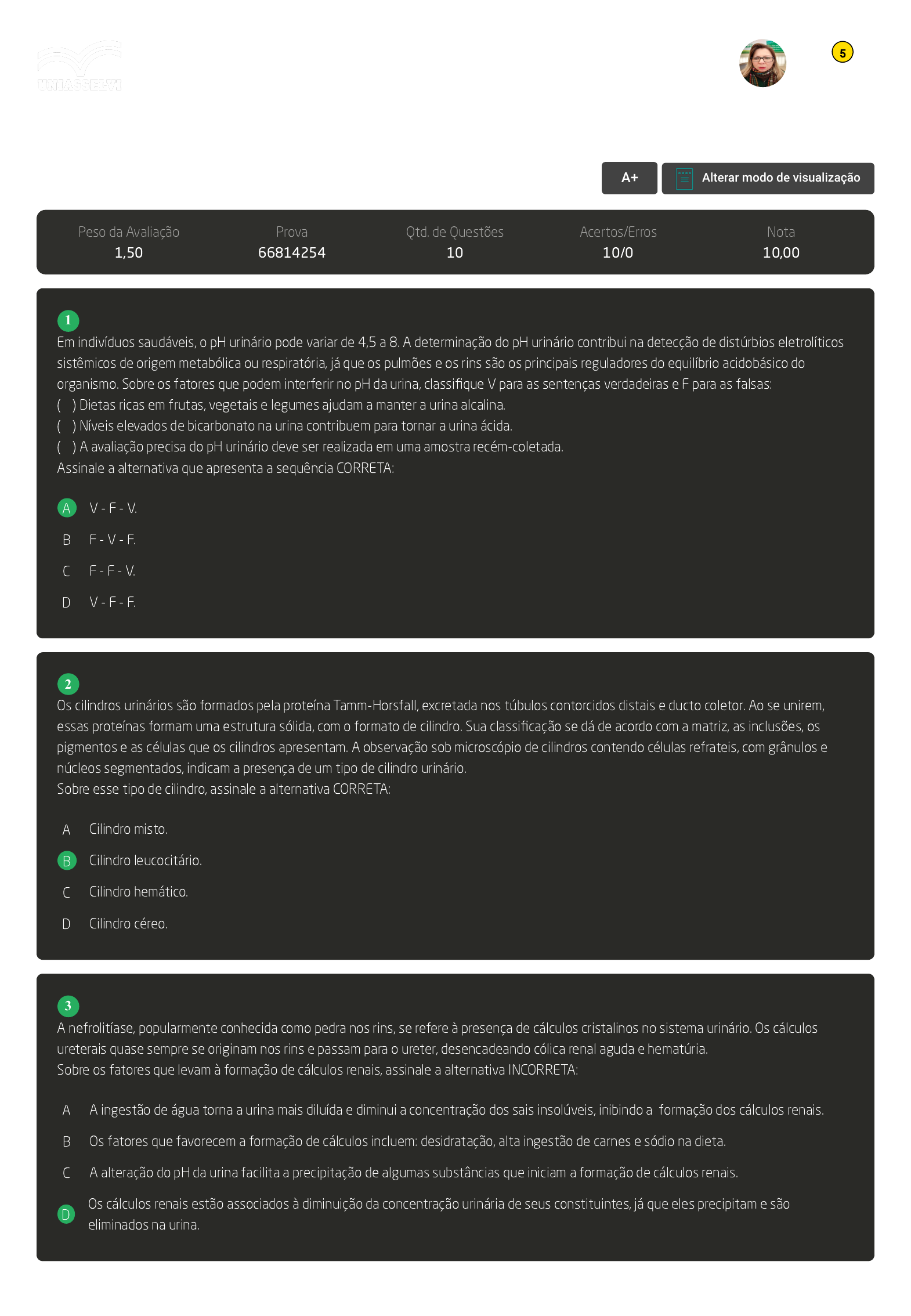 14/06/2023, 20:03 AVA https://ava2.uniasselvi.com.br/subject/grades-and-tests/answer-book/eyJ0ZXN0Ijp7InRlc3RDb2RlIjoiODI4MjY0IiwiZGVzY3JpcHRpb24iOiJBdmFsaWHDp8OjbyBJSSAtIEluZGl2aWR1YWwiLCJwYXJhbWV0ZXIiOjU0… 1/4 GABARITO | Avaliação II - Individual (Cod.:828264) Peso da Avaliação 1,50 Prova 66814254 Qtd. de Questões 10 Acertos/Erros 10/0 Nota 10,00 Em indivíduos saudáveis, o pH urinário pode variar de 4,5 a 8. A determinação do pH urinário contribui na detecção de distúrbios eletrolíticos sistêmicos de origem metabólica ou respiratória, já que os pulmões e os rins são os principais reguladores do equilíbrio acidobásico do organismo. Sobre os fatores que podem interferir no pH da urina, classifique V para as sentenças verdadeiras e F para as falsas: ( ) Dietas ricas em frutas, vegetais e legumes ajudam a manter a urina alcalina. ( ) Níveis elevados de bicarbonato na urina contribuem para tornar a urina ácida. ( ) A avaliação precisa do pH urinário deve ser realizada em uma amostra recém-coletada. Assinale a alternativa que apresenta a sequência CORRETA: A V - F - V. B F - V - F. C F - F - V. D V - F - F. Os cilindros urinários são formados pela proteína Tamm-Horsfall, excretada nos túbulos contorcidos distais e ducto coletor. Ao se unirem, essas proteínas formam uma estrutura sólida, com o formato de cilindro. Sua classificação se dá de acordo com a matriz, as inclusões, os pigmentos e as células que os cilindros apresentam. A observação sob microscópio de cilindros contendo células refrateis, com grânulos e núcleos segmentados, indicam a presença de um tipo de cilindro urinário. Sobre esse tipo de cilindro, assinale a alternativa CORRETA: A Cilindro misto. B Cilindro leucocitário. C Cilindro hemático. D Cilindro céreo. A nefrolitíase, popularmente conhecida como pedra nos rins, se refere à presença de cálculos cristalinos no sistema urinário. Os cálculos ureterais quase sempre se originam nos rins e passam para o ureter, desencadeando cólica renal aguda e hematúria. Sobre os fatores que levam à formação de cálculos renais, assinale a alternativa INCORRETA: A A ingestão de água torna a urina mais diluída e diminui a concentração dos sais insolúveis, inibindo a formação dos cálculos renais. B Os fatores que favorecem a formação de cálculos incluem: desidratação, alta ingestão de carnes e sódio na dieta. C A alteração do pH da urina facilita a precipitação de algumas substâncias que iniciam a formação de cálculos renais. D Os cálculos renais estão associados à diminuição da concentração urinária de seus constituintes, já que eles precipitam e são eliminados na urina. VOLTAR A+ Alterar modo de visualização 1 2 3 Jusara Rolim de Moura Farmácia (2953751) 5 14/06/2023, 20:03 AVA https://ava2.uniasselvi.com.br/subject/grades-and-tests/answer-book/eyJ0ZXN0Ijp7InRlc3RDb2RlIjoiODI4MjY0IiwiZGVzY3JpcHRpb24iOiJBdmFsaWHDp8OjbyBJSSAtIEluZGl2aWR1YWwiLCJwYXJhbWV0ZXIiOjU0… 2/4 A síndrome nefrótica é um grupo de características clínicas que ocorrem simultaneamente levando ao aumento da permeabilidade dos glomérulos para a passagem de proteínas plasmáticas. Essa condição ocorre em pacientes com doenças glomerulares e doenças sistêmicas, como diabetes, lúpus eritematoso sistêmico, neoplasias e infecções. Com base nos sinais que caracterizam a síndrome nefrótica, classifique V para as opções verdadeiras e F para as falsas: ( ) Proteinúria. ( ) Edema. ( ) Hiperalbuminemia. ( ) Hiperlipidemia.Assinale a alternativa que apresenta a sequência CORRETA: A F - F - V - V. B V - F - V - V. C V - V - F - V. D F - V - F - F. A urina é utilizada na triagem de doenças metabólicas, em particular daquelas que resultam de uma predisposição genética. Foram identificados inúmeros erros inatos do metabolismo que resultam na excreção de um metabólito anormal ou quantidades quantidade excessivas de um metabólito normal, como é o caso da fenilcetonúria. Com base nos seus conhecimentos sobre a fenilcetonúria, analise as sentenças a seguir: I- A fenilcetonúria é um distúrbio de herança autossômica dominante. II- Os portadores de fenilcetonúria não produzem a enzima fenilalanina redutase. III- Os níveis plasmáticos e urinários de fenilalanina, ácido fenilpirúvico e ácido fenilacético se encontram aumentados nessa doença. Assinale a alternativa CORRETA: A As sentenças I e II estão corretas. B Somente a sentença III está correta. C Somente a sentença II está correta. D As sentenças I e III estão corretas. As doenças metabólicas hereditárias decorrem de erros inatos do metabolismo causados por mutações genéticas, capazes de gerar proteínas anômalas que, geralmente, correspondem a defeitos enzimáticos. Esses defeitos levam ao acúmulo de substratos antes do bloqueio metabólico, à falta do produto essencial após o bloqueio e/ou à produção de substâncias tóxicas pela metabolização do excesso de substrato por vias metabólicas alternativas nas quais não exista deficiência enzimática. Todas essas alterações podem levar ao comprometimento das funções celulares, interrompendo a homeostase do organismo. Segundo a Sociedade Brasileira de Patologia Clínica (2017), testes de triagem neonatal, associados às manifestações clínicas dos pacientes e testes bioquímicos urinários, direcionam o diagnóstico dos erros inatos do metabolismo. Sobre as principais manifestações clínicas das doenças metabólicas hereditárias, associe os itens, utilizando o código a seguir: I- Doença das purinas. II- Cistinúria. III- Doença do xarope de bordo na urina. ( ) Retardo de crescimento e desenvolvimento mental, e aumento da excreção de cetoácidos na urina, resultando em seu forte odor. ( ) Presença de cristais de cistina na urina, formação de cálculo renal, hematúria e dor abdominal. ( ) Aumento da excreção urinária de cristais de ácido úrico, associad