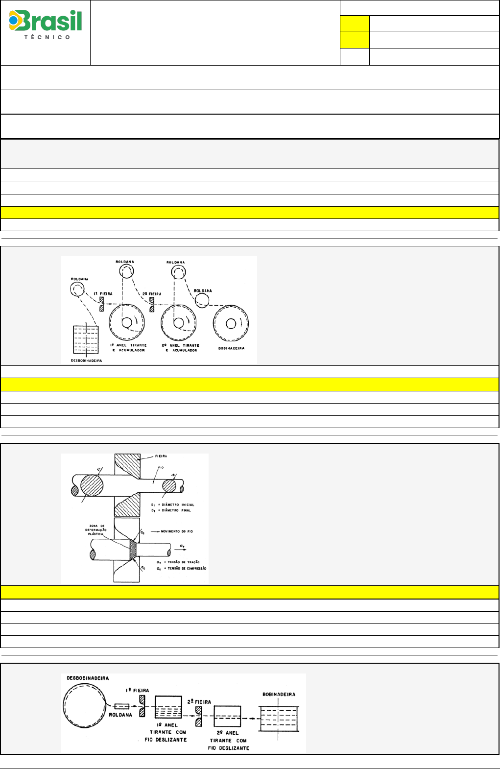 Pincel Atômico - 03/06/2023 11:29:41 1/2 JOSÉ ARTHUR MARQUES GAMA Exercício Caminho do Conhecimento - Etapa 6 (15086) Atividade finalizada em 13/05/2023 13:06:41 (945426 / 2) LEGENDA Resposta correta na questão # Resposta correta - Questão Anulada X Resposta selecionada pelo Aluno Disciplina: PROCESSOS DE TRANSFORMAÇÃO MECÂNICA [534363] - Avaliação com 4 questões, com o peso total de 3,25 pontos [capítulos - 113] Turma: Curso Técnico: Mecânica - Grupo: BT PRES JAN/23 - BT PRES MEC V1 [77082] Aluno(a): 91416476 - JOSÉ ARTHUR MARQUES GAMA - Respondeu 2 questões corretas, obtendo um total de 1,63 pontos como nota [350212_151997] Questão 001 Com relação ao funcionamento da bobinadeira é correto afirmar: X A bobinadeira vai aumentando a sua rotação a medida que a bobina e enrolada A bobina e empurrada pelo próprio fio trefilado A bobinadeira deve manter a rotação constante da bobina A bobinadeira deve varia sua rotação durante a operação A bobinadeira deve mantes a velocidade angular constante para não tracionar em excesso o fio. [350212_151995] Questão 002 A imagem abaixo mostra o esquema de funcionamento de qual máquina de trefila? Máquina de trefilar vertical X Máquinas de trefilar sem deslizamento Máquina de trefila fio maquina Máquina de trefilar horizontal Máquinas de trefilar com deslizamento [350211_151992] Questão 003 A imagem abaixo se refere a qual processo de transformação mecânico? X trefilação lingotamento Forjamento longitudinal laminação extrusão [350212_151996] Questão 004 A imagem abaixo mostra o esquema de funcionamento de qual máquina de trefila? Pincel Atômico - 03/06/2023 11:29:41 2/2 Máquinas de trefilar sem deslizamento Máquina de trefilar horizontal Máquinas de trefilar com deslizamento Máquina de trefilar vertical X Máquina de trefila fio maquina