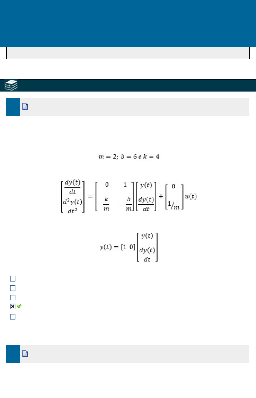 Disciplina: SISTEMAS DINÂMICOS AV Aluno: THIAGO Professor: LUANDER BERNARDES Turma: 9001 DGT1085_AV_ (AG) 17/04/2023 (F) Avaliação: 8,00 pts Nota SIA: 9,50 pts 02426 - EQUAÇÕES DINÂMICAS DE SISTEMAS LINEARES 1. Ref.: 6079361 Pontos: 1,00 / 1,00 Considerando os parâmetros do sistema massa-mola abaixo e a equação de espaço de estado, é possível definir que a matriz de entrada dessa representação no espaço de estado é igual a: [02][02] [0,51][0,51] [01][01] [00,5][00,5] [10][10] 2. Ref.: 6079362 Pontos: 1,00 / 1,00 A representação de sistemas físicos através de modelos matemáticos é uma ferramenta de grande importância. Considerando os parâmetros do sistema massa-mola abaixo e a equação de espaço de estado, é possível definir que a matriz de estado é igual a: [−4−6−2−3][−4−6−2−3] [01−4−3][01−4−3] [01−2−3][01−2−3] [0125][0125] [−4−500][−4−500] 3. Ref.: 6079354 Pontos: 1,00 / 1,00 Conhecendo os conceitos das equações diferenciais e aplicando-se o Teorema do Valor Inicial, determine o valor da constante C da equação geral: C=30/529�=30/529 C=20�=20 C=20/30�=20/30 C=30�=30 C=529/30�=529/30 4. Ref.: 6079352 Pontos: 1,00 / 1,00 Dentro do contexto de equações diferenciais e métodos de resolução de equações diferenciais, observando a equação abaixo, a sua derivada de segunda ordem é dada por: y=x2+3x+3�=�2+3�+3 y′′=3x+3�″=3�+3 y′′=3x�″=3� y′′=2�″=2 y′′=3�″=3 y′′=2x+3�″=2�+3 02615 - MODELAGEM NO DOMÍNIO DA FREQUÊNCIA 5. Ref.: 6079459 Pontos: 0,00 / 1,00 A representação matemática de um sistema físico que relaciona a sua entrada com a sua saída é definida como função de transferência. Considerando a função de transferência abaixo, a resposta geral desse sistema no domínio do tempo é definida por: c(t)=3/4e−4tu(t)�(�)=3/4�−4��(�) c(t)=1/4u(t)�(�)=1/4�(�) c(t)=1/4u(t)+3/4e−4tu(t)�(�)=1/4�(�)+3/4�−4��(�) c(t)=3/4u(t)+1/4e−4tu(t)�(�)=3/4�(�)+1/4�−4��(�) c(t)=1/4u(t)−3/4e−tu(t)�(�)=1/4�(�)−3/4�−��(�) 6. Ref.: 6079461 Pontos: 1,00 / 1,00 A representação matemática de um sistema físico que relaciona a sua entrada com a sua saída é definida como função de transferência. A função domínio do tempo de uma função de transferência é definida abaixo. Caso seja aplicada uma entrada em degrau unitário no sistema, é possível afirmar que a saída desse sistema será igual a: c(t)=1/4+3/4e−4t�(�)=1/4+3/4�−4� c(t)=1/4−3/4e−4t�(�)=1/4−3/4�−4� c(t)=1/4e−4t�(�)=1/4�−4� c(t)=3/4−1/4e−t�(�)=3/4−1/4�−� c(t)=3/4�(�)=3/4 7. Ref.: 6079465 Pontos: 1,00 / 1,00 A representação matemática de um sistema físico que relaciona a sua entrada com a sua saída é definida como função de transferência. Considere o circuito elétrico da Figura abaixo. Se os valores dos elementos do circuito forem definidos por: R1=4ohm�1=4�ℎ�, R2=6ohm�2=6�ℎ� e L=2henry�=2ℎ����, pode- se afirmar que a função de transferência desse circuito será definida por: Fonte: YDUQS - Estácio - 2021 VL(s)V(s)=1(s+2)��(�)�(�)=1(�+2) VL(s)V(s)=s(s+5)��(�)�(�)=�(�+5) VL(s)V(s)=1(s+5)��(�)�(�)=1(�+5) VL(s)V(s)=1(s+1/5)��(�)�(�)=1(�+1/5) VL(s)V(s)=s(s+4)��(�)�(�)=�(�+4) 02616 - MODELAGEM NO DOMÍNIO DO TEMPO 8. Ref.: 6078471 Pontos: 1,00 / 1,00 O desenvolvimento de sistemas de automação e controles de processos físicos depende de sua representação no espaço de estado por meio do conhecimento de todas as variáveis envolvidas. As informações que definem a situação inicial de um sistema e que são fundamentais para o conhecimento do estado do sistema em instantes posteriores são denominadas: variável de estado variável de saída derivadas de fase condições iniciais variável de fase 9. Ref.: 6078368 Pontos: 0,00 / 1,00 Representar um sistema no espaço de estado apresenta uma grande importância no desenvolvimento de sistemas físicos sendo fundamental para a elaboração de estratégias de controle. Abaixo é possível observar um exemplo de função de transferência de um sistema físico. É possível dizer que em função das variáveis de estado, o vetor de saída (y(t))(�(�)) será definido por: G(s)=80s3+12s2+20s=C(s)R(s)�(�)=80�3+12�2+20�=�(�)�(�) [101][101] [111][111] [100][100] [001][001] [110][110] 10. Ref.: 6078366 Pontos: 1,00 / 1,00 Representar um sistema no espaço de estado apresenta uma grande importância no desenvolvimento de sistemas físicos sendo fundamental para a elaboração de estratégias de controle. Abaixo é possível observar um exemplo de função de transferência de um sistema físico. Observando a conversão de funções de transferência em equações de espaço de estado é possível dizer que a equação diferencial que representa esse sistema é igual a: G(s)=80s3+12s2+20s=C(s)R(s)�(�)=80�3+12�2+20�=�(�)�(�) ...c+12¨c+20˙c=80r�⃛+12�¨+20�˙=80� ...c+12¨c=80r�⃛+12�¨=80� 12¨c+20˙c=80r12�¨+20�˙=80� ...c+12¨c+20˙c=0�⃛+12�¨+20�˙=0 ...c+20˙c=80r