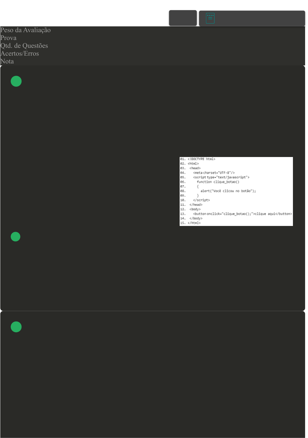 15/06/2023, 15:16 Avaliação II - Individual about:blank 1/5 Prova Impressa GABARITO | Avaliação II - Individual (Cod.:770811) Peso da Avaliação 1,50 Prova 52484194 Qtd. de Questões 10 Acertos/Erros 10/0 Nota 10,00 O JavaScript é uma linguagem de programação interpretada pelo navegador e é a mais utilizada no mundo, principalmente pelo fato de melhorar a usabilidade com a possibilidade de atualizar uma página web, ou parte dela, sem ter que carregá-la completamente. Sobre JavaScript, analise o código e classifique V para as sentenças verdadeiras e F para as falsas: ( ) A linha 08 apresentará uma mensagem no navegador do usuário. ( ) A linha 13 possui um evento JavaScript associado ao botão. ( ) Nas linhas 06 a 09, a função clique_botao pode ser associada a vários botões. ( ) A linha 04 insere código CSS ao documento. Assinale a alternativa que apresenta a sequência CORRETA: A V - V - V - F. B F - V - V - F. C F - F - V - V. D V - F - F - V. A linguagem JavaScript, assim como o PHP, conta com o recurso de tipagem dinâmica, ou seja, ao declarar uma variável não é necessário especificar o tipo de dado. O JavaScript conta com os tipos de dados que para efetuar operações aritméticas. Pode ser ou não número com ponto flutuante. Sobre o exposto, assinale a alternativa CORRETA: A String VOLTAR A+ Alterar modo de visualização 1 2 15/06/2023, 15:16 Avaliação II - Individual about:blank 2/5 B Number C Object D Boolean Os comandos DDL executados para criar o banco de dados, a tabela e a chave primária são descritos abaixo e são executados automaticamente pela ferramenta phpMyAdmin. Assinale a alternativa com o comando INCORRETO: A CREATE DATABASE. B ALTER TABLE ADD CONSTRAINTPRIMARY. C TABLE SHIFT. D CREATE TABLE. Declarar variáveis em JavaScript não tem muito mistério, porém, é necessário estar atento a algumas particularidades. Para criar uma variável, utiliza-se qual instrução? A variavel 3 4 15/06/2023, 15:16 Avaliação II - Individual about:blank 3/5 B vari C var D varia Há um comando DML, também conhecido como query (consulta, em inglês), cuja função é retornar dados das tabelas de um banco de dados. Que comando é esse? A SELECT. B CREATE. C DROP. D INSERE. Os comandos DML são utilizados para efetuar seleção e/ou manutenção nos dados do banco de dados. Quais são os quatro principais comandos DML? A SELECT, INSERT, UPDATE e DELETE. B CREATE, INSERT, UPDATE e DELETE. C SELECT, INSERT, UPDATE e DROP. D SELECT, INSERT, MODIFY e DROP. 5 6 15/06/2023, 15:16 Avaliação II - Individual about:blank 4/5 Os comandos DML são utilizados para efetuar seleção e/ou manutenção nos dados do banco de dados. Sobre os comandos listados, assinale a alternativa INCORRETA: A Insert. B Select. C Rewrite. D Delete. JavaScript nasceu de um antigo navegador chamado Netscape. Atualmente, é implementado em todos os navegadores. Sobre Javascript, analise as sentenças a seguir: I- Javascript é uma linguagem de script do lado do cliente. II- Possui menos interação com o servidor, permitindo validar a entrada do usuário antes de enviar a página, o que significa menos carga no servidor e menos tráfego no servidor. III- O JavaScript não aceita variáveis maiúsculas e minúsculas. IV- O Javascript é executado no navegador. V- O Javascript não suporta bancos de dados. Assinale a alternativa CORRETA: A As sentenças I, II, III, IV e V estão corretas. B Somente a sentença IV está correta. C Somente a sentença III está correta. 7 8 15/06/2023, 15:16 Avaliação II - Individual about:blank 5/5 D Somente a sentença I está correta. O JavaScript possui basicamente os mesmos operadores lógicos encontrados no PHP. Qual operador lógico verifica se dois valores não possuem a mesma identidade? A Desigualdade (!=). B Identidade (===). C Não Identidade (!==). D Igualdade (==). O JavaScript possui os mesmos operadores aritméticos que as demais linguagens de programação que possuem a estrutura léxica baseada em C. Qual operador aritmético que subtrai em 1 o valor de seu operando e caso o operador estiver à esquerda do operando, ele primeiro decrementa e depois retorna o novo valor? A Decremento (– –). B Divisão (/). C Módulo (%). D Incremento (++). 9 10 Imprimir