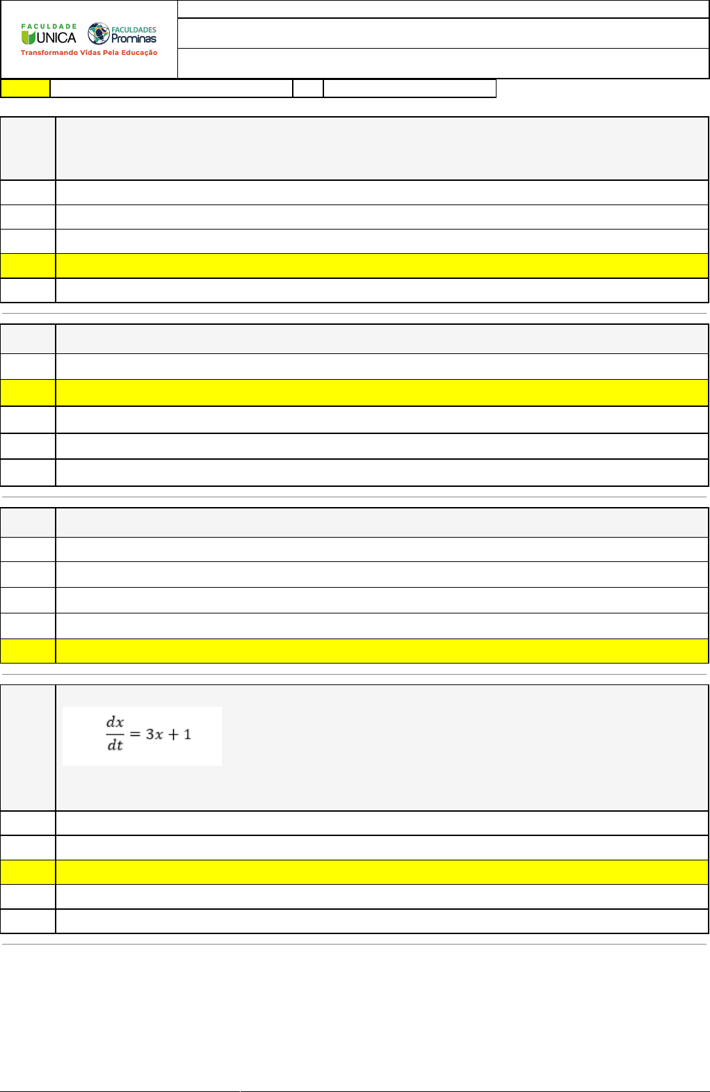 10/04/2023 11:33:29 1/3 REVISÃO DE SIMULADO Nome: MONICA SUZART NUNES Disciplina: Cálculo III Respostas corretas são marcadas em amarelo X Respostas marcardas por você. Questão 001 Considere a equação abaixo: ƒ’ (t) = - a.sen (t) + b.cosâ�¡ (t) Possui por solução geral qual das expressões abaixo? A) ƒ(t) = b.sen(a+b) + cosâ�¡(t) X B) ƒ(t) = a.sen(t+b) - cosâ�¡(t) C) ƒ(t) = a.sen(t) D) ƒ(t) = a.cosâ�¡(t) - b.sen(t) E) ƒ(t) = a.sen(t+b) - cosâ�¡(t) + b.sen(t-b) Questão 002 Qual função abaixo é solução da EDO y''- 3y' + 2y= 0 ? A) y= ex X B) y= c1 ex + c2 e2x C) y=c1 ex D) y=e2x E) y=c2 e2x Questão 003 Das equações abaixo, qual é linear? A) y'+ 2xy =cosy X B) y''= 1+(y')2 C) x2 yy'- 2xy2 = 0 D) ey''- xy' + y = 0 E) y' = 5x+2y Questão 004 Analise a expressão abaixo: A expressão indicada acima representa A) uma equação com cinco raízes reais. X B) uma equação complexa. C) uma equação diferencial. D) uma equação do primeiro grau. E) uma equação transcendental. 10/04/2023 11:33:29 2/3 Questão 005 Analise a expressão abaixo: x(t) = a.sen(t) - b.cosâ�¡(t) Considerando a expressão dada acima, avalie a seguintes asserções e a relação proposta entre elas. I. A função dada na expressão é uma solução geral de uma equação diferencial. PORQUE II. Ao derivarmos a função dada de acordo com o grau da equação diferencial, chegaremos exatamente na expressão que a representa. A respeito destas asserções, assinale a opção correta. X A) A asserção I é uma proposição falsa e, a II é uma proposição verdadeira. B) As asserções I e II são proposições falsas. C) As asserçoÌ�es I e II saÌ�o proposiçoÌ�es verdadeiras, e a II eÌ� uma justificativa da I. D) A asserção I é uma proposição verdadeira e, a II é uma proposição falsa. E) As asserções I e II são proposições verdadeiras, mas a II não é uma justificativa da I. Questão 006 Analise a expressão abaixo: A expressão acima representa A) uma equação diferencial com duas raízes. X B) uma equação diferencial de ordem n. C) uma equação diferencial de primeiro grau. D) Uma equação diferencial de segundo grau. E) uma equação diferencial transcendental. Questão 007 Qual a ordem da equação diferencial y(5)-6y(4) +10y'''- 11y'+ 6y = 0 A) 5 B) 1 X C) 6 D) 3 E) 4 Questão 008 Analise a equação diferencial a seguir: f'(t) = a.sen(t+b) De acordo com a expressão acima, avalie as afirmativas abaixo: I. A equação indicada na expressão é do primeiro grau, pois possui expoente 1 na derivada. II. A equação indicada pode representar um modelo físico, uma vez que descreve a taxa de variação de uma variável em relação a outra. III. A equação diferencial indicada possui uma solução geral, a qual pode ser obtida pela integração da mesma. É correto o que se afirma em: A) III, apenas. B) I, II e III. X C) II e III, apenas. 10/04/2023 11:33:29 3/3 D) I, apenas. E) II, apenas.
