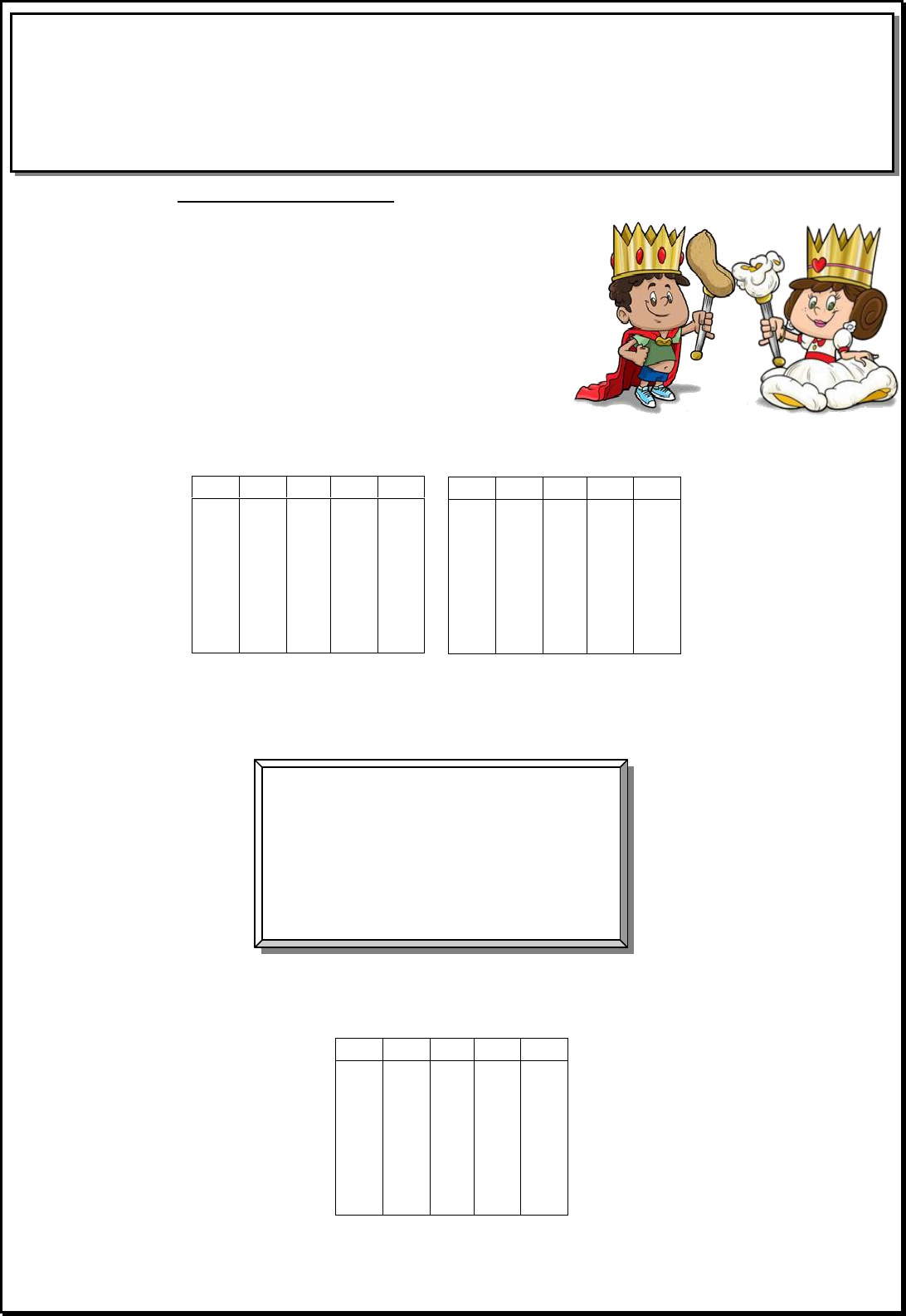 Calculando: Festa junina Leia com atenção as situações problemas abaixo e responda: A. A organização de uma festa junina pretende arrecadar R$ 12.500,00 com a venda de rifa da Rainha da Pipoca e Rei do Amendoim. Com essa quantia, poderá comprar os ingredientes para fazer as comidas típicas e bebidas para o grande Arraiá da escola. A diretora da escola gastará R$ 1.578,00 no supermercado, R$ 1.495,00 no açougue e R$ 2.287,00 em refrigerantes. Quanto receberá de troco se levar os R$ 12.500,00 que pretende arrecadar em votos? R: ___________________________________________________________________________________ B. Para a festa junina, serão feitos os seguintes salgados: a) Qual salgado terá em maior quantidade? __________________________________________ b) Quantas coxinhas serão feitas a mais que as empadas? R: ___________________________________________________________________________________ Dm Um C D U Dm Um C D U Dm Um C D U ÁREA DO CONHECIMENTO: Matemática (1ª semana) OBJETO DE CONHECIMENTO: Adição e Subtração; cálculo mental. HABILIDADES: Resolver situações problemas envolvendo as operações de adição e de subtração; fazer comparações de valores; Coxinhas ------------------------------ 4.930 Pastéis ---------------------------------- 3.896 Empadas ------------------------------- 2.376 Espetinhos ---------------------------- 1.435 Cachorros quentes ------------------- 4.785 c) Qual a diferença da quantidade de pastéis para a quantidade de espetinhos? R: __________________________________________________________________________________ d) Quantos salgados serão feitos ao todo? R: ___________________________________________________________________________________ C. Observe atentamente as tabelas de preços da festa junina e resolva as situações abaixo: Para esta Festa junina, Paulo levou seu pai Roberto, sua mãe Márcia e suas irmãs gêmeas Renata e Brenda. Paulo sabe que seu pai levou para essa festa o valor de R$ 150,00. Na próxima folha você vai conhecer cada um, vai saber o que cada um comprou, porém, eles não sabem quanto gastaram e se irão voltar pra casa com algum troco. Então, vamos ajuda-los a descobrir o que cada um gastou e quanto sobrou. Preste a atenção nos valores das tabelas e faça o calculo que se pede. Vamos lá? Dm Um C D U Dm Um C D U Tabela de preços (alimentação) Refrigerante ------------------------- R$ 5,00 Água----------------------------------- R$ 3,00 Pipoca -------------------------------- R$ 4,00 Bolos --------------------------------- R$ 2,00 Docinhos ----------------------------- R$ 2,50 Milho --------------------------------- R$ 2,50 Coxinha ------------------------------ R$ 4,50 Cachorro quente --------------------- R$ 5,00 Pastel -------------------------------- R$5,00 Empadas ----------------------------- R$3,00 Espetinho ---------------------------- R$ 4,50 Quentão ------------------------------ R$ 5,00 Tabela de preços (brinquedos) Cama elástica ----------- R$ 3,00 Pescaria ----------------- R$ 3,00 Argola ------------------- R$ 3,00 Boca do palhaço --------- R$ 2,00 Rabo do burro -----------R$ 2,00 AGORA, CALCULE O QUE CADA UM GASTOU: Depois de calcular, responda: A. Quem foi que menos gastou? _________________________________ B. Quem gastou mais? ______________________________ C. Agora, chegou a hora de saber! Em relação ao valor que o pai de Paulo levou para gastar na festa, depois de descobrir quanto cada um gastou, sobrou dinheiro? Qual foi o valor que sobrou a ele? R: __________________________________________________________________________ Roberto Dm Um C D U R$___________ Márcia Dm Um C D U R$___________ Paulo Dm Um C D U R$___________ Renata Dm Um C D U R$___________ Brenda Dm Um C D U R$___________ Dm Um C D U Dm Um C D U Paulo Roberto Márcia Renata Brenda Quentão Pastel Espetinho Milho Rabo do burro Quentão Pastel Empada Bolo Refrigerante Cachorro quente Pastel Bolo Boca do palhaço Argola Refrigerante Pipoca Docinho Coxinha Cama elástica Refrigerante Pipoca Docinho Milho Pescaria FESTA JUNINA TAMBÉM SE FAZ COM CÁLCULOS. Numa escola precisam arrecadar um valor em dinheiro. Pois o dinheiro arrecadado será usado para a reforma do Ginásio de Esportes. Pretendem juntar esse valor com a Festa Junina. Os preparativos já começaram e todos os alunos, funcionários e pais vão ajudar. Bandeirinhas não podem faltar! Veja o que foi feito de bandeirinhas até agora: A. Qual a quantidades de bandeirinhas feitas por turma? Responda usando apenas algarismos. Turma Quantidade 1º A 5 centenas, 2 dezenas e 3 unidades 1º B 865 1º C Um milhar 2º A 7 centenas e 6 unidades 2º B 2 105 2º C 3 dúzias de amarelas, 3 dúzias de vermelhas, 2 dúzias de azuis 3º A 1 030 3º B 4 unidade de milhar, 3 centenas, 5 dezenas e 8 unidades 4º A 627 4º B 1 006 5º A 1 dezena de milhar, 4 unidades de milhar,6 centenas, 2 unidades 5º B 432 + 625 + 103 Classe Quantidade 1ª A 1ª B 1ª C 2ª A 2ª B 2ª C 3ª A 3ª B 4ª A 4ª B 5ª A 5ª B ÁREA DO CONHECIMENTO: Matemática (2ª semana) OBJETO DE CONHECIMENTO: Sistema de numeração decimal: leitura, escrita e ordenação de números naturais (até a 5ª ordem). HABILIDADES: Ler e escrever por extenso e com algarismos os números naturais de até cinco ordens; Compor e decompor um número natural. B. Qual o total de bandeirinhas feitas por séries? C. Qual das séries do total fez mais bandeirinhas? __________________________ D. Qual a série do total fez menos bandeirinhas? ___________________________ E. Qual a diferença entre o total de bandeirinhas produzidas pela série que fez mais e pela série que fez menos? R: _________________________________________________________________________________ F. O 1º B quer fazer mais bandeirinhas e atingir o dobro do total que fez até agora. Quantas bandeirinhas a mais essa classe deve fazer? R: ____________________________________________________________________________ G. Se juntarmos a quantidade de ban