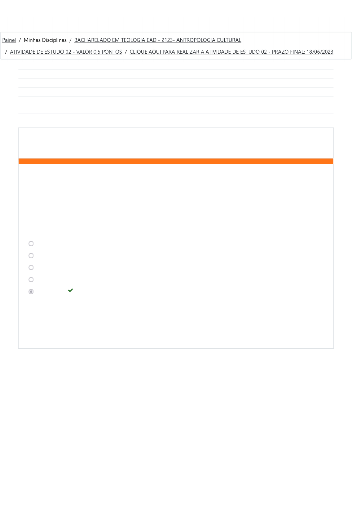 Iniciado em quinta, 15 jun 2023, 19:16 Estado Finalizada Concluída em quinta, 15 jun 2023, 19:26 Tempo empregado 9 minutos 35 segundos Avaliar 0,45 de um máximo de 0,50(90%) Questão 1 Correto Atingiu 0,05 de 0,05 somos acostumados a sermos apenas de um único jeito. Porém, você já deve ter entendido que vivendo com pessoas tão diversas é impossível não mudar. Você já deve ter reparado que o que foi até aqui estudado foi marcado pela ideia do respeito e da mudança de atitude. Diante da afirmativa, o que é a coisa mais difícil para mudar em uma sociedade? a. O racismo. b. Os costumes. c. O preconceito. d. A inveja. e. A cultura. Sua resposta está correta. A resposta correta é: A cultura. Questão 2 Correto Atingiu 0,05 de 0,05 Com relação à cultura material, existe uma lei que a protege, regulada pelo Decreto Lei nº 25, de 1937, da Constituição Federal, em seus artigos 215 e 216, e Decreto Lei nº 3.551/2000, que determina quais ações podem ser tomadas em relação à preservação material. Qual destas ações é considerada o método mais antigo? Escolha a resposta correta. a. Complexo cultural. b. Tombamento. c. Valoração do patrimônio cultural ferroviário. d. Chancela. e. Subcultura. Sua resposta está correta. A resposta correta é: Tombamento. Questão 3 Correto Atingiu 0,05 de 0,05 Quando falamos sobre cultura, um dos aspectos mais marcantes da representatividade de um povo é, sem dúvida, a religião. Esta, é o fenômeno da nossa sociedade, porém infelizmente, existem pessoas que acreditam que a manifestação religiosa deva ser representada por apenas um tipo religioso. Com base no enunciado, confira as afirmações a seguir: I – Fundamentalismo religioso significa: aqueles que proferem um tipo de religião e acreditam que sua fé é a verdadeira, única e salvadora são capazes de ações de intolerância e desrespeito. II - O fundamentalismo consegue dialogar com outras denominações religiosas, entendem os diferentes livros sagrados existentes e os rituais. III – O fundamentalismo não permanece apenas na esfera da religião, ele já permeia ações políticas, educacionais, trabalhistas. IV - Um fundamentalista acredita ser um escolhido de Deus e em nome disso pode atuar na sociedade arrebatando aqueles que estão “perdidos”. Assinale a alternativa correta: a. I e II. b. I, III e IV. c. II, III e IV. d. I, e IV. e. Todas as alternativas estão corretas. Sua resposta está correta. A resposta correta é: I, III e IV. Questão 4 Correto Atingiu 0,05 de 0,05 “Segundo Oliveira (2001), para conhecermos um determinado povo, devemos prestar atenção aos elementos que os formam”. OLIVEIRA, P. S. de. Introdução à Sociologia. São Paulo: Ática, 2001. Quais elementos são estes? Assinale a resposta correta. a. Subcultura; traços culturais; chancela; tombamento; padrão cultural. b. Traços culturais; complexo cultural; área cultural; padrão cultural; subcultura. c. Traços culturais; complexo cultural; área cultural; tombamento; padrão cultural. d. Tombamento; padrão cultural; complexo cultural; chancela; área cultural. e. Traços culturais; complexo cultural; chancela; subcultura. Sua resposta está correta. A resposta correta é: Traços culturais; complexo cultural; área cultural; padrão cultural; subcultura. Questão 5 Correto Atingiu 0,05 de 0,05 Diante de uma sociedade tão diversa e com muitos casos de preconceito e discriminação, faz-se necessário aprender que ser fora do que é chamado de padrão por um grupo social, não é nenhum problema. O problema maior é impedir que as pessoas possam viver pensar, agir e se comportar da maneira como acharem pertinente. Poder falar e ser ouvido é também um ato de existir. Uma ideia que tem sido muito difundida também é a de empoderamento. Mas você sabe o que isso significa? Assinale a alternativa correta: a. Empoderamento não tem nada a ver com o desenvolvimento da compreensão de grupos e indivíduos para agirem em nome do seu bem-estar e no direito de participar ativamente da sociedade, modificando a realidade desigual e opressora de que fazem parte. b. O empoderamento significa que você não pode lutar contra toda ação opressora que impede de se manifestar e viver como acredita ser melhor para si. c. Empoderamento serve para que manifestar o desejo de luta das pessoas tidas como normais, contra as minorias. d. Para Joice Berth (2018, p. 14), “o empoderamento é um instrumento de emancipação política e social” que não propõe criar relações que sejam paternalistas ou assistencialistas e nem muito menos tratar todas as pessoas da mesma maneira, sem respeitar suas diferenças. e. O empoderamento é a manifestação que as maiorias passaram a usar sobre as minorias, mulheres, pretas, homossexuais. Sua resposta está correta. A resposta correta é: Para Joice Berth (2018, p. 14), “o empoderamento é um instrumento de emancipação política e social” que não propõe criar relações que sejam paternalistas ou assistencialistas e nem muito menos tratar todas as pessoas da mesma maneira, sem respeitar suas diferenças. Questão 6 Correto Atingiu 0,05 de 0,05 Ao reconhecer algumas particularidades da manifestação de fé dos indígenas, os padres católicos se aproveitavam desses elementos e os associavam à religião católica. Assim, eles conseguiam fazer com o indígena pudesse ser catequizado por meio das verdades cristãs. Qual é o sincretismo religioso mais promovido no Brasil? Assinale a alternativa correta: a. O hinduísmo com as crenças africanas. b. O da religião católica com as crenças africanas. c. O da religião protestante com as crenças africanas. d. O judaísmo com as crenças africanas. e. A religião muçulmana com as crenças africanas. Sua resposta está correta. A resposta correta é: O da religião católica com as crenças africanas. Questão 7 Incorreto Atingiu 0,00 de 0,05 Paulo Freire é uma referência em vários países e un