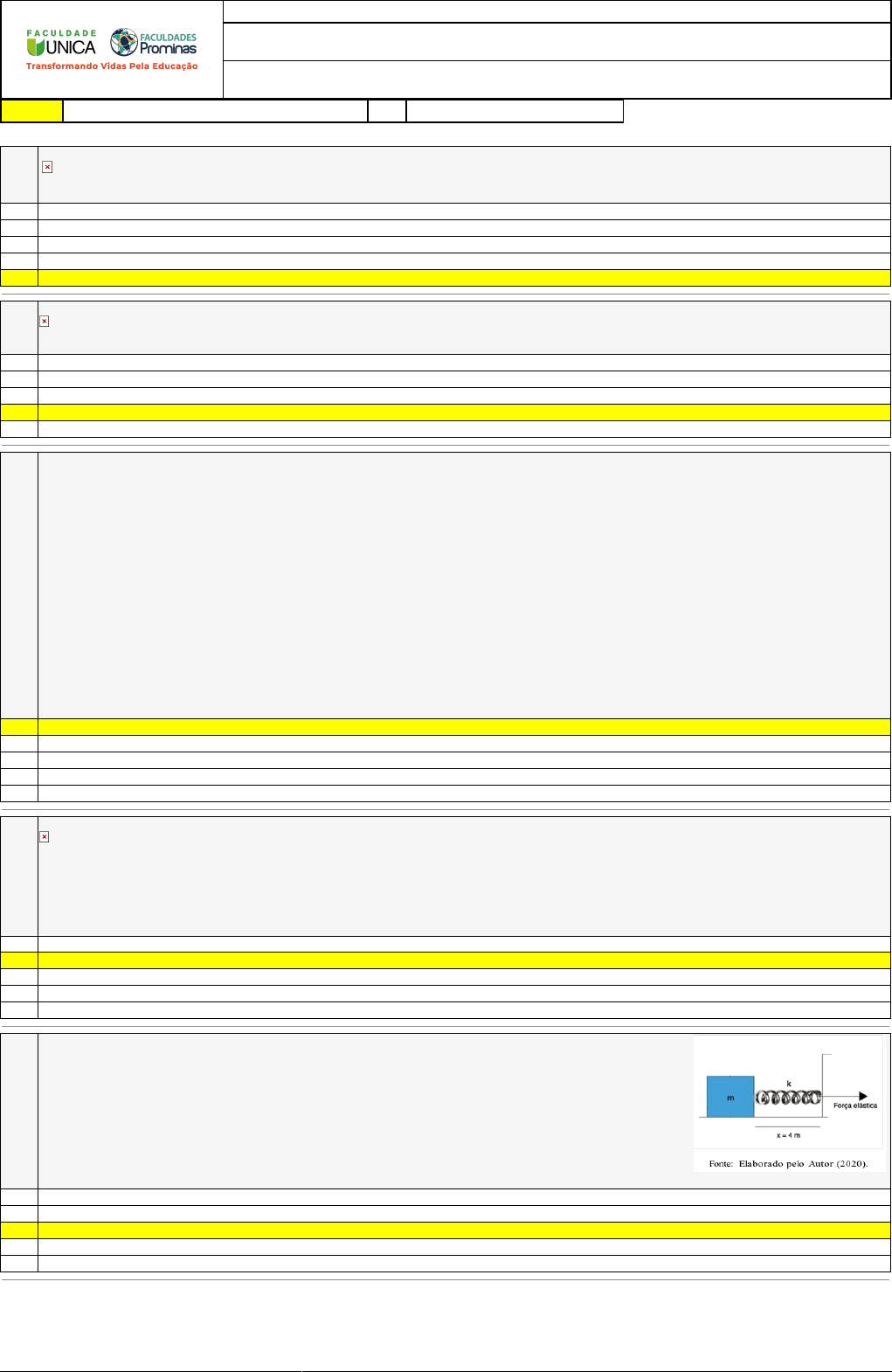 15/06/2023 20:21:53 1/2 REVISÃO DE SIMULADO Nome: PAULO SERGIO DOS SANTOS SUBTIL Disciplina: Física II Respostas corretas são marcadas em amarelo X Respostas marcardas por você. Questão 001 Veja a imagem abaixo: Fonte: Instituto de Física da USP, São Paulo. Disponível em https://labdemo.if.usp.br/pendulo-simples-3/. Acesso em 26 fev. 2021. A imagem representa o chamado pêndulo de Newton. Tal dispositivo é muito utilizado na física para se estudar A) as ondas eletromagnéticas. B) as superfícies equipotenciais. C) a pressão hidrostática do mar. D) a pressão atmosférica do ar. X E) as oscilações harmônicas. Questão 002 Veja a imagem abaixo: Fonte: Instituto de Física da USP, São Paulo. Disponível em https://labdemo.if.usp.br/pendulo-simples-3/. Acesso em 26 fev. 2021. O pêndulo simples representado na figura acima caracteriza desenvolve um tipo de movimento chamado de harmônico simples. Por que o chamamos de harmônico? A) Porque mantém sua densidade constante. B) Porque mantém seu volume constante. C) Porque mantém sua temperatura constante. D) Porque mantém o período de oscilação constante. X E) Porque mantém sua massa constante. Questão 003 Leia o trecho abaixo: Todos os experimentos feitos até hoje para detectar a matéria escura - e foram muitos - voltaram de mãos vazias, de modo que continuamos sem entender o que gera a gravidade que mantém as galáxias coesas. A massa da matéria comum não seria suficiente para isso, o que leva os cosmologistas a estimarem que existe um "algo a mais" que representa 27% da massa do Universo, contra apenas 5% da matéria de que nós e as estrelas somos feitos - os outros 68% seriam a energia escura, que explicaria porque o Universo está se expandindo. Com a falta de resultados, os físicos estão deixando de lado as teorias usadas para embasar esses experimentos. Encorajados pelo sucesso na detecção das ondas gravitacionais, Daniel Carney e seus colegas da Universidade de Maryland, nos EUA, estão propondo dois experimentos que deverão detectar a matéria escura unicamente por seus efeitos gravitacionais, ao contrário das tentativas feitas até hoje, que tentaram detectar as hipotéticas partículas de matéria escura conforme eles colidissem com substâncias químicas comuns, emitindo luz ou liberando carga elétrica nesses choques - só para relembrar, isso não funcionou. No primeiro cenário, um bilhão de pêndulos altamente sensíveis ficaria esperando serem ligeiramente sacudidos pelo empurrão de uma partícula de matéria escura que passasse. Isso é basicamente uma miniaturização dos enormes sensores dos laboratórios Ligo e Virgo, que detectam ondas gravitacionais de eventos de dimensões cósmicas. Fonte: site Inovação Tecnológica. Disponível em https://www.inovacaotecnologica.com.br/noticias/noticia.php?artigo=um-bilhao-pendulos-minusculos-podera-detectar-materia-escura&id=010130201125#.YDuPUZNKjOQ. Acesso em 26 fev 2021. De acordo as informações apresentadas no trecho, avalie as afirmativas abaixo: I. As ondas gravitacionais poderiam ser detectadas por meio da transferência de energia para os micropêndulos. II. Segundo o trecho, o movimento do micropêndulo poderia evidenciar a existência de uma matéria que não emite luz. III. O modelo estabelecido para busca da matéria escura, citada no texto, utiliza como princípio básico da física a lei da inércia de Newton. É correto o que se afirma em A) I e II, apenas. X B) II, apenas. C) I, apenas. D) III, apenas. E) I e III, apenas. Questão 004 Analise a imagem abaixo: Fonte: SILVA, C. B. C; FAGUNDES, B. B; RIBEIRO, J. D.; TONEL, A. P. Forças no sistema de referência acelerado de um pêndulo: estudo teórico e resultados experimentais. Rev. Bras. Ensino Fís. vol.42 São Paulo 2020 Epub Nov 25, 2019. https://doi.org/10.1590/1806-9126-rbef-2019-0085. De acordo com interpretação da imagem, avalie as afirmativas abaixo: I. O movimento realizado pelo balanço e o menino caracteriza-se como um movimento harmônico. II. A frequência de oscilação do balanço é inversamente proporcional ao comprimento do cabo do balanço. III. Todo movimento harmônico possui como característica fundamental uma irregularidade no período de oscilação. É correto o que se afirma em A) I, II e III. B) I, apenas. C) II, apenas. D) II e III, apenas. X E) III, apenas. Questão 005 No sistema da figura abaixo, m = 60 kg e a constante elástica da mola é dada por k = 3,4.10 . A velocidade angular de oscilação ω da mola é aproximadamente igual a: A) 0,920 rad/s B) 0,068 rad/s. C) 0,024 rad/s. X D) 0,056 rad/s. E) 0,029 rad/s. 15/06/2023 20:21:53 2/2 Questão 006 No sistema da figura abaixo, m = 15 kg e a constante elástica da mola é dada por k = 3,4.10 . A energia potencial elástica armazenada pela mola é igual a: A) 0,30 J. X B) 0,78 J. C) 0,27 J. D) 0,50 J. E) 0,42 J. Questão 007 No sistema da figura abaixo, m = 1 kg e o comprimento do fio é dada por l = 3 m. Considerando g = 10 e π = 3, a frequência angular de oscilação do pêndulo é aproximadamente igual a: A) 3,34 rad/s. X B) 1,10 rad/s. C) 1,32 rad/s. D) 1,82 rad/s. E) 4,87 rad/s. Questão 008 Leia o trecho abaixo: Com centenas de músicas catalogadas, além de poemas sinfônicos e concertos para diversos instrumentos e balés, o compositor e maestro Heitor Villa-Lobos (1887-1959) teve sua trajetória consagrada por obras que evidenciam elementos da identidade nacional, entre eles ritmos afro-brasileiros e alusões a culturas indígenas. Leopoldo Waizbort, professor do Departamento de Sociologia da USP, defende que Villa-Lobos adotou procedimentos de composição comuns a outros artistas europeus, entre eles o uso da escala octatônica, empregada com frequência por compositores russos como Igor Stravinsky e Mikhail Glinka (1804-1857). Esse procedimento envolve a criação de escalas de oito notas musicais dentro do intervalo de uma oitava na partitura, sendo que o modelo mais conheci