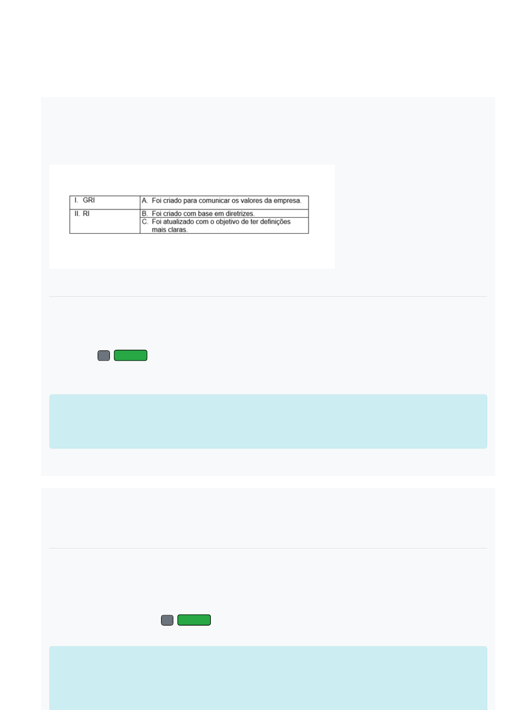 Gestão da responsabilidade social e ambiental Professor(a): Ana Carolina De Moraes Luccarelli (Mestrado acadêmico) 1) 2) Prepare-se! Chegou a hora de você testar o conhecimento adquirido nesta disciplina. A Avaliação Virtual (AV) é composta por questões objetivas e corresponde a 100% da média final. Você tem até cinco tentativas para “Enviar” as questões, que são automaticamente corrigidas. Você pode responder as questões consultando o material de estudos, mas lembre-se de cumprir o prazo estabelecido. Boa prova! Para basear as escolhas pelo modelo de indicador, muitas empresas escutam a opinião de seus stakeholders para ranquear os impactos que mais os atingem, além de levantar os interesses por temas relevantes na sua área de atuação. Os relatórios são ferramentas importantes para delimitar indicadores e fornecer informações ao público interessado. Leia e associe as duas colunas: Assinale a alternativa que traz a associação correta entre as duas colunas: Alternativas: I-B; II-C; II-A. I-C; II-B; II-A. I-C; II-A; I-B. ! CORRETO I-A; II-B; II-C. I-A; II-C; I-B. Código da questão: 59283 O relatório modelo __________ foi criado com o objetivo de auxiliar as organizações a elaborar relatos sobre o impacto dos seus negócios em temas _____________. Ganhou notoriedade ao se aliar ao __________, tornando-se uma organização independente em 2002. Assinale a alternativa que completa adequadamente as lacunas acima: Alternativas: RI; Econômicos; BNDES. RI; Financeiros; BNDES. Ethos; Econômicos; ONU. GRI; Socioambientais; PNUMA. ! CORRETO GRI; Financeiros; PNUMA. Resolução comentada: O modelo GRI foi criado com base em diretrizes e atualizado para ter definições mais claras, enquanto o RI foi criado para comunicar os valores da empresa (capitais). Resolução comentada: O relatório de sustentabilidade modelo GRI foi criado com o objetivo de auxiliar as organizações a elaborar relatos sobre o impacto dos seus negócios em temas como direitos humanos, mudanças climáticas e corrupção. A Global Reporting Initiative (GRI) foi criada em 1997 e ganhou notoriedade ao se aliar ao PNUMA, tornando-se uma organização independente em 2002. 15/06/2023 20:41 Página 1 de 5 3) 4) Código da questão: 59279 A responsabilidade social empresarial possui uma história que acompanhou os períodos históricos do surgimento do capitalismo, das revoluções industriais e dos eventos ambientais. Leia e associe as duas colunas: Assinale a alternativa que traz a associação correta entre as duas colunas: Alternativas: I-A; II-B; III-C. I-C; II-B; III-A. I-C; II-A; III-B. I-A; II-C; III-B. I-B; II-C; III-A. ! CORRETO Código da questão: 59248 O Índice de Sustentabilidade Empresarial (ISE), estruturado pela B3, é uma ferramenta que possibilita que as empresas meçam suas performances na área de RSE e negociem na bolsa de valores. Limite a alternativa que contém os principais conceitos básicos do ISE. Alternativas: Governança Corporativa e NBR 16001. ISO 26001 e Triple Bottom Line. Triple Bottom Line e Governança Corporativa. ! CORRETO ISO 26001 e Balanço Social. NBR 16001 e Balanço Social. Código da questão: 67708 Resolução comentada: No século XX houve o surgimento do princípio da caridade e do gerenciamento das ações sociais nas empresas. Na década de 1970 surgiram os primeiros termos sobre responsabilidade social empresarial, e na década de 1980 houve o aumento das pesquisas acerca do tema de responsabilidade social empresarial. Resolução comentada: Resolução comentada: O ISE se baseia nos conceitos do Triple Bottom Line, de Governança Corporativa, características gerais e natureza do produto. 15/06/2023 20:41 Página 2 de 5 5) 6) 7) O Crédito de Descarbonização (CBio) funciona como ferramenta da ____________ para alcançar as metas anuais de ___________ relacionadas ao setor de combustíveis. Neste modelo, há metas anuais de decarbonização para distribuidores de combustíveis fósseis, que são calculadas de forma proporcional aos combustíveis fósseis que _____________. Assinale a alternativa que completa adequadamente as lacunas acima: Alternativas: Política Nacional das Águas; Gastos; Exportam. Política Nacional de Biocombustíveis; Produção; Exportam. Política Nacional do Meio Ambiente; Produção; Economizam. Política Nacional do Meio Ambiente; Gastos; Comercializam. Política Nacional de Biocombustíveis; Descarbonização, comercializam. ! CORRETO Código da questão: 59258 Sobre as ações sociais, ambientais e de governança, podemos afirmar que: I. Possibilitam que as empresas aumentem sua competitividade enquanto geram avanços socioeconômicos. II. Tornaram-se importantes nas estratégias de negócios transformand-se em assunto da alta administração. III. Estimulam as empresas a adotarem inovações. IV. Pioram a competitividade das empresas e do país. V. A preservação ambiental diminui a produtividade dos recursos e a competitividade da empresa. São verdadeiras: Alternativas: I - II - IV. II - IV. I - II - III. ! CORRETO I - III - V. IV - V. Código da questão: 59268 De acordo com a pesquisa elaborada pelo Instituto de Pesquisa Capgemini (2020) sobre a percepção dos consumidores e executivos sobre as ações de sustentabilidade, considere as seguintes afirmações: ( ) Todos os consumidores compreendem os impactos das suas escolhas. ( ) A maior parte das organizações sabem que os consumidores estão dispostos a trocar uma marca conhecida se houver outra mais sustentável. ( ) Mais da metade dos consumidores consultados mudaram de marca por outras menos conhecidas, mas mais sustentáveis. ( ) A maior parte dos executivos dizem que ações sustentáveis fidelizaram clientes. ( ) A menor parte dos executivos diz que ações sustentáveis ajudam a aumentar a receita. Como a sustentabilidade está mudando fundamentalmente as preferências do consumidor Resolução comentada: Crédito de descarbonização é uma fe