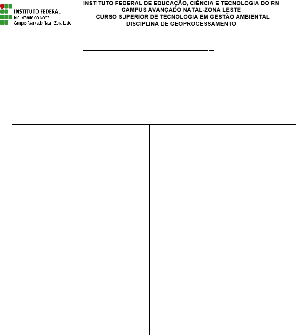 ATIVIDADE AVALIATIVA – MÓDULO III QUESTÃO 1 (5 pontos): Você deve pesquisar três modelos de GPS e fazer uma tabela descrevendo as funções de um, conforme exemplo fictício abaixo: MODELO GPS Escala Coordenadas que o Modelo escolhido apresenta Margem de erro Datum Principal Função D+ GPS 1:1.000 UTM 3 Metros Sirgas 2000 Elaboração de Mapas; Rotas, etc. Google Maps 1:25.000 Graus decimais (DD) Graus e minutos decimais (DMM) e Minutos e segundos (DMS) 20 metros WGS-84 Elaboração de mapas, rotas e indica meios de transporte alternativos. Waze Garmin 1:25.000 Longitude: o leste é positivo, e o oeste é negativo. Latitude: o norte é positivo e o sul é negativo 3 metros WGS-84 Melhores rotas e mostra como esta o trânsito em tempo real Apple Maps 1:25.000 (DD) e (DMS) 8 metros WGS-84 É o aplicativo de mapas padrão dos sistemas macOS, iOS, iPadOS e watchOS que fornece instruções de navegação e rotas. QUESTÃO 2 (5 pontos): Observe o mapa a seguir, identifique os principais pontos que estão destacados nele e responda: a) Informe ao menos três pontos que foram coordenados no mapa abaixo. (1 ponto); Escola Gama, Terreno p/ Sistema, UBS Gama. b) Qual a escala do mapa? (1 ponto); 1:100 000, 1 centímetro medido no mapa representa uma distância de 100 000 centímetros ou 1 quilômetro na superfície terrestre. c) Qual o DATUM? (1 ponto); GCS Sirgas 2000 d) Como futuro gestor ambiental, imagine que você deverá implantar um sistema de abastecimento de água na localidade de Gama/Viramundo no município de Antônio Martins-RN. Que elementos/pontos e informações relevantes deveriam estar elencados no mapa abaixo? (1 ponto); Um sistema de abastecimento de água é formado por diversas unidades, sendo elas: Manancial Captação Adução Tratamento Reservatório Rede de distribuição Ramal Domiciliar. Para se construir um sistema de distribuição de água é necessário realizar um estudo profundo da localidade e contar com mão de obra especializada. Antes de iniciar a construção de fato, é preciso definir a população que será atendida, a taxa de crescimento da cidade e quais as necessidades industriais. Baseado nessas informações se projeta o sistema para atender a população por muitos anos com qualidade. e) Elabore um texto informando como um mapa pode contribuir para a tomada de decisão de um gestor ambiental (1 ponto). É através do mapa que tomamos conhecimento de diferentes pontos da terra. Esses mapas representam pontos realisticos e mostram esses pontos de uma forma que determinam uma área da terra ou um espaço geográfico. Fonte: Programa Água Doce RN, 2017.