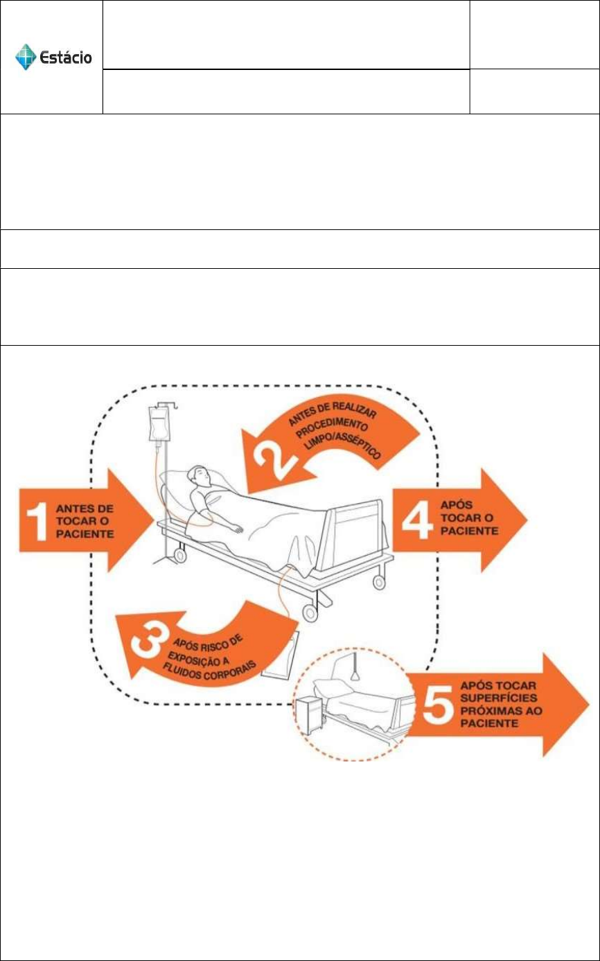 5 FACULDADE ESTÁCIO DE TERESINA Disciplina: Fundamentos do Cuidar em Enfermagem 1. HIGIENIZAÇÃO DAS MÃOS 2022.2 Definição: O termo “lavagem das mãos” foi substituído por “higienização das mãos”. “Higiene das mãos” é um termo geral, que se refere a qualquer ação de higienizar as mãos para prevenir a transmissão de micro-organismos por meio da higiene simples, a higiene antisséptica, a fricção antisséptica das mãos com preparação alcoólica, e a antissepsia cirúrgica das mãos. Responsável pela execução: Todos os profissionais envolvidos com a assistência à saúde Objetivo: - Prevenir a propagação das infecções relacionadas à assistência à saúde (IRAS) e consequentemente evitar que pacientes e profissionais de saúde adquiram infecções. - Prevenir e reduzir infecções causadas pelas transmissões cruzadas. Momentos para a Higienização das mãos: 1. Antes de tocar o paciente 2. Antes de realizar procedimento limpo/asséptico a) Antes de manusear um dispositivo invasivo, independentemente do uso ou não de luvas. b) Ao se mover de um sítio anatômico contaminado para outro durante o atendimento do mesmo paciente. 3. Após o risco de exposição a fluidos corporais ou excreções a) Após contato com fluidos corporais ou excretas, membranas mucosas, pele não íntegra ou curativo. 6 b) Ao se mover de um sítio anatômico contaminado para outro durante o atendimento do mesmo paciente. c) Após remover luvas esterilizadas ou não esterilizadas 4. Após tocar o paciente a) Antes e depois do contato com o paciente b) Após remover luvas esterilizadas ou não esterilizadas 5. Após tocar superfícies próximas ao paciente a) Após contato com superfícies e objetos inanimados (incluindo equipamentos para a saúde) nas proximidades do paciente. b) Após remover luvas esterilizadas ou não esterilizadas. 1.1 HIGIENIZAÇÃO SIMPLES: com sabonete líquido e água Finalidade: Remover os micro-organismos que colonizam as camadas superficiais da pele, assim como o suor, a oleosidade e as células mortas, retirando a sujidade propícia à permanência e à proliferação de micro-organismos. Duração do Procedimento: A higienização simples das mãos deve ter duração mínima de 40 a 60 segundos. Aplicação: Antes e após qualquer procedimento realizado em pacientes internados, ambulatoriais e de urgência e emergência e antes e após o contato direto de acompanhantes e visitantes com pacientes internados e de urgência e emergência. Materiais: Água, Sabão líquido e papel-toalha. Técnica: ● Certificar-se de que suas unhas estão curtas, bem apresentadas e lisas. ● Retire os adornos (anéis, aliança, pulseiras, relógio e outros) ● Arregace as mangas até a altura do cotovelo Etapas do procedimento Justificativa a. Abrir a torneira e molhar as mãos, evitando encostar-se na pia. A pia é uma área contaminada. Chegar mais próximo à pia aumenta o risco de se tocar a borda contaminada. Para molhar as mãos os dedos devem ficar para cima, fazendo com que a água escorra das pontas dos dedos até o pulso. b. Aplicar na palma da mão quantidade suficiente de sabão líquido para cobrir todas as superfícies das mãos. Utilize o produto em quantidade suficiente para cobrir completamente as mãos. 7 c. Ensaboar as palmas das mãos, friccionando-as entre si. O sabão limpa por emulsificação da gordura e do óleo, diminuindo a tensão da superfície. d. Esfregar a palma da mão direita contra o dorso da mão esquerda entrelaçando os dedos e vice-versa. A fricção e o atrito mecânico desprendem e removem a sujeira e as bactérias transitórias. e. Entrelaçar os dedos e friccionar os espaços interdigitais. Os dedos entrelaçados garantem que todas as superfícies sejam limpas. 8 f. Esfregar o dorso dos dedos de uma mão com a palma da mão oposta, segurando os dedos, com movimento de vai-e-vem e vice-versa. Necessário para assegurar que todas as superfícies das mãos e dedos estejam cobertas pelo sabão e lavadas. g. Esfregar o polegar direito, com o auxílio da palma da mão esquerda, utilizando-se movimento circular e vice-versa. Friccionar os polegares garante que todas as áreas das mãos sejam limpas. h. Friccionar as polpas digitais e unhas da mão esquerda contra a palma da mão direita, fechada em concha, fazendo movimento circular e vice-versa. A área sob as unhas pode ser altamente contaminada, o que aumenta o risco de transmissão da infecção a partir do enfermeiro para o paciente i. Esfregar o punho esquerdo, com o auxílio da palma da mão direita, utilizando movimento circular e vice-versa. A lavagem mecânica remove a sujidade e os microrganismos. 9 j. Enxaguar as mãos, retirando os resíduos de sabão, no sentido dos dedos para os punhos. Evitar contato direto das mãos ensaboadas com a torneira. Evitando que as sujidades das outras partes cheguem as extremidades dos dedos. k. Secar as mãos com papel-toalha descartável, iniciando pelas mãos e seguindo pelos punhos. Desprezar o papel-toalha na lixeira para resíduos comuns. A secagem da área mais limpa (ponta dos dedos) para a menos limpa (antebraços) evita a contaminação. A secagem impede as rachaduras e a pele áspera. 10 1.2 HIGIENIZAÇÃO ANTISSÉPTICA: sabão antisséptico/degermante e água Finalidade: Promover a remoção de sujidades e de microrganismos, reduzindo a carga microbiana das mãos, com auxílio de um antisséptico. Duração: A higienização antisséptica das mãos deve ter duração mínima de 40 a 60 segundos. Aplicação: Antes e após qualquer procedimento realizado em pacientes internados, ambulatoriais e de urgência e emergência. Especificamente, em casos de surto em pacientes com precauções de isolamento e em unidades de terapia intensiva (UTI). Materiais: Antisséptico degermante (clorexidina) e papel-toalha. Técnica: A técnica de higienização antisséptica é igual àquela utilizada para a higienização simples das mãos