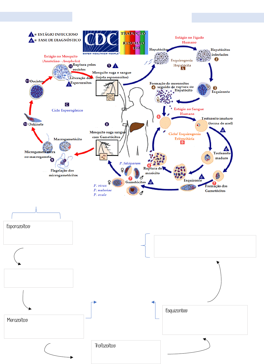 FORMAS INFECTANTES: Ciclo de vida forma inoculada na corrente sanguínea. Contaminam as células do fígado. No fígado formam esquizontes que produzem merozoítos saem das células hepáticas e caem na corrente sanguínea e infectam as hemácias. forma encontrada dentro das hemácias reprodução assexuada. Os merozoítos no sangue formam os esquizontes que davam origem a novos merozoítos e gametócitos (gametas). Ciclo sanguíneo O mosquito ao se alimentar ingere gametócitos os gametas (macho e fêmea) fecundam e dão origem os oocistos e forma aos esporozoítos. Ci clo n o m os qu ito Ciclo hepático