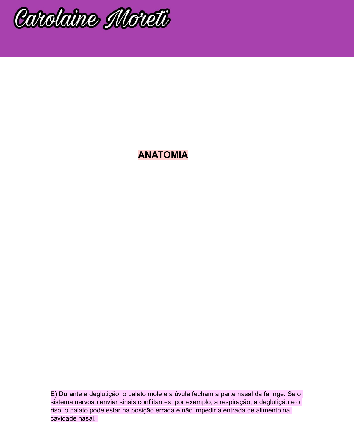ANATOMIA Questão 1: Na sua festa de casamento, Roberta e uma amiga estavam rindo descontroladamente enquanto tomavam tequila com polentas fritas. No meio da risada, começou a sair tequila pelo nariz de Roberta. Como isso ocorreu? A) Durante a deglutição, o palato mole e a úvula fecham a parte nasal da laringe. Se o sistema nervoso enviar sinais conflitantes, por exemplo, a respiração, a deglutição e o riso, o palato pode estar na posição errada e não impedir a entrada de alimento na cavidade nasal. B) Durante a deglutição, o palato duro e a úvula fecham a parte nasal da faringe. Se o sistema nervoso enviar sinais conflitantes, por exemplo, a respiração, a deglutição e o riso, o palato pode estar na posição errada e não impedir a entrada de alimento na cavidade nasal C)) Durante a deglutição, o palato duro e a úvula fecham a parte oral da laringe. Se o sistema nervoso enviar sinais conflitantes, por exemplo, a respiração, a deglutição e o riso, o palato pode estar na posição errada e não impedir a entrada de alimento na cavidade nasal. D) Durante a deglutição, o palato mole e a úvula fecham a parte oral da faringe. Se o sistema nervoso enviar sinais conflitantes, por exemplo, a respiração a deglutição e o riso, o palato pode estar na posição errada e não impedir a entrada de alimento na cavidade nasal. E) Durante a deglutição, o palato mole e a úvula fecham a parte nasal da faringe. Se o sistema nervoso enviar sinais conflitantes, por exemplo, a respiração, a deglutição e o riso, o palato pode estar na posição errada e não impedir a entrada de alimento na cavidade nasal. Questão 2: Maria Heloise chegou ao consultório do seu médico reclamando de uma dor intensa e constante no quadrante superior direito do abdome. A dor iniciou logo após ela comer peixe empanado, polentas fritas e milho na manteiga. Exames de laboratório e ultrassom revelaram a presença de cálculos nas vias bilifera extra-hepáticas. Por que a dor de Maria Heloise foi desencadeada pelo alimento que ela comeu? Onde a via bilifera, que originou a dor, irá lançar a bile? A) A ingestão de uma refeição gordurosa desencadeia a contração da vesícula biliar para a liberação de bile, todavia o bloqueio do ducto colédoco prejudica a secreção biliar, causando dor. O ducto colédoco se abre na papila maior localizada na parte descendente do duodeno. B) A ingestão de uma refeição gordurosa desencadeia a contração da vesícula biliar para a liberação de bile, contudo o bloqueio do ducto colédoco prejudica a secreção biliar, causando dor. O ducto colédoco se abre na papila maior localizada na parte ascendente do duodeno. C) A ingestão de uma refeição gordurosa desencadeia a contração da vesícula biliar para a liberação de bile, contudo o bloqueio do ducto cístico prejudica a secreção biliar, causando dor. O ducto cístico se abre na papila maior localizada na parte descendente do duodeno. D) A ingestão de uma refeição gordurosa desencadeia a contração da vesícula biliar para a liberação de bile, contudo bloqueio do ducto cístico prejudica a secreção biliar, causando dor. O ducto cístico se abre na papila maior localizada na parte descendente do intestino grosso. E) A ingestão de uma refeição gordurosa desencadeia a contração da vesícula biliar para a liberação de bile, contudo o bloqueio do ducto colédoco prejudica a secreção biliar, causando dor. O ducto colédoco se abre na papila maior localizada na parte descendente do intestino grosso. Questão 3: Dados os seguintes vasos de sangue: (1)artéria mesentérica superior. (2) artéria ilíaca comum. (3) tronco celíaco. (4) artéria renal. Quais deles são ramos impares da parte abdominal da aorta? A)1,2. B) 2,4. C) 1,3. D) 3,4. E) 2,3. Questão 4: Qual das seguintes afirmativas descreve corretamente o esôfago? A) O alimento adentra no esôfago a partir da parte pilórica do estômago. B) O movimento do alimento através do esôfago inteiro está sob o comando voluntário. C) O esôfago produz várias enzimas que auxiliam a digestão dos alimentos. D) O esófago possui o estreitamento aórtico que está relacionado à parte abdominal da aorta. E) O esôfago é um tubo muscular que se estende da faringe ao estômago. Questão 5: O número de pré-molares decíduos de "dentes do juízo" permanentes, é respectivamente: A) 0 e 4. B) 4 e 0. C) 2 e 8. D) 8 e 2. E) 12 e 8. Questão 6: Considere os seguintes itens sobre as artérias e as veias. I-A adventícia também apresenta vasos de sangue destinados à nutrição dos tecidos que compõem as diversas túnicas do próprio vaso. São pequenas artérias e veias que podem existir adventícia. Nas veias mais calibrosas, estão presentes na túnica media. Esses vasos são chamados de vasa vasorum, expressão em latim que significa "vasos dos vasos". II-Muitas veias apresentam elas apresentam válvulas, as pregas membranosas na camada interna da veia, em forma de bolso, que estão ausentes nas artérias. Estão ausentes as válvulas nas veias do cérebro e em algumas veias do tronco e do pescoço. III-O numero de artérias é maior do que o das veias, na o só porque é muito habitual a existência de duas artérias satélites acompanhando uma veia, mas pela existência de um sistema de artérias superficiais às quais não correspondem as veias. Em geral, há duas artérias acompanhando uma veia, porém, há exceções, por exemplo, no pênis e no cordão umbilical, onde há duas veias e uma artéria. A) Todos os itens estão corretos. B))Todos os itens estão incorretos. C) Somente o item I está incorreto. D) Somente o item ll está incorreto. E) Somente o item III está incorreto. Questão 7:A partir da cavidade oral até o ânus, quais são os esfíncteres que controlam o trânsito do material ao longo do canal alimentar? Quais deles agem sob controle voluntário e por que? A) Esfíncter esofágico superior, esfíncter esofági