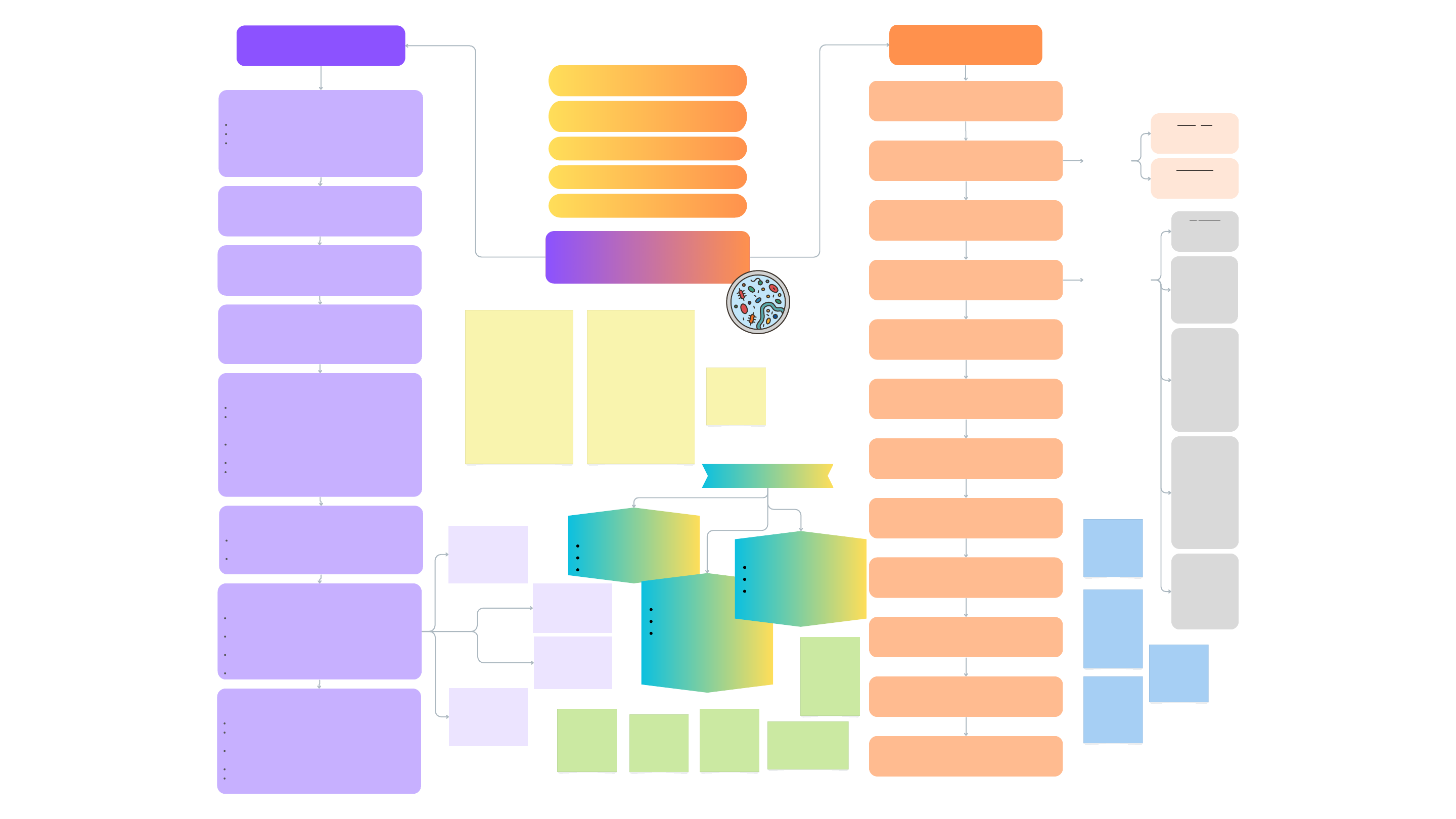 Microbiologia História criou o primeiro microscópio visualizou seres "animalículos" surgimentos de duas teorias: abiogênese (geração espontânea - acreditava-se que a vida surgia de matéria inanimada) e biogênese (a mais defendida - os seres vivos são originados a partir de outros seres vivos preexistentes) 1674 - ANTONY VAN LEEUWENHOEK ambientalista alemão Conceitos O estudo e a ciência dos microorganismos (MOs). Que só podem ser visualizados com equipamentos. Unicelulares, multicelulares e acelulares. Na veterinária se refere a agentes microbianos que acometem os animais. Bacteriologia (bactérias), Micologia (fungos), Virologia (vírus), Parasitologia (parasitas) e Protistologia (Reino Protista - algas, protozoários e protistas fungoids) Pode ser aplicada na indústria alimentícia e farmacêutica, agricultura, ecologia e desenvolvimento de doenças (medicina). 1668 - FRANCESCO REDI médico e cientista italiano realizou um experimento com potes de carnes que fez a teoria da abiogênese perder credibilidade. 1745 - JOHN NEEDHAM naturalista inglês realizou outro experimento, com um caldo nutritivo aquecido, onde a teoria da abiogênese voltou a ganhar força. 1770 - LAZZARO SPALLANZANI fisiologista italiano resolveu dar continuidade ao experimento do Needham, aqueceu o caldo por mais tempo, e a teoria da abiogênese voltou a perder credibilidade. derrubou definitivamente a teoria da abiogênese criou o método de pasteurização de alimentos (ponto de temperatura ideal para a bactéria não conseguir se multiplicar e degradar a estrutura) criou a teoria microbiana das doenças (sustenta que os microrganismos são a causa de inúmeras doenças) teoria microbiana da fermentação início das teorias sobre patogenicidade de microrganismos, infecções, contaminações e doenças humanas. 1862 - LOUIS PASTEUR cientista francês baseado nas teorias de Pasteur criou os primeiros métodos de desinfecção de campos operatórios o primeiro a utilizar fenol, sendo a primeira antissepsia realizada em cirurgia 1860 / 1865 - JOSEPH LISTER médico inglês descobriu os agentes etiológicos do antraz, tuberculose e cólera foi o primeiro a cultivar em meio sólido, onde ele isolou para determinar um tipo de bactéria desenvolveu os Postulados de Koch - "teoria do germe da doença" os MOs podem ser causadores de doenças 1882 - ROBERT KOCH médico alemão O MO patógeno suspeito precisa estar presente em todos os casos da doença e ausente em animais sadios. 1. 2. O MO patógeno suspeito deve ser cultivado em cultura pura. 3. Células de uma cultura pura do MO patógeno suspeito devem causar doença em um animal sadio 4. O MO patógeno suspeito deve ser reisolado, de forma a se demonstrar ser a mesma amostra original se preocupava muito com os problemas da Microbiologia fazia diversos experimentos com diversos tipos de antissépticos em variados meios de cultura observou que o acido fênico tinha mais efeito sobre os leucócitos do que nos microrganismos descobriu um fungo, o Penicilium a substância isolada do fungo, recebeu o nome de Penicilina 1928 - ALEXANDER FLEMING médico e bacteriologista britânico Agente etiológico: causador da doença. Vetor: transmissor da doença. PODE SER: Biológico (há a multiplicação do parasito no vetor) Mecânico (sem multiplicação do parasito no vetor) Período de incubação: momento exato entre a infecção e o aparecimento dos 1º sintomas. Patogenicidade: a capacidade do MO de causar a doença. Virulência: a severidade e rapidez do MO em provocar a doença. Prevenção: medidas para evitar a doença. Profilaxia: medidas contra a doença já estabelecida. Incidência: casos novos da doença. GRAUS DE PATOGENICIDADE: Prevalência: os casos novos com casos antigos da doença. Epidemia: doença que ultrapassa a incidência esperada. Saprófitas Sem doença – bactéria ambiental Pandemia: epidemias simultâneas em vários continentes. Endemia: prevalência de determinada doença em uma área geográfica restrita. Organismos comensais Colonização de tecido do hospedeiro – sem doença Espécies simbióticas Relação benéfica para o hospedeiro; colonizam tecido do hospedeiro – microrganismos parasitas com benefícios mútuos Parasitas oportunistas Colonizam tecido do hospedeiro (em geral podem ser comensais) e provocam doença com lesão tecidual ou alteração no ambiente Microrganismos patogênicos A infecção causa doença diretamente (embora esta possa ser específica do hospedeiro) Hospedeiro: o organismo que alberga o parasito. Parasito: o ser vivo de menor porte que vive associado a outro ser vivo de maior porte, à custa ou na dependência deste. Ectoparasito: vive externamente no corpo do hospedeiro Endoparasito: vive dentro do corpo do hospedeiro. Micro-organismo Microrganismo Micróbio Procariontes são organismos unicelulares que não possuem o nível de complexidade interna associada aos eucariotas, e em particular não possuem núcleo nem mitocôndria, material genético disperso no citoplasma. células que não apresentam envoltório nuclear domínios Bacteria e Archaea Eucariontes todos os seres vivos com células eucarióticas, ou seja, com um núcleo celular cercado por uma membrana e com várias organelas células que apresentam núcleo, ou seja, apresentam o material genético envolvido pelo envoltório nuclear fungos, protozoários, animais e vegetais Três Domínios Procariontes geralmente quimiotróficos muitos são extremófilos Archea Procariontes unicelulares engloba bactérias que causam doenças ao homem e também aquelas encontradas em ambientes como a água e o solo Bacteria eucariontes unicelulares e multicelulares fungos, protozoários, animais e vegetais Eukarya Quimiotróficos Organismos que utilizam compostos químicos como fonte de energia Fototróficos Organismos que usam a luz (principalmente do sol) como fonte de energia Extremófilos aqueles que vivem em ambientes com condições que são considera