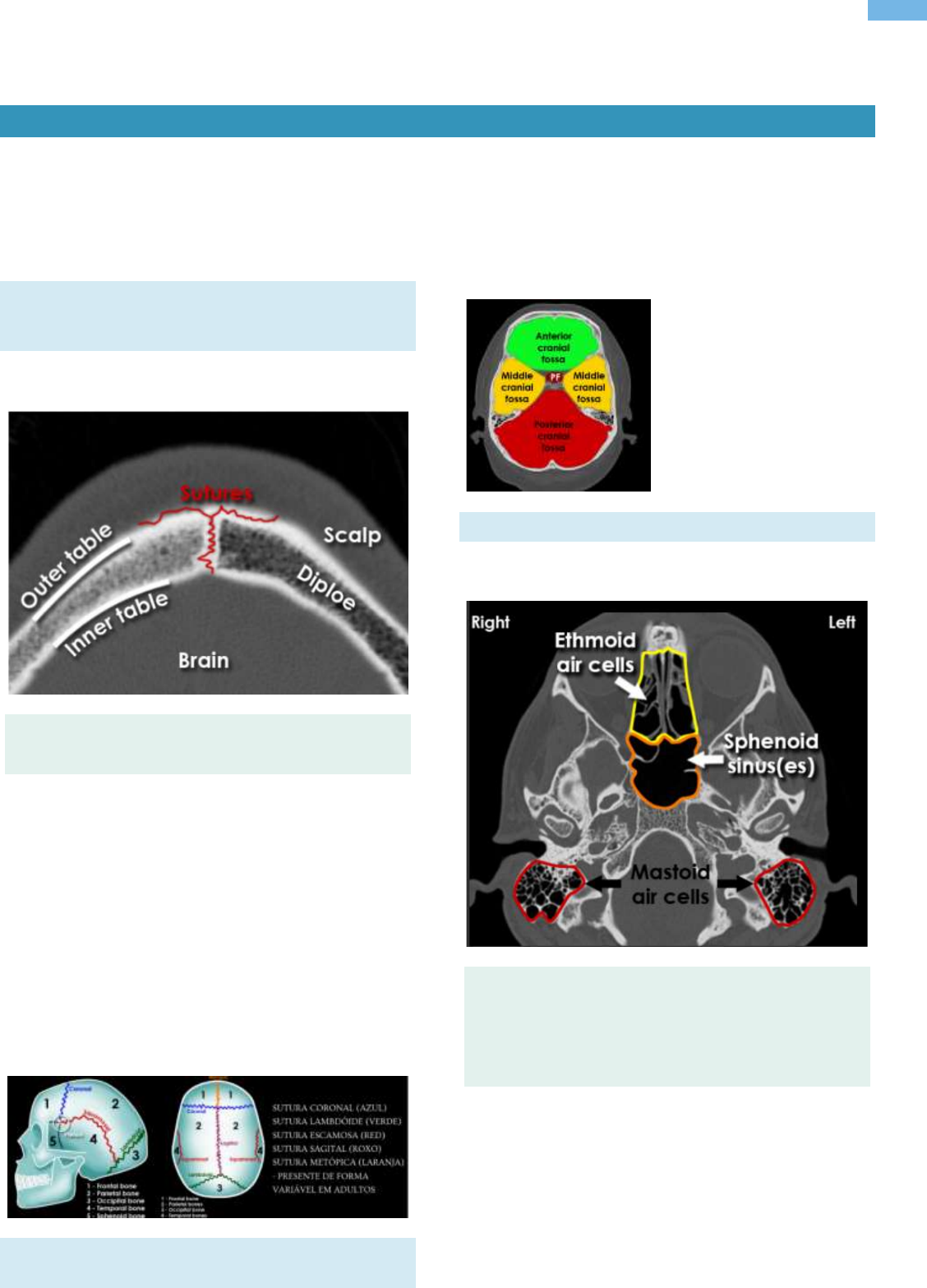 1 Laís Flauzino | DIAGNÓSTICO POR IMAGEM | 7°P Encéfalo 4M3 – O CRÂNIO E O ENCÉFALO • Anatomia • Ossos e suturas • Meninges • Parênquima • Territórios vasculares • Lesões vasculares ESTRUTURA ÓSSEA DO CRÂNIO – TOMOGRAFIA CEREBRAL – (JANELAS ÓSSEAS) Observe a aparência das suturas do crânio que são irregulares - não deve ser confundido com fraturas que são tipicamente retas Os ossos do crânio se formam separadamente e depois se juntam em suturas – articulação entre os ossos. São feitas para serem rígidas/fixas. Suturas As principais suturas do crânio são as suturas coronal, sagital, lambdoide e escamosa. • A sutura metópica (ou sutura frontal) está presente de forma variável em adultos. • Sutura coronal - une o osso frontal com os ossos parietais sutura sagital - une os 2 ossos parietais na linha média • Sutura lambdoide - une os ossos parietais com o osso occipital • Sutura escamosa - une as escamosas porção do osso temporal com os ossos parietais • Sutura metópica - (se presente) une os 2 ossos fontais FOSSAS CRANIANAS – TC (JANELAS ÓSSEAS) • Fossa craniana anterior - acomoda a parte anterior dos lobos frontais • Fossa craniana média - acomoda os lobos temporais • Fossa craniana posterior - acomoda o cerebelo e o tronco encefálico • Fossa pituitária (pf) - acomoda a glândula pituitária SEIOS NASAIS - TC (JANELAS ÓSSEAS) O seio esfenoidal e as células aéreas etmoidais são contínuos com as vias aéreas nasais as células aéreas da mastóide são contínuas com o ouvido médio Alguns ossos são aerados – temporal nas mastoides, esfenoide, etmoide, seios frontais. Importância: processos inflamatórios. São estruturas que devem estar pretas – cheias de ar, mas se tiver inflamação vai ficar cinza – espessamento mucoso ou acúmulo de líquido dentro dos seios. Os seios frontais são altamente variáveis na aparência. Muitas pessoas não têm seios frontais (imagem inferior). 2 Laís Flauzino | DIAGNÓSTICO POR IMAGEM | 7°P Seios nasais – TC (janelas ósseas): O espessamento da mucosa é um achado incidental muito comum. Este paciente – que apresentava sintomas de coriza – teve uma TC normal após traumatismo craniano. MENINGES – TC (JANELA PARÊNQUIMA): Pontos chave: o conhecimento da anatomia das meninges é essencial para entender as aparências tomográficas do sangramento intracraniano. As meninges são finas camadas de tecido encontradas entre o cérebro e a tábua interna do crânio. As meninges compreendem: • a dura-máter (camada externa e camada interna) • a aracnóide e • a pia-máter. A dura-máter e a aracnóide são uma unidade anatômica, separadas apenas por processos patológicos. A foice do cérebro e a tenda do cerebelo são dobras espessas das meninges visíveis na tc. Em outros lugares, as camadas meníngeas não são visíveis na tc, pois estão aplicadas de perto na tábua interna do crânio. Meninges: - TC (janela parênquima): • Dura-máter = camada externa resistente, aplicada de perto à mesa interna do crânio Está logo acima do periósteo, tábua interna do crânio. Reveste todo sistema nervoso – desde cérebro até medula sacral. • Aracnóide = camada fina aplicada intimamente à dura-máter • Espaço subaracnóideo = espaço entre a aracnóide e a pia-máter que contém delicado tecido conjuntivo trabeculado e LCR • Pia mater = camada muito fina aplicada na superfície do cérebro Biconvexa – em cima, colado à dura – limão – epidural. Subdural – entre as duras – forma de foice. Subaracnoide – vai se entremeando. Meninges – TC (janela parênquima): • A tenda do cerebelo - uma dobra interna da dura-máter - forma uma folha semelhante a uma tenda que separa o cérebro (cérebro) do cerebelo • O tentório é ancorado pelos ossos petrosos. • Em imagens de tc de corte axial do cérebro, o tentório é levemente visível passando sobre o cerebelo. • No contexto de hemorragia subaracnóidea ou hematoma subdural, a tenda pode tornar-se mais densa devido à camada de sangue. Meninges – TC (janela parênquima): 3 Laís Flauzino | DIAGNÓSTICO POR IMAGEM | 7°P • A foice é uma dobra interna das meninges que fica na linha média e separa os hemisférios cerebrais esquerdo e direito. • Processos patológicos podem causar 'efeito de massa' com desvio da foice para um lado. • Imagens de tc de corte coronal mostram que a tenda do cerebelo é contínua com a foice do cérebro. • Meningiomas são tumores intracranianos benignos que podem surgir de qualquer parte das meninges, incluindo a foice ou tentório. ESPAÇOS LIQUÓRICOS – TC (JANELA PARÊNQUIMA): O cérebro é cercado por líquido cefalorraquidiano (lcr) dentro dos sulcos, fissuras e cisternas basais. O lcr também é encontrado centralmente nos ventrículos. Os sulcos, fissuras, cisternas basais e ventrículos juntos formam os 'espaços do lcr', também conhecidos como 'espaços extra-axiais'. O lcr é de menor densidade do que a substância cinzenta ou branca do cérebro e, portanto, aparece mais escuro nas imagens de tc. Uma apreciação das aparências normais dos espaços do lcr é necessária para permitir a avaliação do volume cerebral. A superfície do cérebro é formada por dobras do córtex cerebral conhecidas como giros. Entre esses giros existem sulcos, conhecidos como sulcos, que contêm lcr. As fissuras são grandes fendas cheias de lcr que separam as estruturas do cérebro. Os ventrículos são espaços localizados no fundo do cérebro que contêm lcr. Tudo que está entre a pia mater e a aracnoide está preenchido por líquor – amortece o cérebro e limpeza. Líquor é produzido no plexo coroide – pode haver produção excessiva que faz dilatação de ventrículos – hidrocefalia. Espaços liquóricos – TC (janela parênquima): Gyrus = uma dobra da superfície do cérebro (plural = giros). Sulcus = sulco entre os giros que contém lcr (plural = 