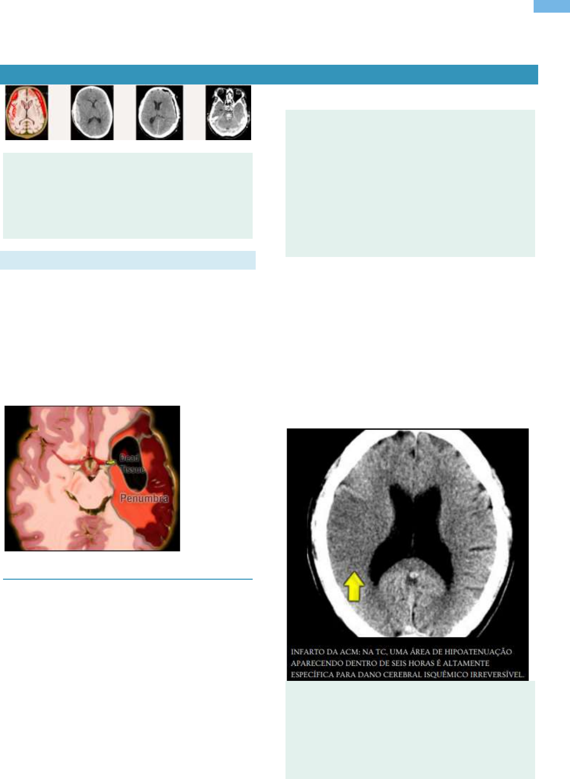 1 Laís Flauzino | DIAGNÓSTICO POR IMAGEM | 7°P Encéfalo 5M3 – INFARTO E HEMORRAGIAS TRAUMÁTICAS Infartou, morreu – se morreu célula, a parede da célula rompe espalha conteúdo célula ali no meio ativando toda cascata inflamatória. Parou o suprimento sanguíneo, um pedaço pelo menos do tecido vai morrer, o que fica em volta é reação inflamatória – área de penumbra. Na TC fica preto. Na ressonância brilha. INFARTO AGUDO: O objetivo da imagem em um paciente com AVC agudo é: • excluir hemorragia; • diferenciar entre tecido cerebral irreversivelmente afetado e tecido reversivelmente danificado (tecido morto versus tecido em risco); • identificar estenose ou oclusão das principais artérias extra e intracranianas; Desta forma, podemos selecionar pacientes candidatos à terapia trombolítica. SINAIS PRECOCES DE ISQUEMIA – FASE HIPERAGUDA (<12H): A TC tem a vantagem de estar disponível 24 horas por dia e é o padrão ouro para hemorragia. A hemorragia nas imagens de RM pode ser bastante confusa. Na tc, 60% dos infartos são vistos dentro de 3-6 horas e praticamente todos são vistos em 24 horas. A sensibilidade geral da tc para diagnosticar AVC é de 64% e a especificidade é de 85%. Abaixo estão listados os primeiros sinais tomográficos de infarto cerebral. • Parênquima cerebral hipodenso • Obscurecimento dos núcleos da base • Perda da diferenciação entre substância branca e cinzenta • Artéria cerebral média hiperdensa • Sinal da fita insular • Apagamento dos sulcos Sinais de AVC agudo: parênquima cerebral hipodenso na TC, obscurecimento dos núcleos da base, perda diferenciação entre substância branca e cinzenta (sinal da fita). Artéria cerebral pode ficar hiperdensa pq se o parênquima está menos denso, acaba realçando o vaso. E eventualmente esse vaso já está cheio de placa ateromatosa – fica muito mais evidente. Apagamento dos sulcos: se tem reação inflamatória no local tem edema – o cérebro que morre gera inchaço das estruturas envolta e acaba apagando sulcos e fissuras. Tecido cerebral hipoatenuante: A razão pela qual vemos isquemia na tc é que na isquemia o edema citotóxico se desenvolve como resultado da falha das bombas iônicas. Estes falham devido a um suprimento inadequado de atp. Um aumento de 1% no conteúdo de água cerebral resultará em uma diminuição da atenuação do tc de 2,5 hu. À esquerda, um paciente com tecido cerebral hipoatenuante no hemisfério direito. O diagnóstico é de infarto, pela localização (território vascular da artéria cerebral média (acm) e pelo envolvimento da substância cinzenta e branca, também muito típico de infarto. Lado esquerdo: diferença entre substância cinzenta (branca por fora) e substância branca (preta dentro); dá para ver o contorno do giro e sulcos bem preservados, parênquima com densidade normal. Lado direito: parênquima hipodenso, sem diferenciação entre substância branca e cinzenta, apagamento geral dos sulcos – sinais de morte celular – infarto em fase aguda. Território de ACM. 2 Laís Flauzino | DIAGNÓSTICO POR IMAGEM | 7°P Hipodensidade na TC, se fosse RM seria hipersinal em T2 e FLAIR. Na difusão, tudo o que é edema, o líquido fica restrito e restrição à difusão brilha. A hipoatenuação na tc é altamente específica para dano cerebral isquêmico irreversível se for detectada nas primeiras 6 horas. Pacientes que apresentam sintomas de avc e que demonstram hipodensidade na tc nas primeiras seis horas demonstraram ter maiores volumes de infarto, sintomas mais graves, evolução clínica menos favorável e até mesmo maior risco de hemorragia. Portanto, sempre que você vê hipodensidade em um paciente com acidente vascular cerebral, isso significa más notícias. Nenhuma hipodensidade na tc é um bom sinal. Corte de tc mostrando lesão hipodensa em forma de cunha (cabeça de seta), no hemisfério cerebral direito, com compressão ventricular e desvio de estruturas da linha média. Corte de tc mostrando lesão hipodensa em forma de cunha (setas brancas), no hemisfério cerebral direito, com compressão ventricular (cabeça de seta branca) e desvio de estruturas da linha média. Apagamento da fissura silviana e obscurecimento dos núcleos da base (cabeça de seta preta). Insula esquerda normal (seta preta). Obscurecimento dos núcleos da base: O obscurecimento dos núcleos da base é um sinal importante de infarto. É visto no infarto da artéria cerebral média e é um dos primeiros e mais frequentes sinais. Os núcleos da base estão quase sempre envolvidos no infarto da acm. Ramos lenticulares provocam infartos redondos – a área que cada uma dessas artérias irriga é menor. Quando o infarto é no núcleo da base, na ínsula, geralmente são menores – infartos lacunares. Sinal da fita insular: Isso se refere à hipodensidade e inchaço do córtex insular. É um sinal tomográfico inicial muito indicativo e sutil de infarto no território da artéria cerebral média. Essa região é muito sensível à isquemia por ser a mais afastada do fluxo colateral. Tem de diferenciar-se da encefalite herpética. Perda da diferenciação do córtex insular – hipodensidade. Perda de diferenciação corticomedular. A perda de definição da fita insular é outro sinal de infarto agudo. A fita insular esquerda não é claramente vista nesta imagem. O paciente apresentou uma hemiparesia direita densa. Informações clínicas: hemiparesia direita de início agudo. Hiperdensidade da cerebral média – sinal da corda: Isso é resultado de trombo ou êmbolo na mca. Abaixo esquerda, um paciente com um sinal de mca denso. Na angiografia por tc, a oclusão da mca é visível. 3 Laís Flauzino | DIAGNÓSTICO POR IMAGEM | 7°P Nos infartos acaba realçando essa densidade pq o parênquima em volta está mais preto. Não é normal ver os vasos – se está branco e vê está errado. INFARTOS HEMORRÁGICOS: 15% dos infartos da MCA são inicialmen