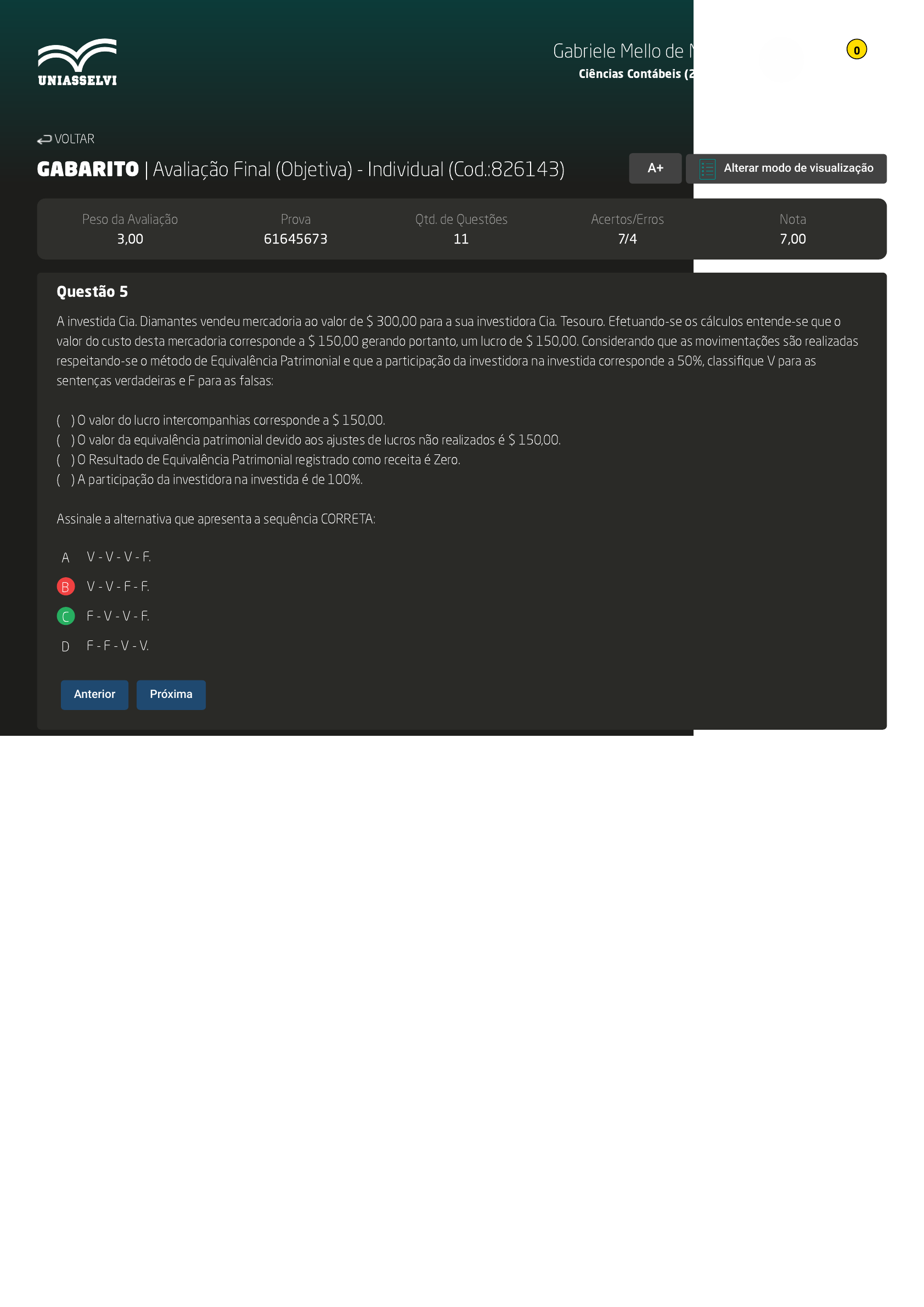 GABARITO | Avaliação Final (Objetiva) - Individual (Cod.:826143) Peso da Avaliação 3,00 Prova 61645673 Qtd. de Questões 11 Acertos/Erros 7/4 Nota 7,00 Questão 5 A investida Cia. Diamantes vendeu mercadoria ao valor de $ 300,00 para a sua investidora Cia. Tesouro. Efetuando-se os cálculos entende-se que o valor do custo desta mercadoria corresponde a $ 150,00 gerando portanto, um lucro de $ 150,00. Considerando que as movimentações são realizadas respeitando-se o método de Equivalência Patrimonial e que a participação da investidora na investida corresponde a 50%, classifique V para as sentenças verdadeiras e F para as falsas: ( ) O valor do lucro intercompanhias corresponde a $ 150,00. ( ) O valor da equivalência patrimonial devido aos ajustes de lucros não realizados é $ 150,00. ( ) O Resultado de Equivalência Patrimonial registrado como receita é Zero. ( ) A participação da investidora na investida é de 100%. Assinale a alternativa que apresenta a sequência CORRETA: A V - V - V - F. B V - V - F - F. C F - V - V - F. D F - F - V - V. VOLTAR A+ Alterar modo de visualização Anterior Próxima Gabriele Mello de Moraes Ciências Contábeis (2551109) 0