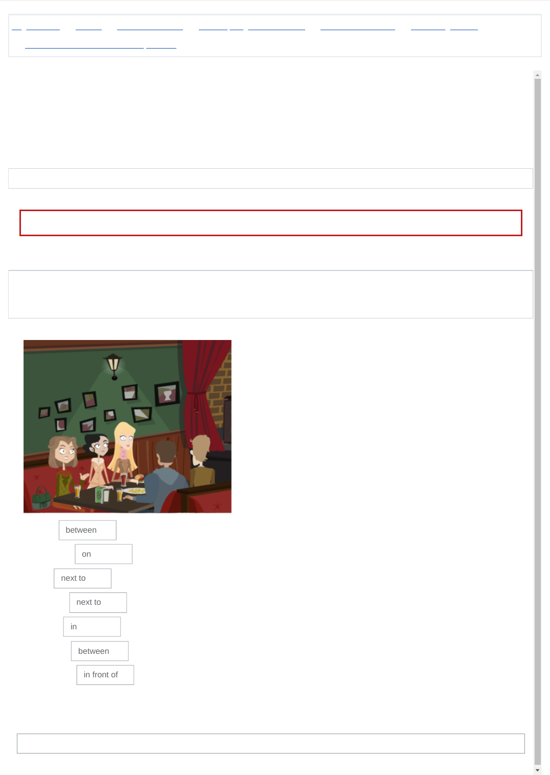 18/06/2023, 11:45 3.12 Teste seus conhecimentos: positions: Revisão da tentativa https://aprendamais.mec.gov.br/mod/quiz/review.php?attempt=819715&cmid=15988 1/2 Página inicial / Cursos / Turmas anteriores / Idiomas, Línguas e Literatura / INGLÊS12022AAbril / 3 How to get there / 3.12 Teste seus conhecimentos: positions Iniciado em segunda, 13 jun 2022, 14:03 Estado Finalizada Concluída em segunda, 13 jun 2022, 14:07 Tempo empregado 3 minutos 57 segundos Notas 6,00/7,00 Avaliar 8,57 de um máximo de 10,00(86%) Informação Questão 1 Parcialmente correto Atingiu 6,00 de 7,00 Observe the image. Complete the sentences writing the corresponding preposition from the box. a) Rosa is Christine and Carly. b) The Coke is the table. c) Billy is Dube. d) The bag is Christine. e) They are the pub. f) The lamp is the table. g) The girls are the boys. between on next to next to in between in front of ◄ 3.11 Prepositions and expressions of place Seguir para... 3.13 Days of the week ► https://aprendamais.mec.gov.br/ https://aprendamais.mec.gov.br/course/index.php https://aprendamais.mec.gov.br/course/index.php?categoryid=17 https://aprendamais.mec.gov.br/course/index.php?categoryid=23 https://aprendamais.mec.gov.br/course/view.php?id=372 https://aprendamais.mec.gov.br/course/view.php?id=372#section-3 https://aprendamais.mec.gov.br/mod/quiz/view.php?id=15988 https://aprendamais.mec.gov.br/mod/page/view.php?id=15987&forceview=1 https://aprendamais.mec.gov.br/mod/page/view.php?id=15989&forceview=1 18/06/2023, 11:45 3.12 Teste seus conhecimentos: positions: Revisão da tentativa https://aprendamais.mec.gov.br/mod/quiz/review.php?attempt=819715&cmid=15988 2/2 Resumo de retenção de dados Obter o aplicativo para dispositivos móveis https://aprendamais.mec.gov.br/admin/tool/dataprivacy/summary.php https://download.moodle.org/mobile?version=2020110904&lang=pt_br&iosappid=633359593&androidappid=com.moodle.moodlemobile