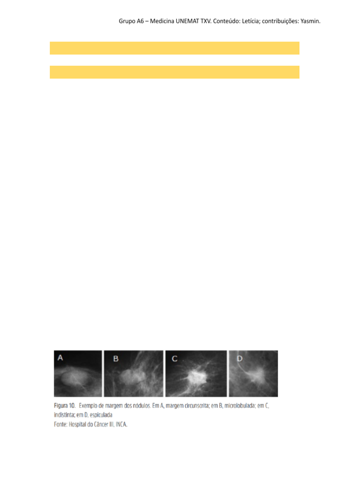 MASTOLOGIA COBRADO NO AMBULATÓRIO O que é BIRADS? Padronização / léxico universal dos achados imaginológicos da mama. Se é imagiológico, inclui todos os exames de imagem da mama (USG; RNM; MMG). Sendo definido em 7 categorias. → Ela pergunta como é formada a imagem na USG e MMG; → Qual posição a paciente se encontra durante os exames → MMG = em pé; USG = deitada; RNM = decúbito ventral (mama pendulada) → importante saber para acompanhamento do nódulo. A professora gosta que descreve as imagens seguindo a sistematização (SBM, 2017): FORMA → USG / MMG ● Redonda; ● Irregular; ● Oval; MARGEM → USG / MMG ● Circunscrita: ● Não-circunscritas, podem ser: microlobuladas (pequenas ondulações), indistintas, anguladas e espiculadas. ECOTEXTURA → USG ● Anecóica; ● Hipoecogênica; ● Cístico- -sólida; ● Isoecogênica; ● Heterogênea; ORIENTAÇÃO→ USG ● Paralela à pele→ maior diâmetro latero-lateral; ● Não paralela → maior diâmetro antero-posterior. EFEITO ACÚSTICO POSTERIOR → USG ● Sombra associada; ● Reforço acústico. CALCIFICAÇÕES → não é visto em ultrassom ● Cutânea; vascular; em pipoca; bastonete; redonda; reiniforme; distrófica; leite de cálcio; pleomórfica; linear; heterogênea; amorfa; sutura. ACHADOS ASSOCIADOS ● Distorção arquitetural; Alterações ductais; Alterações de pele Edema Vascularização (no interior da lesão, periférica ou em região de hilo) MAMOGRAFIA → tem que saber a incidência e a localização da lesão, exemplo: infero lateral. Ela também pergunta se é digital (a imagem é melhor, tem menos artefatos) ou digitalizada. 1) Incidências da mamografia. São realizadas como rotina duas incidências mamográficas ortogonais em cada mama: as incidências mediolateral-oblíqua (MLO) e craniocaudal (CC). julia Imagem Posicionada julia Destacar julia Destacar julia Destacar julia Imagem Posicionada 1 = Quadrantes superiores 3 = Quadrantes laterais 2 = Quadrantes inferiores 4 = Quadrantes mediais 2) Localização das lesões Qual tamanho o nódulo se torna palpável? A partir de 1 cm. → O que escrever em uma conduta para BIRADS 1: quem decide não é quem dá o laudo; é o médico assistente, então deve-se escrever: conduta conforme idade. → Ela pede exemplo do que pode ser encontrado em cada BIRADS, na MMG, USG e RNM. → Exemplos de BIRADS 2: cistos simples; linfonodos intramamários; ectasia ductal; hamartomas; lipomas; prótese mamária. → Ela pergunta os valores preditivos positivos do BIRADS 4 e 5. → Ela pede para descrever os nódulos no USG (sempre seguir a sistematização). Quando uma imagem é classificada como BIRADS 0? Quando encontramos um nódulo circunscrito na mamografia e este é o primeiro exame da paciente que está iniciando o rastreamento, a categoria é 0 no BIRADS®, normalmente indica-se a complementação com ultrassom. Ou quando a paciente tem menos que 35 anos e verifica-se uma imagem suspeita. Diagnóstico diferencial para lesões com achados provavelmente malignos (BIRADS 5) o cicatrizes cirúrgicas; o áreas de necrose gordurosa e cicatriz radiada. Câncer de mama mais comum? Carcinoma ductal invasivo Quais exames de rastreio devem ser realizados para pacientes em tratamento de CA de mama? ● RX tórax; ● TC tórax; ● TC de abdome; USG de abdome total → avaliação do fígado; ● Cintilografia do corpo inteiro → avaliação óssea; ● Hemograma → avaliar leucopenia e anemia; ● Marcador tumoral; ● RNM ou TC crânio → quando paciente tiver sintomas como: dor de cabeça; tontura. Descarga papilar: ● Obtidas apenas após expressão, são consideradas fisiológicas → não merecem avaliação adicional; ● Descarga espontânea → deve ser considerada patológica → proceder com investigação adicional. ● Descarga espontânea leitosa ou galactorreia→ gravidez e puerpério, uso de alguns medicamentos, hipotireoidismo, hiperprolactinemia, processos neoplásicos em diversos sítios; ● Descarga de cor esverdeada → relacionada a presença de substâncias ligadas ao colesterol o que não sugere infecção ou malignidade subjacente. Também típica de ectasia ductal. ● Descarga papilar coloração de “água de rocha” → papiloma intraductal ou carcionoma; ○ Papiloma intraductal: acometimento benigno (são pólipos simples no ducto lactífero). julia Destacar julia Destacar julia Destacar julia Destacar julia Destacar julia Destacar Quais os marcadores tumorais da mama? ● CEA → marcador no sangue e no tecido ● CA 15-3 → marcador tumoral usado no acompanhamento de pacientes com câncer de mama. O "alvo" detectado nos ensaios de CA 15-3 é uma glicoproteína, produto do gene MUC1. Qual exame solicitar quando paciente faz uso de anastrozol? Densitometria óssea. Anastrozol tem como efeito colateral a osteoporose. Características farmacológicas: inibidor não-hormonal da aromatase e altamente seletivo. Diferença entre fibroadenoma e tumor filoides histologicamente? ● Fibroadenoma: Composto de tecido fibroso e glandular, resultante de proliferação de tecido conjuntivo estromal especializado do lóbulo → segundo a prof, a proliferação é de células epiteliais ● Tumores filoides começam fora dos ductos e lóbulos, no tecido conjuntivo da mama, chamado estroma, que inclui o tecido adiposo e ligamentos que cercam os ductos, lóbulos, e os vasos sanguíneos e linfáticos → segundo a prof, a proliferação é de células mesenquimais. Diferença da disseminação do tumor filoides e do carcinoma. ● Carcinoma: disseminação linfática; ● Filoides: disseminação hematogênica. RESUMO - CONTEÚDO ● Fases do exame clínico: ● Anamnese; ● Inspeção estática e dinâmica; ● Palpação; ● Expressão papilar; ● Exame dos linfonodos axilares e supraclaviculares. ● Anamnese: o QPD o HDA (Esmiuçar a queixa da paciente) o Antecedentes pessoais e ginecológicos - Menarca (idade): - Menopausa 