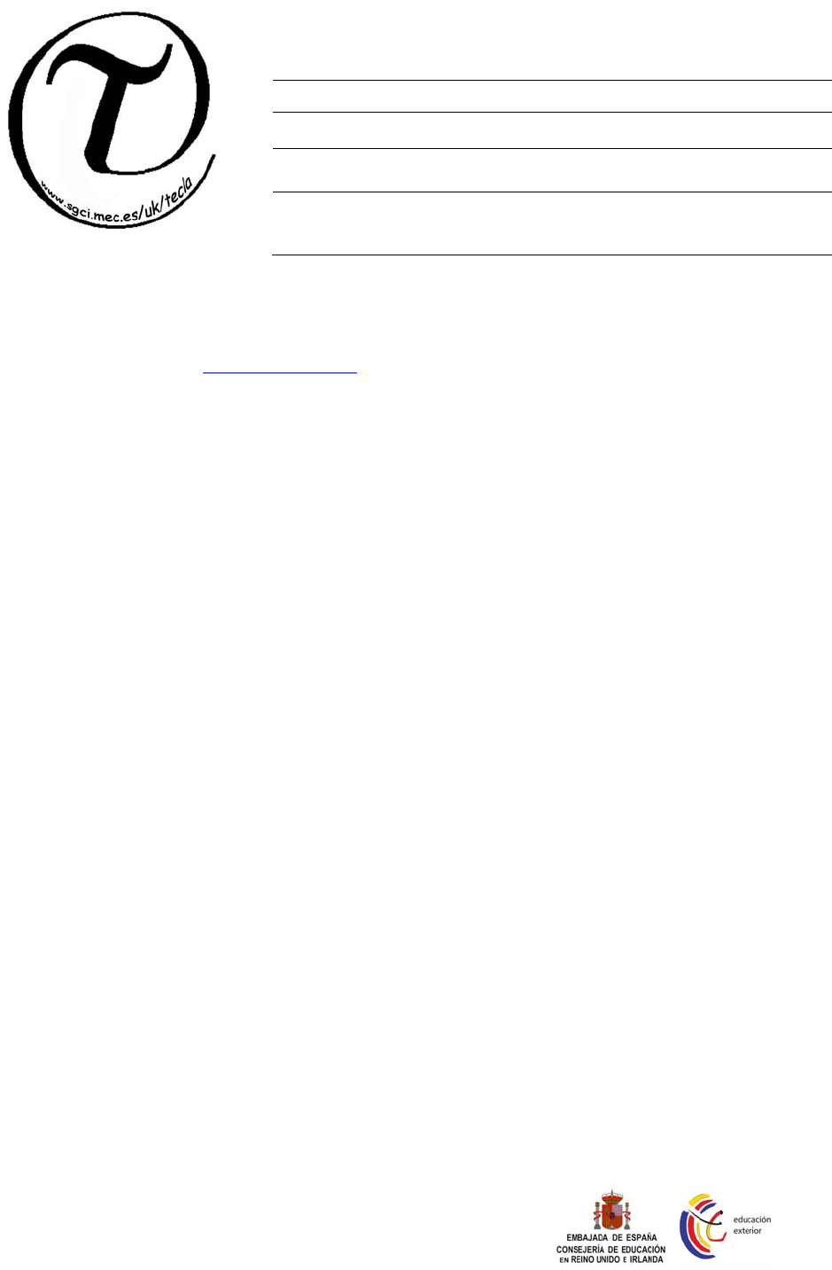 © Consejería de Educación en el Reino Unido e Irlanda - 1 - TECLA. REVISTA ELECTRÓNICA DE LA CONSEJERÍA DE EDUCACIÓN EN EL REINO UNIDO E IRLANDA Fecha 7 de abril de 2006 NIPO: 651 – 05 – 081 - 9 Nivel B1 Intermedio Título: ¿CONOCES ESPAÑA? Autores: Martin Moseley y Rosa Salvador Giménez. St Peter’s Collegiate School. Wolverhampton. Materiales necesarios: un mapa político/físico de España, un ordenador y un mapa mudo de España. Referencias: www.spain.info Antes de leer Tu profesor de español te ha pedido que ayudes a preparar cosas para un intercambio escolar (una visita) con un centro escolar de España. Antes de empezar a hacer los preparativos, tienes que hacer lo siguiente: 1. Mira esta lista estas ciudades españolas e identifica las 5 ciudades más grandes: Soria, Málaga, Oviedo, León, Cuenca, Valencia, Pontevedra, Cáceres, Zaragoza, Madrid, Toledo, Almería, Girona, Santander, Murcia. 2. En un mapa mudo de España, sitúa cada ciudad y estas zonas físicas del país: la sierra de Guadarrama; el río Guadalquivir; el río Ebro; la Cordillera Cantábrica; la Meseta; el Sistema Bético. 3. Observa la lista de las comunidades autónomas y empareja cada ciudad con una comunidad: Comunidad de Madrid, Castilla la Mancha, Principado de Asturias, Andalucía, Cantabria, Región de Murcia, Castilla y León, Cataluña, Aragón, Galicia. 4. En no más de cien palabras, escribe una nota a tu profesor, indicándole adónde prefieres ir y por qué. TECLA. REVISTA ELECTRÓNICA DE LA CONSEJERÍA DE EDUCACIÓN EN REINO UNIDO E IRLANDA © Consejería de Educación en el Reino Unido e Irlanda - 2 - Texto España es un país lleno de contrastes, tanto por su geografía y clima como por su cultura. Situada al suroeste de Europa, España, que limita con Portugal y Francia, posee una geografía muy variada, con numerosas playas, montañas, ríos, bosques y desiertos. Al sur y al este de España se disfruta de inviernos cálidos y de veranos calurosos, mientras que en el interior y el norte las temperaturas son más extremas. Consta de diecisiete comunidades autónomas y de dos ciudades autónomas, Ceuta y Melilla. Madrid es la capital del país. La población española cuenta con unos 44.108.530 habitantes. 4 millones de ellos son inmigrantes de origen magrebí, subsahariano, de Europa del Este y latinoamericano. El idioma oficial es el castellano, pero hay también una serie de lenguas cooficiales como el catalán, el gallego y el euskera. España está constituida como una Monarquía Parlamentaria. El rey se llama Juan Carlos I, y el Presidente del Gobierno, José Luis Rodríguez Zapatero. Considerada como una de las grandes economías europeas, España obtiene sus principales fuentes de ingresos de la agricultura, la industria y el turismo. En la actualidad, España es el primer país del mundo con más zonas monumentales Patrimonio de la Humanidad, treinta y seis en total. Cuenta con un legado histórico de pueblos como los íberos, celtas, fenicios, romanos, visigodos y árabes; estos últimos invadieron la Península Ibérica y vivieron en ella durante siglos. Es conocida mundialmente por su gastronomía, basada en la dieta mediterránea. Algunos de los platos típicos más conocidos son la paella, el gazpacho, la tortilla de patatas, el marisco, la fabada, las migas, los embutidos… así como por sus tapas y sus buenos vinos. Además, España es famosa por su música folclórica, el flamenco, y por sus numerosas fiestas tales como los Sanfermines, las Fallas, las procesiones, el día de Reyes. Después de leer 5. Contesta a las preguntas: 5.1. ¿Dónde está situada España? 5.2. ¿Cómo es el clima en España? 5.3. ¿Qué idiomas se hablan en España? 5.4. ¿Qué invasiones ha sufrido España durante siglos? 5.5. ¿Por qué es conocida, sobre todo, España? TECLA. REVISTA ELECTRÓNICA DE LA CONSEJERÍA DE EDUCACIÓN EN REINO UNIDO E IRLANDA © Consejería de Educación en el Reino Unido e Irlanda - 3 - 6. Rellena los huecos en blanco de las siguientes frases: 6.1. El paisaje de España se caracteriza por…………………………..muy variado. 6.2. Durante el invierno, en el norte, las temperaturas………………………………. extremas. 6.3. El jefe de estado………………………………S. M. Juan Carlos I. 6.4. La………………………de España asciende a unos cuarenta y cinco millones de personas. 7. Busca en el texto sinónimos para las siguientes palabras: 7.1. muchas 7.2. lengua 7.3. ocupar 7.4. célebre 7.5. también 8. Define, con tus propias palabras, lo que significa: 8.1. el idioma oficial 8.2. Presidente del Gobierno 8.3. el embutido 8.4. las tapas 8.5. la música folclórica 9. Coloca el tiempo verbal que falta: 10. ¿Conoces alguna otra fiesta que se celebre en España? ¿Cuál? 11. ¿Has probado la comida típica del país? ¿Qué plato te gustó más? Presente Pretérito indefinido fue cuenta tuvo son hubo TECLA. REVISTA ELECTRÓNICA DE LA CONSEJERÍA DE EDUCACIÓN EN REINO UNIDO E IRLANDA © Consejería de Educación en el Reino Unido e Irlanda - 4 - RESPUESTAS Antes de leer 1. León, Cáceres, Valencia, Toledo y Zaragoza. 2, 3 y 4. Respuesta libre. Después de leer 5.1. Al suroeste de Europa 5.2. Muy variado, con inviernos cálidos y veranos calurosos al sur y al este y temperaturas más extremas en el interior y en el norte. 5.3. El castellano, el catalán, el gallego y el euskera. 5.4. Invasiones de los íberos, celtas, fenicios, romanos, visigodos y árabes 5.5. Por sus fiestas y su comida. 6.1. ser 6.2. son 6.3. se llama 6.4. población 7.1. numerosas 7.2. idioma 7.3. invadir 7.4. famoso 7.5. además 8. Respuesta libre. 9. Presente Pretérito indefinido Es fue Cuenta contó Tiene tuvo Son fueron Hay hubo 10 y 11. Respuesta libre.