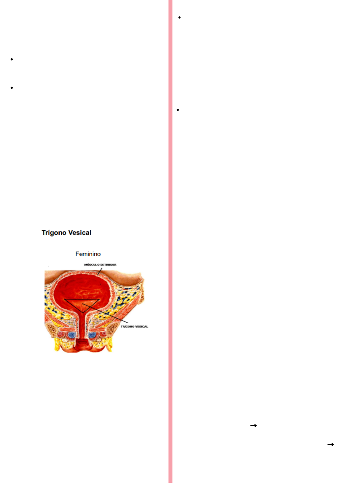 A uretra conduz a urina e continência (transportar e controlar a passagem de urina). Formado por fibras musculares lisas involuntárias (músculo esfincter interno uretral), mucosa, submucosa, vasos sanguíneos, tecido conjuntivo que conferem a coaptação uretral (responsável pela continência passiva). A falta de estrogênio leva a atrofia e substituição e substituição do suprimento vascular por tecido fibroso. Sistema urinário superior: • Rins • Ureteres Sistema urinário inferior: • Bexiga • Uretra Responsável pela produção e transporte da urina. Responsável pelo armazenamento da urina na bexiga e sua eliminação através da uretra para o meio externo durante a micção. A bexiga é formada por fibras musculares lisas involuntárias (músculo detrusor) Possui a função de reservatório de urina e proporciona a contração eficaz para promover seu esvaziamento durante a micção. Trígono vesical: Área compreendida entre o colo vesical e a inserção dos 2 ureteres (triângulo invertido) Ângulo uretrovesial (JUV): Formato entre a uretra e colo vesical. Anatomia do sistema urinário O músculo esfíncter externo uretral é responsável pela CONTINÊNCIA ATIVA, predominantemente composto por fibras do tipo I (contração lenta, adaptadas para manter o tônus muscular por tempo prolongado) e fibras estriadas do tipo II (Contração rápida, gera grande tensão em curto período). A insuficiência da uretra gera a incontinência urinária e infecções. Assoalho pélvico: Composto pelo diafragma pélvico (elevador do ânus - nervo pudendo) e urogenital, sustenta as vísceras e proporciona ação esfincteriana para a uretra, vagina e reto, permite a passagem do feto. Diafragma pélvico: As fibras são 70% do fibras tipo I: metabolismo aeróbico, contração lenta, resistentes à fadiga Produzem uma contração de menor intensidade, porém de maior duração (sustentação); Os outros 30% são fibras tipo II: metabolismo anaeróbico, contração rápida, mais fadigáveis Produzem uma contração de maior intensidade, porém de menor duração. Diafragma urogenital: Composto pelo esfincter externo uretral, bulboesponjoso, isquiocavernoso e transverso superficial e profundo do períneo Enchimento: Inicia-se após cada micção e se dá pela combinação do relaxamento da musculatura lisa da bexiga, aumento do tônus e resistência da musculatura lisa do esfíncter interno uretral (musculatura lisa) e do esfíncter externo uretral (musculatura estriada). PORTANTO: A fase de enchimento é de predomínio de estimulação simpática (n. hipogástrico) e de inibição parassimpática (n. pélvico). Sistema urinário O enchimento vesical envia impulsos pelo nervo pélvico que vão até o córtex cerebral e centro pontino da micção → que responde com estímulos inibitórios aos nervos parassimpáticos para o relaxamento vesical → ao mesmo tempo, são enviados estímulos excitatórios para os nervos simpáticos que estimulam os receptores Esvaziamento: Quando o córtex decide que é momento de iniciar a micção e a pessoa encontrou o local adequado, ocorre o esvaziamento vesical pela contração coordenada e sustentada do detrusor associada ao relaxamento dos esfíncteres uretrais interno e externo. PORTANTO: A fase de esvaziamento é de predomínio de estimulação parassimpática e de inibição simpática. Há interrupção dos estímulos inibitórios parassimpáticos, ou seja, liberam-se os estímulos excitatórios para a contração do detrusor → Ao mesmo tempo, são enviados estímulos inibitórios para os nervos simpáticos, inibindo os receptores alfa adrenérgicos do colo vesical e uretra proximal (relaxando e diminuindo o tônus uretral), além de inibição do nervo pudendo (relaxando o esfíncter uretral externo e assoalho pélvico). alfa adrenérgicos presentes no colo vesical e uretra proximal (aumentando o tônus uretral) e os receptores beta adrenérgicos presentes na bexiga (relaxando o detrusor), há também envio de estímulos excitatórios para o nervo pudendo com consequente aumento da pressão intra- uretra.