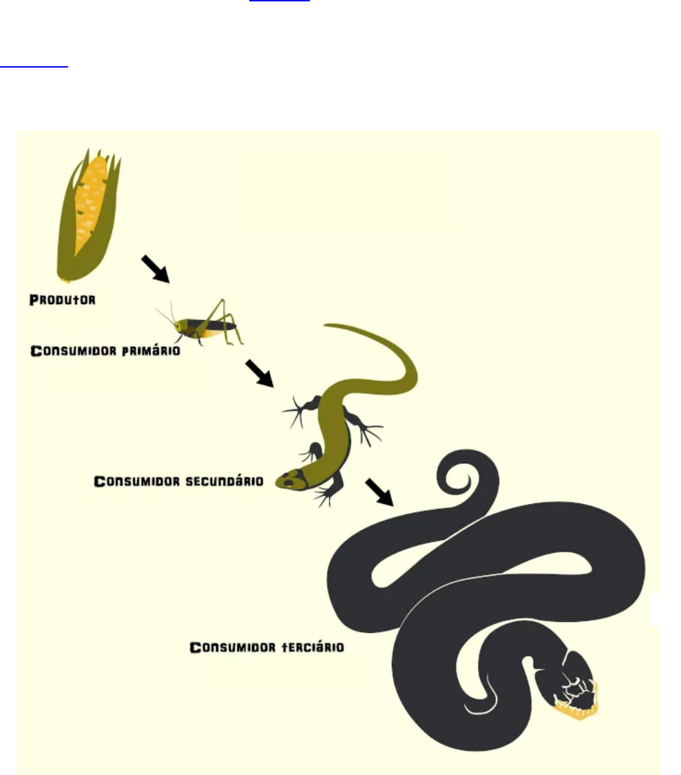 Cadeia alimentar A cadeia alimentar é a representação de uma sequência de organismos em que um serve de alimento para o outro. Cada organismo ocupa um nível trófico específico. A cadeia alimentar representa uma sequência de seres vivos na qual um serve de alimento para o outro. Cada organismo ocupa um nível trófico dentro da cadeia alimentar, o que é determinado pelo tipo de alimento e pela forma como ele se alimenta. No ecossistema, os organismos podem ser classificados como produtores, consumidores e decompositores, de acordo com a forma de obtenção do alimento. Alterações no meio ambiente, como a caça e o desmatamento, podem desencadear alterações na cadeia alimentar e, consequentemente, desequilíbrio ambiental. Uma cadeia alimentar é constituída por organismos produtores, consumidores e decompositores. O que é cadeia alimentar? A cadeia alimentar representa uma sequência de seres vivos na qual um organismo serve de alimento para o outro. Por meio dessa cadeia, ocorre a transferência de matéria e energia no ecossistema. As cadeias alimentares são constituídas por diversos organismos, que ocupam diferentes posições ou níveis tróficos, de acordo com a forma como se alimentam. O fluxo de matéria orgânica e energia dentro da cadeia segue uma sequência: https://www.biologianet.com/biodiversidade/o-que-sao-seres-vivos.htm https://www.biologianet.com/ecologia/ecossistema.htm PRODUTORES → CONSUMIDORES → DECOMPOSITORES Níveis tróficos da cadeia alimentar Nível trófico é a posição ocupada pelos organismos dentro da cadeia alimentar. Eles são determinados pelo tipo de alimento ingerido pelo organismo. Produtores: são os organismos que conseguem produzir moléculas orgânicas a partir de processos como a fotossíntese e a quimiossíntese. Esses organismos são também conhecidos como autotróficos e ocupam o primeiro nível trófico da cadeia. Consumidores: são os organismos que obtêm energia alimentando-se de outros organismos. Quando se alimentam de organismos produtores, ocupam o nível dos consumidores primários ou consumidores de primeira ordem; quando se alimentam de consumidores primários, ocupam o nível trófico dos consumidores secundários ou consumidores de segunda ordem, e assim sucessivamente. Decompositores: são os organismos que decompõem os restos de seres vivos mortos e devolvem os minerais para o solo, atuando como se estivessem reciclando a matéria orgânica. Atuam em todos os níveis tróficos. Acesse também: Relações ecológicas – interações entre seres vivos Exemplo de cadeia alimentar Veja a ilustração a seguir: Cada organismo ocupa um nível trófico na cadeia. A partir da ilustração, podemos determinar os componentes de cada nível trófico da cadeia. A planta ocupa o primeiro nível trófico, o dos produtores (autotróficos). Na sequência, podemos observar um rato, que se alimenta da planta, ocupando o segundo nível trófico, o de consumidor primário (herbívoro). A cobra, que se alimenta do rato, ocupa o terceiro nível trófico, o de consumidor secundário (carnívoro). A águia, que se alimenta da cobra, ocupa o quarto nível trófico, o de consumidor terciário (carnívoro). Os decompositores, geralmente, não são representados nas cadeias, pois atuam nos diversos níveis tróficos. Acesse também: Teia alimentar – conjunto de cadeias alimentares de um ecossistema Alterações das cadeias alimentares Alterações dentro das cadeias alimentares podem desencadear o desequilíbrio de todo um ecossistema. Essas alterações, muitas vezes, são causadas pela ação do homem – um exemplo é a introdução de espécies em um ambiente fora da sua área de distribuição nativa. No Brasil, podemos destacar a introdução de javalis. Esses animais não possuem predadores naturais no território brasileiro, o que levou a uma superpopulação da espécie. Eles competem por território e alimento com as espécies nativas que ocupam o mesmo nicho ecológico, como o caititu, levando vantagem sobre este. Os javalis alimentam-se de raízes e https://www.biologianet.com/botanica/reacoes-fotossintese.htm https://www.biologianet.com/biologia-celular/quimiossintese.htm https://www.biologianet.com/biodiversidade/seres-autotroficos-heterotroficos.htm https://www.biologianet.com/ecologia/relacoes-ecologicas.htm https://www.biologianet.com/zoologia/animais-herbivoros.htm https://www.biologianet.com/zoologia/animais-carnivoros.htm https://www.biologianet.com/ecologia/teia-alimentar.htm alguns invertebrados e têm causado diversos prejuízos às lavouras. Por essa razão, os órgãos ambientais autorizaram a sua caça. Leia também: Diferenças entre habitat e nicho ecológico Exercícios sobre cadeia alimentar (Enem) Os personagens da figura estão representando situação hipotética de cadeia alimentar. Suponha que, em cena anterior à apresentada, o homem tenha se alimentado de frutas e grãos que conseguiu coletar. Na hipótese de, nas próximas cenas, o tigre ser bem-sucedido e, posteriormente, servir de alimento aos abutres, tigre e abutres ocuparão, respectivamente, os níveis tróficos de: a) produtor e consumidor primário. b) consumidor primário e consumidor secundário. c) consumidor secundário e consumidor terciário. d) consumidor terciário e produtor. e) consumidor secundário e consumidor primário. Resolução Alternativa C. Se o homem alimentou-se de frutas e grãos – alimentos de origem vegetal (produtores)–, ele ocupa o nível trófico de consumidor primário. Se o tigre for bem-sucedido e conseguir alimentar-se do homem, ocupará o nível trófico de consumidor secundário. Já o abutre, ao se alimentar do tigre, quando este estiver morto, ocupará o nível trófico de consumidor terciário. Fonte: Brasil Escola - https://www.biologianet.com/ecologia/cadeia-alimentar.htm https://www.biologianet.com/ecologia/habitat-nicho-ecologico.htm