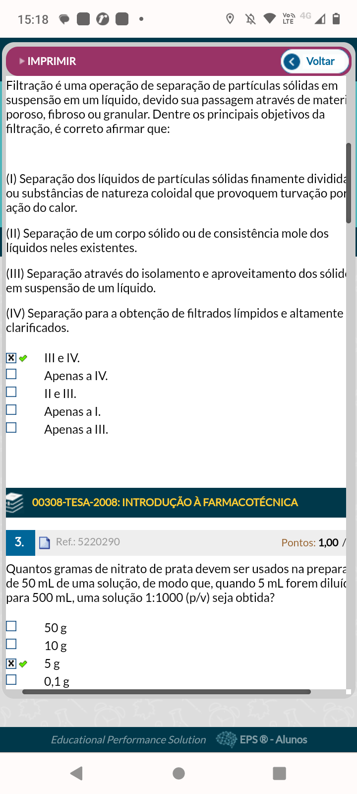 Dentre os principais objetivos da filtração, é correto afirmar que: (I) Separação dos líquidos de partículas sólidas finamente dividida ou substâncias de natureza coloidal que provoquem turvação por ação do calor. (II) Separação de um corpo sólido ou de consistência mole dos líquidos neles existentes. (III) Separação através do isolamento e aproveitamento dos em suspensão de um líquido. (IV) Separação para a obtenção de filtrados límpidos e altamente clarificados.