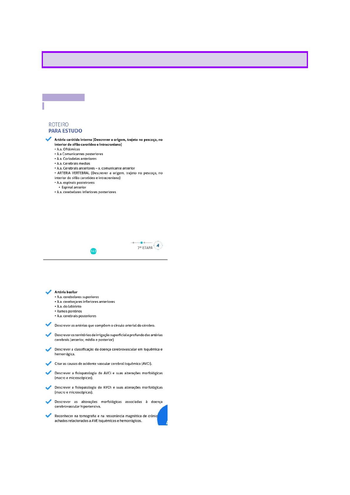 AVC ANATOMIA OBJETIVOS . Artérias encefálicas e territórios de irrigação O polígono de Willis se localiza na superfície inferior do cérebro, na cisterna interpeduncular do espaço subaracnóideo. Ele circunda várias estruturas na fossa interpeduncular (uma depressão na base do cérebro), incluindo o quiasma óptico e o infundíbulo da glândula hipófise. Manifestações clínicas https://www.kenhub.com/pt/library/anatomia/quiasma-optico https://www.kenhub.com/pt/library/anatomia/hipofise https://www.kenhub.com/pt/library/anatomia/hipofise BASES NEUROLÓGICAS: ● preciso de 2 neurônios para fazer o movimento ○ O primeiro dá o comando do movimento. Fica no córtex motor (de onde sai a ordem consciente para o movimento. Ele cruza para o lado oposto. Desce pela medula e na medula faz uma sinapse com o segundo neurônio motor ● SISTEMA MOTOR: ○ sistema piramidal ■ primeiro neurônio (síndrome piramidal = lesão de primeiro neurônio motor) ○ medula espinhal ■ primeiro e segundo neurônios ○ sistema extrapiramidal ■ automatismos ○ cerebelo ■ ajustes finos SISTEMA PIRAMIDAL - PRIMEIRO NEURÔNIO MOTOR: Temos vários primeiros neurônios motores ● OS PRIMEIROS NEURÔNIOS vão se juntando e se aproximando e passam agrupados em uma mesma estrutura → CÁPSULA INTERNA! ○ pela cápsula interna passam os primeiros neurônios motores de um lado da cabeça → lesão pequena em tamanho, porém gigante em repercussões clínicas ● depois de passar pela cápsula interna, constituem um feixe neuronal chamado de feixe piramidal → desce pelo tronco encefálico ○ mesencéfalo → ponte → bulbo ○ no final do bulbo, o feixe neuronal decussa, de forma que desce cruzado na medula → a motricidade é cruzada ● lesão no primeiro neurônio = síndrome piramidal ou piramidalismo ● a deficiência motora pode ser total ou parcial ○ total = plegia ○ parcial = paresia (perda de força muscular) ● na síndrome piramidal a plegia ou paresia é chamada de ESPÁSTICA ○ porque com a perda do comandante (primeiro neurônio) o segundo fica órfão (e aí faz uma contração contínua e imperfeita) ● obs: no arco reflexo ocorre sinapse entre o neurônio sensitivo (com receptores no músculo onde foi testado) e o segundo neurônio motor na medula. Esse reflexo independe do primeiro neurônio motor. Logo, na lesão de primeiro neurônio, temos HIPERREFLEXIA. ○ ex: SINAL DE BABINSKI (reflexo cutâneo plantar em extensão, sendo que o esperado no adulto normal seria reflexo cutâneo plantar em flexão) ● Logo, DEFICIÊNCIA MOTORA ESPÁSTICA, COM HIPERREFLEXIA E BABINSKI + ● Se lesão de córtex ou tronco (AVE) → sintoma CONTRALATERAL à lesão ● Se lesão depois do ponto de cruzamento → manifestação motora do mesmo lado de onde ocorreu a lesão: Se medula → sintoma IPSILATERAL SÍNDROME DE LESÃO DO SEGUNDO NEURÔNIO MOTOR ● paresia ou plegia flácida ● atrofia muscular ● o músculo pode ficar tentando se contrair sozinho, o que chamamos de miofasciculações ● hiporreflexia ou arreflexia completa ● ex: neuropatia periférica SISTEMA SENSITIVO ● para a nossa sensibilidade, usamos no mínimo 3 neurônios sensitivos Primeiro → capta as sensações da periferia, faz uma sinapse com o Segundo neurônio na medula → CRUZA PARA O OUTRO LADO → sobem cruzadas (por isso, se tiver lesão do córtex sensitivo do lado direito, perco sensibilidade do lado E) → sinapse com o Terceiro neurônio no tálamo e o terceiro neurônio vai para o córtex para ter a percepção das sensações CÓRTEX CEREBRAL frontal ○ área de broca ou área motora da linguagem ○ execução da linguagem ○ lesão → afasia motora ■ entende o que falam, mas perde a execução ○ As áreas de linguagem geralmente existem em um único hemisfério, que é o dominante. Na maioria das pessoas, o dominante é do lado ESQUERDO ○ córtex motor ■ comanda motricidade do lado oposto do corpo ■ primeiros neurônios motores que ficam agrupados por região (perna, mão, face…) → guardar que os responsáveis por mexerem a perna ficam em região mais MEDIAL ● temporal ○ área da linguagem: WERNICKE: área da compreensão da linguagem ○ afasia de wernicke = afasia sensitiva fala coisas sem sentido (não entende o que fala e nem o que falam para ela) ○ somente em um hemisfério (no dominante, que geralmente é o esquerdo) ● parietal ○ córtex sensitivo (terceiros neurônios sensitivos) ○ sente o lado oposto do corpo ○ a perna é medial ● occipital ○ visão TRONCO CEREBRAL ● Lesão de PAR CRANIANO: ○ ex: diplopia, disfagia, vertigem… CEREBELO ● coordenação → ataxia se lesão VASCULARIZAÇÃO: ● circulação anterior = carotídea ○ a carótida comum se bifurca em interna e externa (irriga regiões extracranianas) ○ a carótida interna irriga o parênquima encefálico ● circulação posterior = vértebro-basilar ○ subclávia → vertebral → entram no crânio pelo forame magno → união para formar uma única artéria basilar → ramos arteriais para perfundirem região de base de crânio (tronco encefálico, cerebelo) ● região de anastomose entre os vasos → polígono de Willis ○ artéria basilar se bifurca em artérias cerebrais posteriores que irrigam regiões mais posteriores do cérebro ○ artéria carótida interna se bifurca em artéria cerebral anterior e artéria cerebral média (ramos finais) ○ 6 artérias: ■ 2 cerebrais posteriores ■ 2 cerebrais médias ■ 2 cerebrais anteriores ○ artérias comunicantes posteriores comunicam a circulação anterior com a posterior (temos 2) ○ artéria comunicante anterior (só temos 1) que comunica 2 lados da circulação anterior perfusão: ○ cerebral anterior ■ mais anterior e mais medial ○ cerebral média ■ mais lateral ■ emite ramos perfurantes, chamados artérias lentículo estriadas que irrigam a CÁPSULA INTERNA ○ cerebral posterior ■ mais posterior