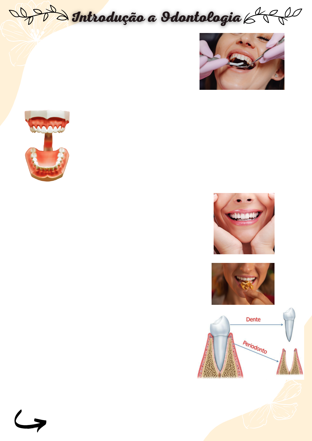 As funções exercidas pelos dentes, podem ser divididas em função passiva, sendo que: Função Ativa: A função ativa é a Mastigação, que é responsável por prender, contrar, dilacerar e triturar os alimentos. Sendo que cada dente possui sua função específico. Função Passiva: Os dentes apresentam, várias funções passivas, que não estão relacionadas diretamente com a mastigação, tais como: estética, proteção, fonação, sustentação de tecidos moles, e etc. A anatomia Dental é a área da Odontologia que visa capacitar o profissional a ter um amplo conhecimento sobre a anatomia década dente. O seu conhecimento é indispensável para a atuação na odontologia. O ensino é o aprendizado da Anatomia Dental, contribuem para as atividades relacionadas ao diagnóstico, planejamento, prognóstico e tratamento das afecções dentais. Dentes ( Definição) Os dentes são estruturas resistentes, de natureza calcária e cor branca. Eles estão localizados na boca e fixados na mandíbula/maxilar. Estão dispostos regularmente, uns ao lado dos outros, formando os arcos dentais superior e inferior. Observação: Vale ressaltar que o dente é considerado histologicamente como órgão, pelo fato de ele ser constituído por tecidos diferentes. Dentes ( Função) Fixação dos Dentes na Boca O dente fica fixado no osso alveolar pelo ligamento periodontal, e o nome dessa união é chamada de Gônfose. Osso Alveolar: O osso alveolar correspondente ao tecido ósseo cortical ou compacto que delimita à superfície do alvéolo dental. Ligamento Periodental: É uma estrutura fibrosa do tecido conjuntivo, com componentes nervosos e vasculares, que une o cimento da raiz ao osso alveolar. Gônfose articulação por inserção de uma saliência cônica numa cavidade, como a da raiz do dente no alvéolo. Grupo dos Dentes Os dentes são adaptados as funções de: apreender, cortar, dilacerar e triturar os alimentos sólidos. • Incisivos- Apreendem os alimentos. • Caninos- Cortam os alimentos. • Pré-Molares- Dilaceram e trituram os alimentos. • Molares- Dilaceram e trituram os alimentos. Dentição Humana O homem é um ser difiodonte, ou seja, ele possui duas definições. Sendo que, os dentes da primeira dentição, são chamados de Decíduos ( Dentes de leite), e os da segunda dentição são chamados de Permanentes. 1. Dentes Decíduos 2. Dentes Permanentes Nas imagens ao lado, temos a representação um Incisivo Central Superior e do 1° Molar Superior. Cada um na sua versão decídua e permanente, respectivamente. Idade em que normalmente os dentes erupcionam Partes dos Dentes Anatomicamente, o dente pode ser dividido em: coroa, colo e raiz. Essa divisão é muito utilizada para descrever cada dente isoladamente. Cada uma dessas partes possuem características próprias, que serão explicadas nas próximas páginas. Coroa Coroa: É a parte superior do dente, e geralmente a única parte visível. O formato da coroa determina a função do dente, por exemplo: os dentes mais afiados (caninos) servem para cortar os alimentos, e assim por diante. E ela é dividida em duas: Coroa Clínica e a Coroa Anatômica. • Coroa Clínica: É a parte visível da Coroa. • Coroa Anatômica: É a parte que fica receberia por gengiva. Colo Colo: O colo é o segmento imediato entre a coroa e a raiz. E ele é dividido em dois: O colo clínico e o Colo anatômico. • Colo Clínico: É a parte visível do colo. • Colo Anatômico: É a parte que fica receberia por gengiva. Raiz Raiz: Porção dental implantada nos alvéolos da maxila e da mandíbula. Existem 3 tipos de raizes: Unirradicular, Birradicular e Tri/Multirradiular. • Raiz Unirradicular: Possui somente uma raiz. • Raiz Birradicular: Possui duas raízes. • Raiz Trirradicular/ Multirradicular: Possuem três ou mais raízes. Estruturas dos Dentes O dente também pode ser dividido histologicamente, tomando como parâmetro os tecidos que os constituem. Temos a seguinte divisão: Esmalte, Dentina, Polpa e Cemento. Esmalte: O Esmalte é a camada mais externa do dente. Ele recobre a dentição coronária, e é o tecido mais mineralizado do corpo. É extremamente duro e resistente ao desgaste. Dentina: É um tecido conjuntivo avascular, de coloração branco- amarelada. É o maior tecido do dente, pois vai da coroa até a raiz, sendo que na coroa é recoberto pelo esmalte e na raiz pelo cimento. Polpa: Tecido mole, altamente vascularização, responsável pela vitalidade dos dentes. Cemento: Camada delgada de coloração amarelo, acelular e avascularizada que cobre a raiz do dente. Notação Dentaria O cirurgião-dentista tem necessidade de anotar todas as alterações que encontra durante o exame clínico do aparelho dentário, e como esse processo deve ser feito o mais rápido possível, foi criada uma maneira de identificar cada dente da arcada dentária. Faces do Dente Ângulos dos Dentes Ângulos e bordas dos Dentes