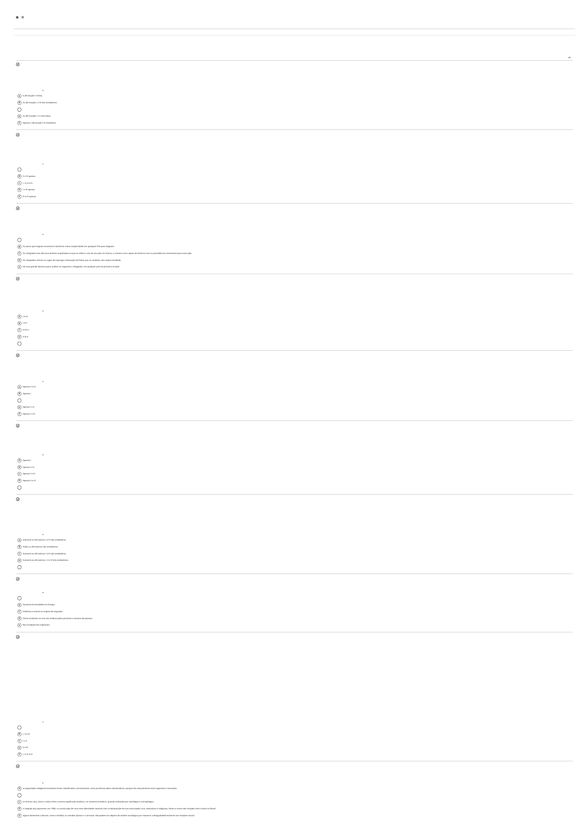 Avaliação On-Line 3 (AOL 3) - Questionário Conteúdo do exercício Ocultar opções de resposta Ocultar opções de resposta Ocultar opções de resposta Ocultar opções de resposta Ocultar opções de resposta Ocultar opções de resposta Ocultar opções de resposta Ocultar opções de resposta Ocultar opções de resposta Ocultar opções de resposta Avaliação On-Line 3 (AOL 3) - Questionário Raphael Cesar Fernandes Cavalcanti Pergunta 1 1 /1 O Brasil se constituiu sobre o mito da democracia racial principalmente depois da publicação de Casa grande e senzala de Gilberto Freyre (2003). De acordo com Florestan Fernandes (1965) o ideal de miscigenação fora difundido como mecanismo de absorção do mestiço não para a ascensão social do negro, mas para a hegemonia da classe dominante. O mito da democracia racial assentou-se sobre dois fundamentos: 1) o mito do bom senhor; 2) o mito do escravo submisso. Analise as afirmações: I.A sociedade brasileira não se assume racista e essa crença do “não somos racistas” se traduz em uma determinação para a negação das práticas racistas. II.O mito do escravo submisso fez com que a sociedade de um modo geral não encarasse de frente a violência da escravidão, fez com que os ouvidos se ensurdecessem aos clamores do movimento negro, por direitos e por justiça. III.As proposições legislativas sobre a inclusão de negros vão desde o Projeto de Lei que reserva aos negros um percentual fixo de cargos da administração pública, aos que instituem cotas para negros nas universidades públicas e nos meios de comunicação. Escolha a opção correta: A A afirmação I é falsa. B As afirmações I e III são verdadeiras. C Resposta corretaTodas as afirmações são verdadeiras. D As afirmações I e II são falsas. E Apenas a afirmação II é verdadeira. Pergunta 2 1 /1 Olhando mais de perto a questão de uma sociedade inclusiva e que entende os princípios da diversidade cultural, que considera a garantia do direito coletivo de exercício da cidadania, independentemente de gênero, origem socioeconômica, escolaridade, opção sexual, religião, cor, raça, deficiência, constatamos que, ao longo da história da escola, houve a presença de uma cultura excludente em suas práticas. Então, para o fortalecimento de uma cultura inclusiva, faz-se necessário que se pratique: I.A convivência dentro da diversidade humana; II.A eliminação de qualquer forma de discriminação; III.A valorização de cada pessoa com sua individualidade; IV.A classificação das pessoas em ações da vida social. Estão corretas as complementações contidas em: A Resposta corretaI, II e III apenas. B II e IV apenas. C I, II, III e IV. D I e III apenas E III e IV apenas. Pergunta 3 1 /1 TEXTO: “COMO É A VIDA NO MAIOR CAMPO DE REFUGIADOS DA FRANÇA” “A vida no maior campo de refugiados da França é cinza. Localizado na cidade de Calais, no noroeste da França, de clima nublado, chuvoso e sujeito a temperaturas negativas durante o inverno, o local ganhou o apelido de “Jungle” (selva, em inglês) e, hoje, abriga cerca de 4 mil pessoas. Refugiados e imigrantes vindos de países como Síria, Afeganistão, Eritreia e Marrocos vivem ali em tendas no meio da lama desde o ano passado. Eles aguardam uma chance de cruzar o Canal da Mancha; Calais abriga a entrada do Eurotúnel, principal ponto de acesso não-aéreo à Grã-Bretanha. A precariedade do cenário, o primeiro campo do tipo na França desde a Segunda Guerra, remonta a campos de refugiados de países pobres e distantes, como o Haiti ou Congo (...)”. Fonte: http://www.bbc.com/portuguese/noticias/2016/02/160220_campo_refugiados_calais_franca_cm_rb (Acesso em 19/03/2016). Após ler o texto acima e pensar sobre o tema das migrações e dos refugiados, vemos que sugere uma reflexão moral sobre o respeito às diferenças étnicas e culturais. A ética de convivência humana tem sido extremamente violada a partir desses movimentos migratórios. Nesse sentido, escolha a única opção que contém uma conseqüência desse processo de migração por guerras religiosas e de terror que tem ocorrido no mundo oriental. A Resposta corretaOs refugiados têm encontrado muito preconceito e xenofobismo mesmo nos países que se predispõem a colaborar. B Os povos que migram encontram tolerância e boa receptividade em qualquer País que cheguem. C Os refugiados tem tido seus direitos respeitados no que se refere a sair de seu país em Guerra, e contam com o apoio do Governo com as providências necessárias para esta ação. D Os refugiados retiram as vagas de emprego e educação de Países que os recebem com ampla civilidade. E Há uma grande abertura para acolher os migrantes, refugiados, em qualquer país de primeiro mundo. Pergunta 4 1 /1 Em pleno século XXI a grande maioria dos brasileiros ignora a imensa diversidade dos povos indígenas que vivem no país, aproximadamente trezentos povos que falam mais de 150 línguas. Estes povos possuem diferentes histórias, tradições e em comum o respeito pelos mais velhos e a preocupação com as futuras gerações. O contato com a nossa sociedade certamente trouxe muitas mudanças no modo de viver dos povos indígenas. Sobre os povos indígenas podemos afirmar: I.Os povos indígenas mantêm suas identidades. II.As culturas indígenas são estáticas. III.Por serem estáticas as culturas indígenas não se transformaram ao longo do tempo. IV.Os povos indígenas se afirmam como grupos étnicos diferenciados. V.As culturas indígenas são dinâmicas. Marque a resposta certa: A I-II-III B I-II-V C III-IV-V D II-III-V E Resposta corretaI-IV-V Pergunta 5 1 /1 Um dos maiores desafio da humanidade no século XXI é promover o enfrentamento dos conflitos originados das relações étnicas e raciais. Nos últimos vinte anos um cenário preocupante, relacionado ao crescimento de tais conflitos, tem nos chamado a atenção. Nesse sentido, avalie as assertivas abaixo e