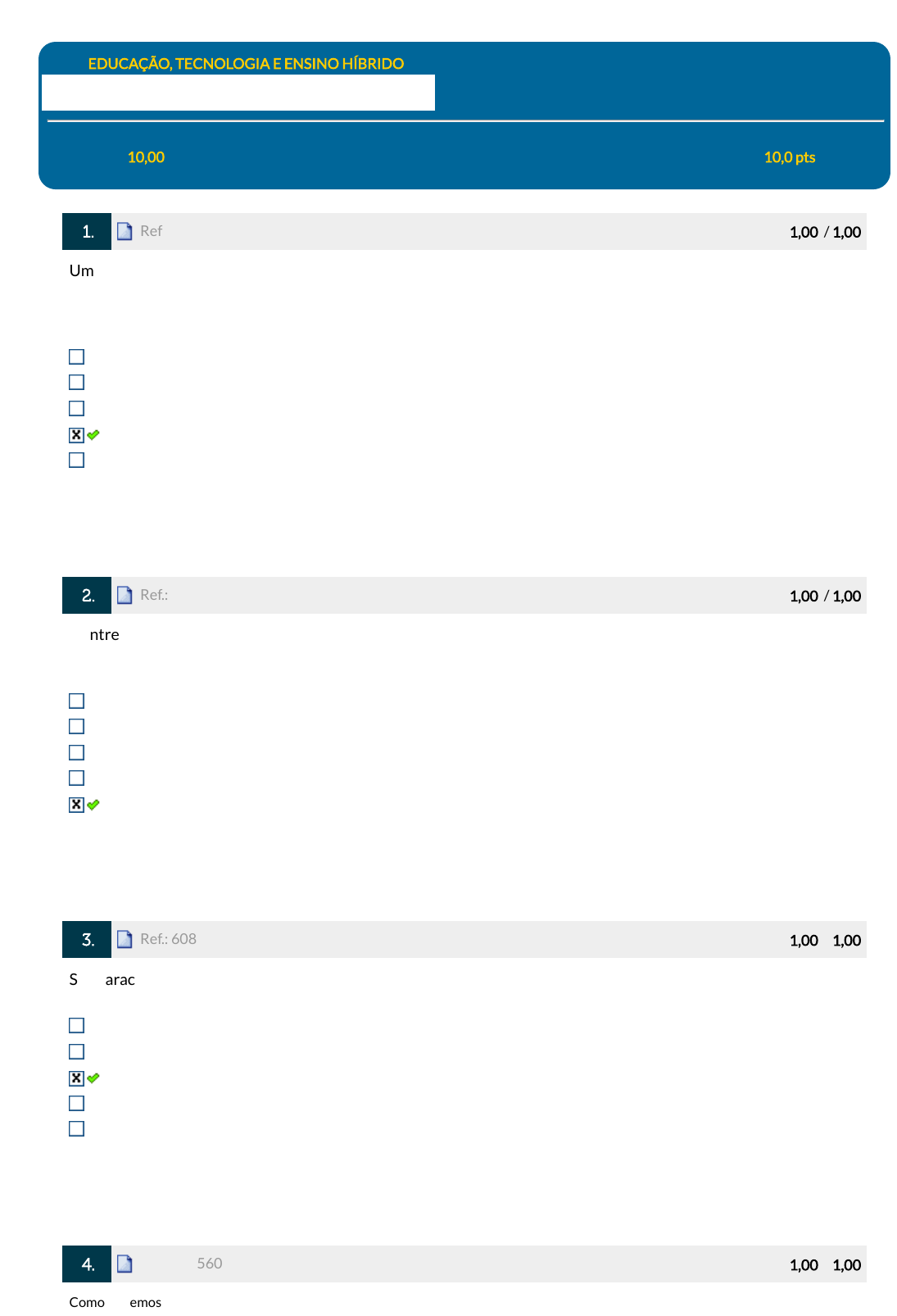 19/06/2023, 23:40 EPS https://simulado.estacio.br/alunos/ 1/4 Disc.: EDUCAÇÃO, TECNOLOGIA E ENSINO HÍBRIDO Aluno: 202210710331 - JOSUÉ MAGALHÃES COLARES Avaliação: 10,00 Nota Trab.: Nota Partic.: Nota SIA: 10,0 pts 1. Ref.: 3316529 Pontos: 1,00 / 1,00 Um utilização de um jogo de tabuleiro como por exemplo a "batalha naval" que esteja sendo utilizado em sala de aula com a �nalidade da fazer com que os estudantes aprendam a localização de pontos é uma forma de empregar a tecnologia no processo de ensino aprendizado ? Não, pois não é um jogo virtual Sim, pois os estudantes devem sempre jogar Sim, pois os estudantes podem jogar Sim, pois é uma forma de fazer uso de técnica para uma �nalidade educacional Sim, pois não é um jogo que esteja ligado a nenhum recurso eletrônico Respondido em 24/11/2022 22:27:41 2. Ref.: 3317198 Pontos: 1,00 / 1,00 Dentre os programas apresentado ao longo da aula destacam-se dois desenvolvidos na Europa, são eles: Laboratório da Sala de Aula e Ambientes de aprendizagem Laboratório da Sala de Aula do Futuro e mudança de professores Sala de Aula do Futuro e mudança de professores Sala de Aula do Futuro e Ambientes inovadores Laboratório da Sala de Aula do Futuro e Ambientes de aprendizagem inovadores e mudança de professores Respondido em 24/11/2022 22:28:26 3. Ref.: 6088894 Pontos: 1,00 / 1,00 São características de um AVA dedicado: Blogs e redes sociais. Flexível e in�uenciado por computação de nuvens. Planejado para �ns educacionais e visão clássica de um AVA. O Wiki é um exemplo de AVA dedicado. Google Drive e One Drive são exemplos de AVAs dedicados. Respondido em 24/11/2022 22:42:42 4. Ref.: 3325606 Pontos: 1,00 / 1,00 Como podemos de�nir o Método de aprendizagem cooperativa Jigsaw, segundo (VIEIRA, 2000) ? javascript:alert('C%C3%B3digo da quest%C3%A3o: 3316529.'); javascript:alert('C%C3%B3digo da quest%C3%A3o: 3317198.'); javascript:alert('C%C3%B3digo da quest%C3%A3o: 6088894.'); javascript:alert('C%C3%B3digo da quest%C3%A3o: 3325606.'); 19/06/2023, 23:40 EPS https://simulado.estacio.br/alunos/ 2/4 Pode ser entendida com um termo se refere a diversas técnicas de organização e condução de atividades fora da sala de aula Pode ser entendida com um termo se refere a uma única técnica de organização e condução de atividades em sala de aula. Pode ser entendida com um termo se refere a diversas técnicas de organização e condução de atividades extra sala de aula Pode ser entendida com um termo se refere a diversas técnicas de organização e condução de atividades em sala de aula É um termo se refere a técnica para resolução de problemas Respondido em 24/11/2022 22:38:14 5. Ref.: 3316538 Pontos: 1,00 / 1,00 Kenski(2009) Defende que as tecnologias são tão antigas quanto a espécie humana, dando origem mais diferenciadas tecnologias. Com base nesse pensamento de Kenski temos como exemplo de uso da tecnologia primitiva: Uso da geladeira a cafeteira elétrica O uso do isqueiro para aceder algo Esfregar gravetos para produzir fogo Uso de refrigerador de ar Respondido em 24/11/2022 22:44:03 6. Ref.: 3325604 Pontos: 1,00 / 1,00 Em que se baseia a Aprendizagem Baseada em Problemas ? Se utiliza de projetos inventados que sempre se baseia em um problema ou uma questão que seja motivadora e envolvente para o estudante focando no trabalho cooperativo para a resolução de problemas Se utiliza de projetos realistas onde cada aluno trabalhe de forma individual Se utiliza de projetos inventados que sempre se baseia em um problema ou uma questão que seja motivadora e envolvente para o estudante focando no trabalho não cooperativo para a resolução de problemas Se utiliza de projetos realistas que sempre se baseia em um problema ou uma questão que seja motivadora e envolvente para o estudante focando no trabalho não cooperativo para a resolução de problemas Se utiliza de projetos realistas que sempre se baseia em um problema ou uma questão que seja motivadora e envolvente para o estudante focando no trabalho cooperativo para a resolução de problemas. Respondido em 24/11/2022 22:39:25 7. Ref.: 6089124 Pontos: 1,00 / 1,00 Diante da pandemia, qual foi a plataforma que teve, segundo o texto, um aumento de 30 vezes? Hangouts Zoom Microsoft Teams Google Meet javascript:alert('C%C3%B3digo da quest%C3%A3o: 3316538.'); javascript:alert('C%C3%B3digo da quest%C3%A3o: 3325604.'); javascript:alert('C%C3%B3digo da quest%C3%A3o: 6089124.'); 19/06/2023, 23:40 EPS https://simulado.estacio.br/alunos/ 3/4 Whereby Respondido em 24/11/2022 22:39:54 8. Ref.: 3317227 Pontos: 1,00 / 1,00 Uma das formas de personalização da educação está apresentado da seguinte forma: repensar o papel do aluno Reorganizar os saberes da tecnologia em sala de aula Reorganizar a sala de aula Reorganização de saberes aliando a presença da tecnologia em sala de aula, repesando o papel do aluno e do professor. repensar o papel do professor Respondido em 24/11/2022 22:47:53 9. Ref.: 3325607 Pontos: 1,00 / 1,00 Como se caracteriza, segundo o texto O método 300 ? Tem por objetivo promover a colaboração entre os estudantes de forma isolada Tem por objetivo promover a colaboração entre os estudantes por meio de grupos, formados a partir do rendimento veri�cado, formando grupo entre os melhores alunos Tem por objetivo formar grupos pelas notas de forma aleatória Tem por objetivo promover a colaboração entre os estudantes por meio de grupos, Tem por objetivo promover a colaboração entre os estudantes por meio de grupos, formados a partir do rendimento veri�cado posterior a uma avaliação. Respondido em 24/11/2022 22:46:18 10. Ref.: 3319048 Pontos: 1,00 / 1,00 Gokhale (1995) acrescenta que os alunos "são responsáveis pelo aprendizado uns dos outros" esta justi�cativa pode ser vista na seguinte frase: O aprendizado não serve para o desenvolvimento da capacidade crítica, pois não favorece a clari�cação de ideias próprias e da
