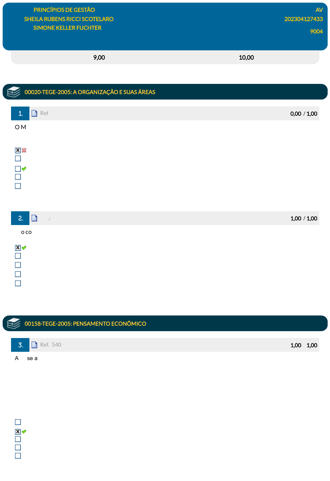 20/06/2023, 11:11 EPS https://simulado.estacio.br/alunos/ 1/4 Disciplina: PRINCÍPIOS DE GESTÃO AV Aluno: SHEILA RUBENS RICCI SCOTELARO 202304127433 Professor: SIMONE KELLER FUCHTER Turma: 9004 DGT0005_AV_202304127433 (AG) 07/05/2023 18:31:11 (F) Avaliação: 9,00 pts Nota SIA: 10,00 pts 00020-TEGE-2005: A ORGANIZAÇÃO E SUAS ÁREAS 1. Ref.: 6065097 Pontos: 0,00 / 1,00 O Mix de Marketing contempla a análise de alguns elementos que dão sustentação à estratégia de marketing da empresa. A moderna gestão de marketing acrescentou ao mix tradicional 4 novos elementos, são eles: Preço, praça, produto e promoção. Planejamento, pontualidade, perspicácia e ponderação. Pessoas, processos, programas e performance. Processos, performance, produto e planejamento. Todas as alternativas estão incorretas. 2. Ref.: 6065195 Pontos: 1,00 / 1,00 São consideradas saídas diretas (outputs) de um processo produtivo: Os produtos e serviços. O desenvolvimento tecnológico utilizado para a produção. O impacto ambiental da produção. A mão de obra utilizada. Todas as alternativas estão incorretas. 00158-TEGE-2005: PENSAMENTO ECONÔMICO 3. Ref.: 5400407 Pontos: 1,00 / 1,00 Analise as assertivas seguintes sobre o modelo de concorrência perfeita e marque a alternativa correta: I- Existe um grande número de vendedores e compradores. II- Os produtos são diferenciados. III- Existe completa informação e conhecimento sobre o preço do produto. IV- A entrada e saída de firmas do mercado são livres, não havendo barreiras. Apenas a assertiva I está correta. Apenas as assertivas I, III e IV estão corretas. Apenas as assertivas II, III e IV estão corretas. Apenas as assertivas I e II estão corretas. Apenas a assertiva III está correta. javascript:alert('C%C3%B3digo da quest%C3%A3o: 6065097.'); javascript:alert('C%C3%B3digo da quest%C3%A3o: 6065195.'); javascript:alert('C%C3%B3digo da quest%C3%A3o: 5400407.'); 20/06/2023, 11:11 EPS https://simulado.estacio.br/alunos/ 2/4 00221-TEGE-2005: O COTIDIANO DO GESTOR 4. Ref.: 3927454 Pontos: 1,00 / 1,00 Paulo André irá realizar um planejamento mais amplo, que abrangerá toda a sua organização como um sistema único e aberto, projetado para o longo prazo. Pode se dizer, então, corretamente, que Paulo André realizará um: planejamento funcional. planejamento operacional. planejamento estratégico. plano tático. plano de ação. 5. Ref.: 3927462 Pontos: 1,00 / 1,00 Pedro já percebeu que os métodos de controle utilizados em sua organização não são nada preventivos, o que tem acarretado inúmeros problemas nos processos realizados por ele e sua equipe. Para que Pedro adote, portanto, uma postura proativa e métodos preventivos de controle, ele deverá implantar: um programa para avaliar a qualidade dos serviços processados corretamente. um sistema de avaliação de desempenho para seus empregados. um manual de regras e procedimentos internos. uma pesquisa de satisfação com os clientes após a realização do serviços. a avaliação dos processo organizacionais no �m de cada mês. 00259-TEGE-2005: MERCADO E FORMAÇÃO DE PREÇOS 6. Ref.: 7701516 Pontos: 1,00 / 1,00 Os custos podem ser classi�cados como �xos ou variáveis. Os custos variáveis são aqueles que variam de acordo com a quantidade produzida. o volume de transações realizadas. os investimentos feitos. a quantidade de matéria prima. a quantidade vendida. 00263-TEGE-2005: GESTÃO AVANÇADA DA ORGANIZAÇÃO 7. Ref.: 6052546 Pontos: 1,00 / 1,00 A estilista Andréa Silveira é uma empresária de sucesso. Com uma marca com nome homônimo ao seu, ela trabalha apenas com tecidos naturais como algodão, linho e seda e com tingimento natural. Seu objetivo é por meio de relações afetivas com seus colaboradores e com os demais, fazer circular o conhecimento que adquiriu e sempre pesquisar novas técnicas de tingimento valorizando os saberes ancestrais brasileiros. Como empresária de visão pretende expandir seu negócio para a Europa, já no próximo ano. Face a notícia mencionada podemos considerar a estilista Andréa Silveira como: javascript:alert('C%C3%B3digo da quest%C3%A3o: 3927454.'); javascript:alert('C%C3%B3digo da quest%C3%A3o: 3927462.'); javascript:alert('C%C3%B3digo da quest%C3%A3o: 7701516.'); javascript:alert('C%C3%B3digo da quest%C3%A3o: 6052546.'); 20/06/2023, 11:11 EPS https://simulado.estacio.br/alunos/ 3/4 empresária varejista empresária industrial ecoempreendedora empreendedora cooperada empresária têxtil 8. Ref.: 6042591 Pontos: 1,00 / 1,00 A última reunião entre os gestores de áreas da empresa MARCA S/A foi motivada pela necessidade de realização de um diagnóstico socioambiental e resultado expressa-se a seguir: I- Os processos poluidores foram quali�cados como fraquezas; II- O aumento da regulamentação ambiental, que exige investimentos adicionais do órgão, foi elencado como oportunidade; III- Identi�cou-se que a administração e funcionários não são comprometidos com a preservação ambiental, o que foi considerado como ameaça. É correto o que se a�rma em: I, apenas. I e II, apenas. I, II e III. II, apenas. III, apenas. 00371-TEGE-2005: PENSAMENTO SISTÊMICO 9. Ref.: 5322545 Pontos: 1,00 / 1,00 Maria Fernanda participou de um processo seletivo para atuar como gestora de um restaurante. Ela sabe que sua escolha para o cargo pelo dono do estabelecimento levou em consideração: sua capacidade de pensar e atuar sistemicamente, orientada para resultados pluralistas. sua predisposição para ser e�ciente, já que ela tem em seu histórico a capacidade de cumprir metas. sua capacidade de compreender o ambiente tarefa da organização, cuja análise envolve as variáveis econômicas, tecnológicas e sociais. seu per�l de líder e a visão fragmentada que possui dos processos organizacionais. sua capacidade de entender o microambiente de uma organização, composto das variáveis tecnológicas e sociais. 10. Ref.: 3927420 Pontos: