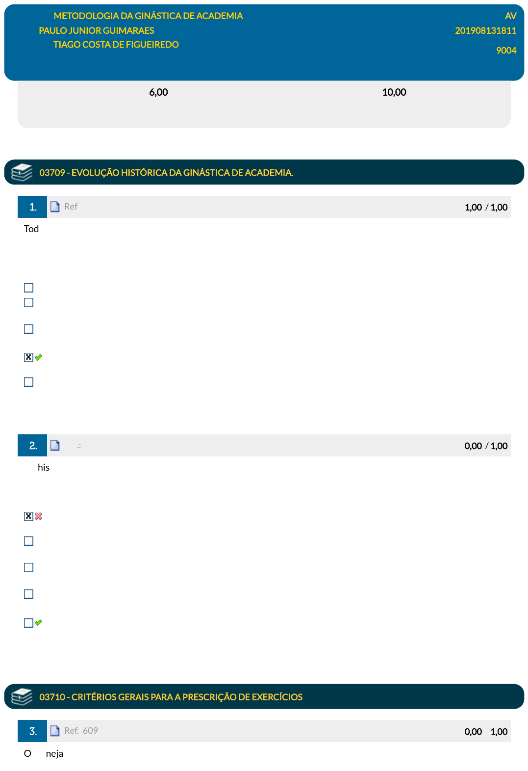 20/06/2023 12:54 EPS https://simulado.estacio.br/alunos/ 1/4 Disciplina: METODOLOGIA DA GINÁSTICA DE ACADEMIA AV Aluno: PAULO JUNIOR GUIMARAES 201908131811 Professor: TIAGO COSTA DE FIGUEIREDO Turma: 9004 SDE4553_AV_201908131811 (AG) 03/05/2023 16:12:00 (F) Avaliação: 6,00 pts Nota SIA: 10,00 pts Estação de trabalho liberada pelo CPF 10409588776 com o token 115506 em 03/05/2023 16:11:45. 03709 - EVOLUÇÃO HISTÓRICA DA GINÁSTICA DE ACADEMIA. 1. Ref.: 6092790 Pontos: 1,00 / 1,00 Todo negócio tende a passar por ciclos de altas e baixas, e com o mercado das academias não é diferente. Assim, mesmo com alguns modelos de negócios já estabelecidos e estruturados, nada impede que novos tipos de negócios na área das academias de ginástica venham a surgir. Considerando há necessidade de um aumento na taxa de penetração dos serviços e na manutenção desse "cliente" na academia, assinale a alternativa correta: O per�l e as necessidades do cliente são semelhantes independente de região, sexo e faixa etária. Como as atividades relacionadas ao "�tness" permitem o equilíbrio entre o corpo e a mente, além da aquisição de hábitos saudáveis, elas deveriam ser priorizadas. Como as atividades relacionadas ao "wellness", nas quais o aspecto estético é preponderante, estabelecer o foco no treinamento neuromuscular deve ser o objetivo. A anamnese feita no ingresso do cliente na academia deve, a partir da orientação do pro�ssional de Educação Física, nortear as atividades que o "cliente" irá realizar. Por tenderem a ser a maioria nas academias de ginástica, nos diferentes serviços, as atividades deveriam ser desenhadas para os homens. 2. Ref.: 6093461 Pontos: 0,00 / 1,00 Na história da ginástica no Brasil houve grande in�uência dos militares na organização dos conteúdos didáticos e seleção de materiais e equipamentos utilizados nas aulas. Mas coube a Rui Barbosa ser o precursor das ideias fundamentais para Educação Física no Brasil. Com base no texto acima assinale a alternativa correta: Na proposta de Rui Barbosa os exercícios deveriam ser realizados duas vezes por semana, com duração de 60 minutos e com caráter militar. Inaugurada em 1893, a Associação Cristã dos Moços, no Brasil, utiliza o método sueco em suas aulas de ginástica. Na década de 30 a calistenia e o método sueco também passam a ser utilizados nas escolas, mas encontra resistência do método francês já utilizado. No �nal do século XIX o método sueco era aplicado aos militares e o método alemão à população civil nas escolas. Rui Barbosa propôs fazer distinção entre exercício físico para os alunos com base na ginástica sueca e, para as alunas na calistenia, pois estas resistiam à prática do exercício por associarem as instituições militares. 03710 - CRITÉRIOS GERAIS PARA A PRESCRIÇÃO DE EXERCÍCIOS 3. Ref.: 6092036 Pontos: 0,00 / 1,00 O planejamento e a periodização são elementos que fornecem ao pro�ssional de Educação Física uma base sólida para o desenvolvimento das atividades, e mesmo que não tenham suas realizações asseguradas, devem ser pensados javascript:alert('C%C3%B3digo da quest%C3%A3o: 6092790.'); javascript:alert('C%C3%B3digo da quest%C3%A3o: 6093461.'); javascript:alert('C%C3%B3digo da quest%C3%A3o: 6092036.'); 20/06/2023 12:54 EPS https://simulado.estacio.br/alunos/ 2/4 visando a e�cácia e segurança das aulas/treinos. Assinale a alternativa correta com base no texto acima: A periodização é uma das diretrizes que faz parte de um amplo conjunto de estratégia que compõe o planejamento. Nas ginástica de academia o praticante deve ser orientado a frequentar as atividades quando tiver vontade, rompendo a continuidade do treinamento. Independentemente do tipo de escola, europeia ou americana, a periodização tem na fase de preparação ou pré-temporada ao entregar dos melhores resultados. A periodização oferece um detalhamento do planejamento geral, sem considerar o tempo disponível para as atividades e os objetivos preestabelecidos. Na adaptação da periodização as ginásticas de academia, fase de competição ou a "temporada" signi�ca o processo de treinamento é iniciado. 4. Ref.: 6092037 Pontos: 1,00 / 1,00 As variáveis de treinamento atuam como norteadoras fundamentais para a construção não só das aulas/treinos, mas também para elaboração de um planejamento com bases cientí�cas. Considerando as variáveis de treinamento, assinale a alternativa correta: Quanto maior for o grau de condicionamento físico o volume de treinamento deve ser reduzido para que a segurança seja mantida. As atividades do tipo �exibilidade só são consideradas e�cazes para estímulos a partir de quatro vezes por semana. O número máximo de repetições para determinada sobrecarga em uma aula de ginástica localizada está associado à frequência das atividades do tipo �exibilidade. Uma aula/treino de ciclismo "indoor" com 40 minutos de duração está associada à frequência das atividades do tipo neuromuscular. O percentual da frequência cardíaca para uma aula/treino de "running" está associado à intensidade das atividades do tipo cardiorrespiratórias. 03711 - ATIVIDADES DE GINÁSTICA 5. Ref.: 6102428 Pontos: 1,00 / 1,00 Saber estruturar os conteúdos de uma aula/treino de ginástica de academia dá ao pro�ssional de Educação Física condições de prognosticar a curva de esforço que será implementada na mesma. Sabendo que independente do tipo ou modalidade de ginástica de academia, a estrutura de aula/treino deve seguir uma sequência preestabelecida, assinale a opção que indica essa sequência corretamente. Aquecimento, relaxamento e treinamento propriamente dito Aquecimento, parte especí�ca e relaxamento Fase de recuperação, fase preparatória e parte especí�ca Treinamento propriamente dito, fase de recuperação e fase preparatória Treinamento propriamente dito, fase preparatória e fase 