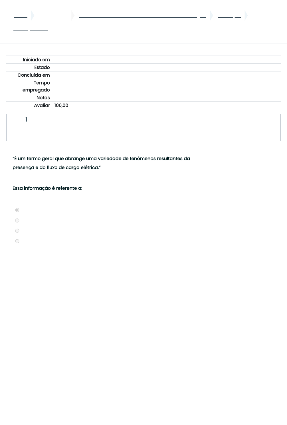 20/06/23, 19:32 Avaliação Final: Revisão da tentativa https://ead.fieg.com.br/mod/quiz/review.php?attempt=469944&cmid=271758 1/6 Painel Meus cursos Auxiliar de Eletrônica - 17370 - Fatec SENAI Ítalo Bologna Avaliação Avaliação Final Iniciado em terça, 20 Jun 2023, 19:30 Estado Finalizada Concluída em terça, 20 Jun 2023, 19:32 Tempo empregado 1 minuto 51 segundos Notas 10,00/10,00 Avaliar 100,00 de um máximo de 100,00 Questão 1 Correto Atingiu 1,00 de 1,00 “É um termo geral que abrange uma variedade de fenômenos resultantes da presença e do fluxo de carga elétrica.” Essa informação é referente a: Escolha uma opção: a. Eletricidade b. Prótons c. Átomos d. Nêutrons Sua resposta está correta. A resposta correta é: Eletricidade https://ead.fieg.com.br/my/ https://ead.fieg.com.br/course/view.php?id=10563 https://ead.fieg.com.br/course/view.php?id=10563§ion=5 https://ead.fieg.com.br/mod/quiz/view.php?id=271758 20/06/23, 19:32 Avaliação Final: Revisão da tentativa https://ead.fieg.com.br/mod/quiz/review.php?attempt=469944&cmid=271758 2/6 Questão 2 Correto Atingiu 1,00 de 1,00 Questão 3 Correto Atingiu 1,00 de 1,00 “É o acúmulo de cargas elétricas na superfície de um material, que geralmente é isolante ou não-condutor de eletricidade.” Essa informação é referente a: Escolha uma opção: a. Aterramento b. Corrente contínua c. Eletricidade estática d. Corrente alternada Sua resposta está correta. A resposta correta é: Eletricidade estática “A corrente elétrica é um fluxo de elétrons que passa em um fio ou condutor, se os elétrons mudam de direção constantemente, trata-se de uma: Escolha uma opção: a. Tensão b. Corrente contínua c. Corrente alternada d. Potência Sua resposta está correta. A resposta correta é: Corrente alternada 20/06/23, 19:32 Avaliação Final: Revisão da tentativa https://ead.fieg.com.br/mod/quiz/review.php?attempt=469944&cmid=271758 3/6 Questão 4 Correto Atingiu 1,00 de 1,00 Questão 5 Correto Atingiu 1,00 de 1,00 “É uma grandeza dada em Hertz (Hz), em homenagem ao físico alemão Heinrich Rudolf Hertz (1857-1894). Ela corresponde ao número de oscilações, ondas ou ciclos por segundo que ocorre na corrente elétrica alternada.” Essa afirmação corresponde a: Escolha uma opção: a. Frequência b. Corrente alternada c. Tensão d. Corrente contínua Sua resposta está correta. A resposta correta é: Frequência “É o componente elétrico onde se verifica mais comumente a propriedade da capacitância, ele é composto por lâminas condutoras isoladas entre si, chamadas de placas, e por um dielétrico (elemento isolante).” Essa informação é referente a: Escolha uma opção: a. Capacitor b. Resistor c. Trilha d. Multímetro Sua resposta está correta. A resposta correta é: Capacitor 20/06/23, 19:32 Avaliação Final: Revisão da tentativa https://ead.fieg.com.br/mod/quiz/review.php?attempt=469944&cmid=271758 4/6 Questão 6 Correto Atingiu 1,00 de 1,00 Questão 7 Correto Atingiu 1,00 de 1,00 “O ___________ é o sistema mais utilizado por máquinas, uma vez que os sistemas digitais trabalham internamente com dois estados (ligado/desligado, verdadeiro/falso, aberto/fechado). Utiliza os símbolos: 0, 1, sendo cada símbolo designado por bit.” Assinale a alternativa que completa corretamente a frase acima. Escolha uma opção: a. Sistema Decimal b. Sistema de Unidades c. Sistema Binário d. Sistema Hexadecimal Sua resposta está correta. A resposta correta é: Sistema Binário “São equipamentos utilizados na transformação de valores de tensão e corrente, além de serem usados na modificação de impedâncias em circuitos elétricos.” A informação acima é referente a: Escolha uma opção: a. Transformadores b. Capacitores c. Multímetros d. Resistores Sua resposta está correta. A resposta correta é: Transformadores 20/06/23, 19:32 Avaliação Final: Revisão da tentativa https://ead.fieg.com.br/mod/quiz/review.php?attempt=469944&cmid=271758 5/6 Questão 8 Correto Atingiu 1,00 de 1,00 Questão 9 Correto Atingiu 1,00 de 1,00 “É um equipamento que tem a função de proteger aparelhos eletrônicos das variações de tensão que recebe da rede elétrica. Portanto, suas tomadas devem trazer energia estabilizada, diferente da energia que vem da rua, exposta a variações.” A informação é referente a: Escolha uma opção: a. Transformador b. Capacitor c. Resistor d. Estabilizador Sua resposta está correta. A resposta correta é: Estabilizador “O _________é um equipamento que transforma a energia mecânica, química, solar ou de qualquer outra natureza, em energia elétrica. Este dispositivo é constituído por dois polos (positivo e negativo) e trabalha de modo a manter uma diferença de potencial entre esses dois pontos.” Assinale a alternativa que completa corretamente a frase acima: Escolha uma opção: a. Capacitor b. Estabilizador c. Gerador elétrico d. Nobreak Sua resposta está correta. A resposta correta é: Gerador elétrico 20/06/23, 19:32 Avaliação Final: Revisão da tentativa https://ead.fieg.com.br/mod/quiz/review.php?attempt=469944&cmid=271758 6/6 Questão 10 Correto Atingiu 1,00 de 1,00 “É um componente eletrônico semicondutor com várias funções, nomeadamente: amplificador de sinal (tensão), comutador de circuitos e amplificador e regulador de corrente.” Essa informação é referente a: Escolha uma opção: a. Capacitores b. Resistores c. Transistores d. Diodos Sua resposta está correta. A resposta correta é: Transistores Atividade anterior ◄ Técnicas de Estudo em EaD Seguir para... Próxima atividade Pesquisa de Opinião ► Núcleo Integrado de Educação a Distância https://senaigoias.com.br/ead niead@sistemafieg.org.br Resumo de retenção de dados https://ead.fieg.com.br/mod/resource/view.php?id=271757&forceview=1 https://ead.fieg.com.br/mod/feedback/view.php?id=271760&forceview=1 https://senaigoias.com.br/ead mailto:niead@sistemafieg.org.br