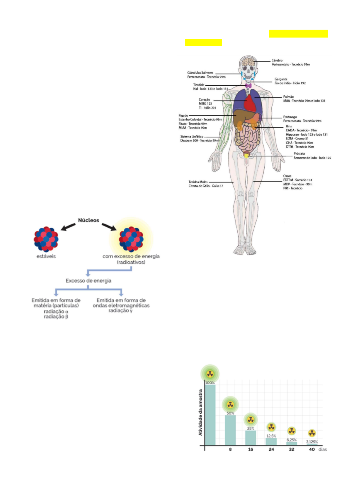 AAG Medicin� Nuclear Sigla: MN A Medicina Nuclear é a especialidade que se ocupa com o diagnóstico, tratamento e investigação médica mediante o uso de radioisótopos como fontes radioativas abertas. Energia formada a partir do núcleo de um átomo. PARTÍCULAS NUCLEARES: prótons e nêutrons Energia utilizada: radiação gama (γ) núcleos instáveis – grande quantidade de energia. Necessário liberar a energia excessiva para voltar a ser estável. São ondas eletromagnéticas (não possuem massa). Gama → Beta → Alfa → DESINTEGRAÇÃO O paciente é a fonte radioativa, onde é administrado um radiofármaco (fármaco + radioisótopo). Após a administração deste radiofármaco o paciente irá aguardar o tempo de meia-vida do radioisótopo (substância radioativa), em seguida será direcionado à sala de exames e irá realizar o exame no equipamento conhecido como gama-câmara. Radioisótopo: substância radioativa. Radiofármaco (radiotraçador): fármaco a qual o tecido estudado tem afinidade associado a um radioisótopo específico. Possui radiação gama, e é administrado em baixíssima quantidade antes do exame. NÃO É UM MEIO DE CONTRASTE. ● Tireoide: Nal-Iodo 123 e Iodo 131 Hipertireoidismo: cores quentes Hipotireoidismo: cores frias ● Metástase: glicose radioativa (tumores amam açúcar) ● Tecido encefálico: Tecnécio 99m A administração do radiofármaco não é apenas endovenosa. Não é necessário exame de ureia e creatinina, pois ocorre o decaimento radioativo (energia) e não excreção. Tempo de meia vida: é o tempo que radioisótopo demora para decair pela metade. Não há contra indicações, exceção: gestantes. AAG Cintilografia (MN) ● Diagnóstico e tratamento; ● Gama câmara; ● Substância radioativa – radioisótopo; ● Radiofármaco. O radiofármaco é distribuído no corpo do paciente emitindo energia e, um equipamento denominado Câmara Cintilográfica (cintilografia) realiza a leitura desta energia, esta leitura então é transformada em imagens para o diagnóstico. Há dois tipos de contraste: ● Hipercaptante – quente ou positivo. ● Hipocaptante – frio ou negativo. ● O tempo total do exame varia entre 15 a 20 minutos; ● Máquinas mais modernas possuem mais de uma cabeça, captam maior área de radiação simultaneamente; ● As imagens podem ser preto e branco ou coloridas. PET/CT – spect PET SCAN PET-CT é um exame de diagnóstico por imagem capaz de detectar tumores em todos os lugares do corpo. A sigla PET vem do inglês e significa "tomografia por emissão de pósitrons" (partícula radioativa), e CT vem de "tomografia computadorizada", que produz imagens enquanto o outro observa o metabolismo do corpo. Ou seja, o exame reúne duas tecnologias de ponta para analisar o estágio de qualquer tumor com eficácia para planejar o melhor tratamento ao paciente. PET-CT, PET SCAN, PET RM são exames híbridos, pois utilizam duas técnicas. Diferenças: PET-CT: imagens tridimensionais; o tipo de radioisótopo; emissão de pósitrons; equipamento gira em 360º SPECT: imagens bidimensionais; o tipo de radioisótopo; emissão de único pósitron; equipamento gira em 180º AAG SPECT É amplamente usado na medicina pois possibilita a visualização da funcionalidade de todos os sistemas do corpo. ● Perfusão de miocárdio; ● Cintilografia óssea; ● Cintilografia de ventilação e de perfusão; ● Perfusão cerebral. Perfusão: a passagem de líquido através do sistema circulatório ou linfático para um órgão ou tecido. Perfusão de miocárdio: Pode ser feito em repouso associado ao estresse físico ou farmacológico. Avalia o grau de comprometimento do coração em caso de infarto ou isquemia. A irrigação inadequada de uma determinada região, levando-a ao sofrimento e expondo aquele tecido ao risco de morrer, denomina-se isquemia. A isquemia, se prolongada, pode provocar a morte do tecido e este fenômeno se denomina infarto. Quaisquer regiões do corpo podem sofrer isquemia ou infarto. PET-CT A imagem da esquerda é a tomografia que mostra com detalhes a anatomia, a do meio o PET mostra onde ocorre o consumo de glicose (note que o consumo no cérebro e no coração é normal, na bexiga concentra-se o FDG que é retirado do corpo pelo rim, no entanto há uma imagem no fígado). Na terceira imagem, o computador junta as duas imagens anteriores e colore, mostrando claramente a presença de câncer no fígado deste paciente (seta branca). Imagem de PET mostra um tumor gástrico (setas). Nota-se cor amarela mais intensa o que significa maior consumo de nutrientes. O cérebro consome muitos nutrientes e também fica amarelo ao exame. Como o contraste sai pela urina, a bexiga também fica repleta de contraste e amarela neste exame.