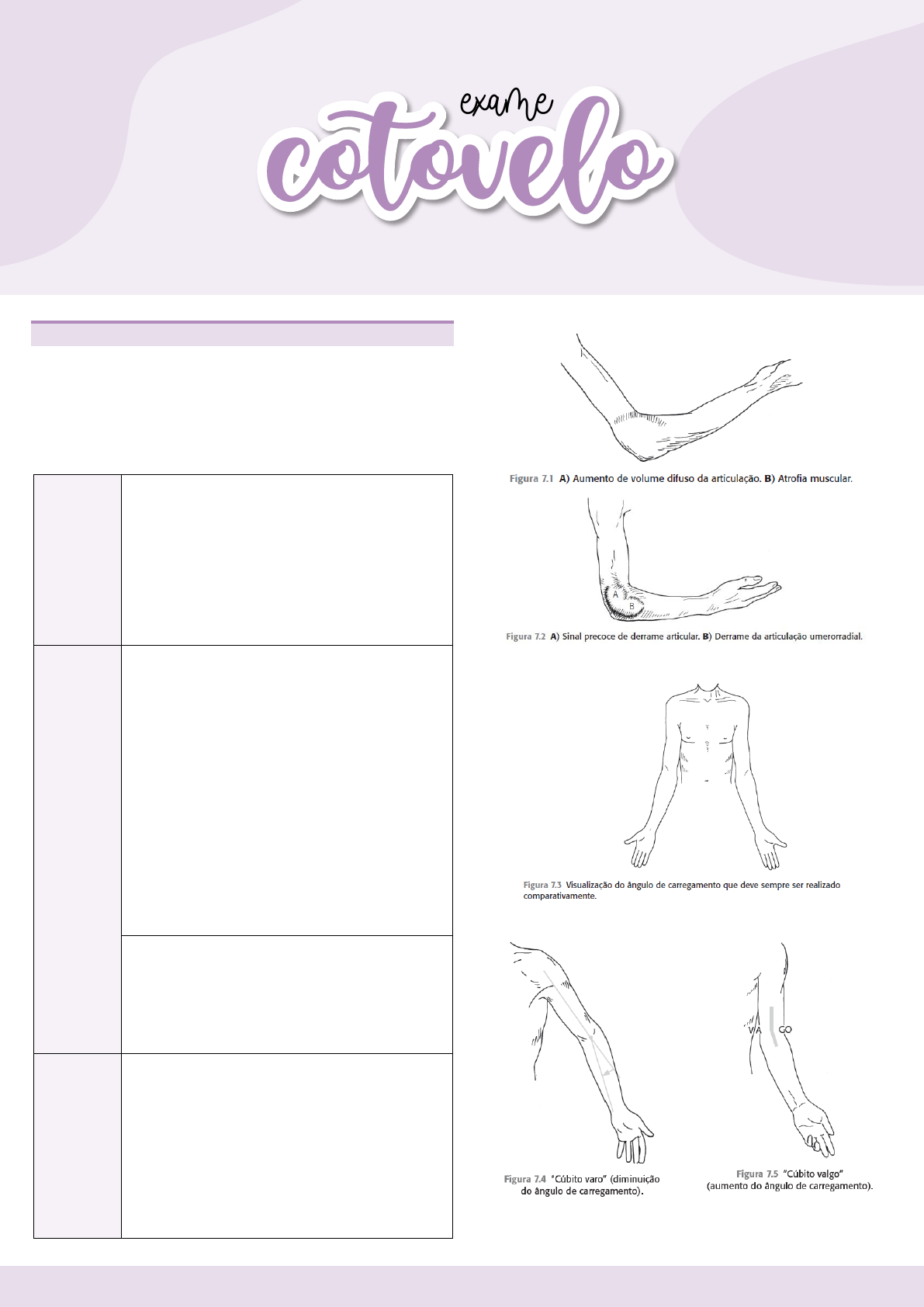 @LSTUDYMED 1 Letícia Cavalcante - UFDPar Aula 14 | Exame físico do cotovelo exame INSPEÇÃO O examinador poderá obter informações valiosas por meio da inspeção do coto velo. Sendo uma articulação subcutâ- nea, as alterações esqueléticas, o aumento de volume, a atrofia muscular e as cicatrizes são facilmente observados. A inspeção deverá ser realizada com atenção às regiões late- ral, anterior, posterior e medial. Lateral • Visualização do epicôndilo lateral e do ra- dio • Artrite reumatoide: Aumento de volume da articulação e atrofia muscular • Doença da cabeça do radio: preenchi- mento do recesso infracondilar, localizado logo abaixo do côndilo lateral do úmero, Anterior • Determinação do ângulo de carregamento (formado entre úmero e antebraço) com o antebraço em supinação e o cotovelo em extensão. • A causa mais comum de alteração do ân- gulo de carregamento é a sequela de trau- matismo ou a alteração da placa de cres- cimento. • A diminuição do ângulo de carregamento determina o “cúbito varo”, deformidade mais frequente. • O aumento no ângulo de carregamento determina o “cúbito valgo”. Posterior • Luxação do cotovelo: proeminência da ponta do olecrano • Visualização da Bursa olecraneana proe- minente e de nódulos reumatórides Medial • A inspeção do lado medial em geral ofe- rece poucas informações. • O epicôndilo medial é visível, a não ser em pacientes obesos. • Pode ser visualizada alterações como: hi- pertrofia do nervo ulnar (hanseníase) e sub- luxação na flexo-extensao Figuras. Inspeção lateral. Figura. Inspeção anterior: Angulo de carregamento: 10 graus homem e 13 graus mulher Figura. Inspeção anterior: Traumas e alterações da placa de crescimento podem provocar deformidades vistas anterior- mente no cotovelo. @LSTUDYMED 2 Letícia Cavalcante - UFDPar Aula 14 | Exame físico do cotovelo Figura. Inspeção posterior PALPAÇÃO A palpação do cotovelo inicia-se pela localização dos epi- côndilos lateral e medial, assim como pela ponta do olécrano. Esses três pontos, quando observados em vista posterior, de- verão formar um triângulo equilátero Figura. Palpação: epicôndilos e olecrano. Local Estruturas palpadas Lateral • Epicôndilo lateral • Origem da musculatura extensora do pu- nho • Complexo ligamentar lateral: consiste no colateral lateral e ligamento anular • Cabeça do radio • Se a pronossupinação for completa: ¾ da cabeca do radio é palpável Anterior • Na fossa cubital, limitada pelos músculos braquial e pronador redondo, existem qua- tro estruturas, que de lateral para medial são: • Nervo cutâneo lateral do ante braço • Tendão do bíceps • Artéria braquial • Nervo mediano. Posterior • Bursa olecraneana: encontra-se sobre a aponeurose do músculo tríceps e estará espessa e dolorosa à palpação quando houver processo inflamatório local. Medial • Nervo ulnar: situa-se em um sulco formado entre o epicôndilo medial e o pro cesso ole- craneano. • O nervo é suave, flexível e cilíndrico à pal- pação. Durante a palpação, devemos ob- servar se é possível deslocar o nervo de seu sulco. • O grupo muscular medial, que se origina no epicôndilo medial, é constituído por quatro músculos que são de lateral para medial: o pronador redondo, o flexor radial do carpo, o palmar longo e o flexor ulnar do carpo • Ligamento colateral medial: principal esta- bilizador do cotovelo em valgo, tem sua ori- gem no epicôndilo medial. Figura. Palpação lateral Figura. Palpação anterior @LSTUDYMED 3 Letícia Cavalcante - UFDPar Aula 14 | Exame físico do cotovelo Figura. Palpação posterior Figura. Palpação medial AMPLITUDE DO MOVIMENTO O cotovelo apresenta quatro tipos de movimentos, que são: flexão, extensão, pronação e supinação. A flexoextensão ocorre nas articulações umeroulnar e umerorradial, e a pro- nossupinação, nas articulações radioulnar proximal e distal. O examinador deverá avaliar o arco de movimento do coto- velo tanto ativo quanto passivo. Tipo Descrição Flexão • A amplitude normal da flexão é em média de 140° • Músculos envolvidos: braquial, bíceps, braquiorradial, pronador redondo e flexos ulnar do carpo Extensão • A amplitude normal da extensão é em mé- dia de 0° Pronação • O cotovelo deverá ser colocado em 90° de flexão, junto ao tórax, com o antebraço em rotação neutra e o polegar apontado para cima. • A amplitude normal da pronação é em média 75° Supinação • O cotovelo deverá ser colocado em 90o de flexão, junto ao tórax, com o antebraço em rotação neutra e o polegar apontado para cima. • A amplitude normal da supinação é em média de 80° Arco de flexo-ex- tensão funcional • O arco de flexoextensão do cotovelo, es- sencial para a realização das atividades diárias, é de 30° de extensão a 130° de fle- xão. Arco de prono-supi- nação funcional • Em relação à pronossupinação, é neces- sário, para a realização da maioria das atividades, que se tenha 50° em cada uma das direções. Para a maioria dos in- diví duos, a pronação é o principal movi- mento necessário para se alimentar, es- crever e utilizar computador; porém sua perda poderá ser compensada pela ab- dução do ombro. • Por outro lado, a limitação da supinação poderá comprometer a realização da hi- giene pessoal e a abertura de portas. Mo- vimentos do ombro não compensam a li- mitação da supinação. Figura. Flexão do cotovelo @LSTUDYMED 4 Letícia Cavalcante - UFDPar Aula 14 | Exame físico do cotovelo Figura. Extensão do cotovelo Figura. Pronação do cotovelo Figura. Supinação do cotovelo EXAME NEUROLÓGICO O exame neurológico compreende os testes que avaliam a força muscular do cotovelo, a integridade do suprimento ner- voso, a sensibilidade e a pesquisa dos reflexos. A força de ex- tensão do cotovelo, em geral, corres