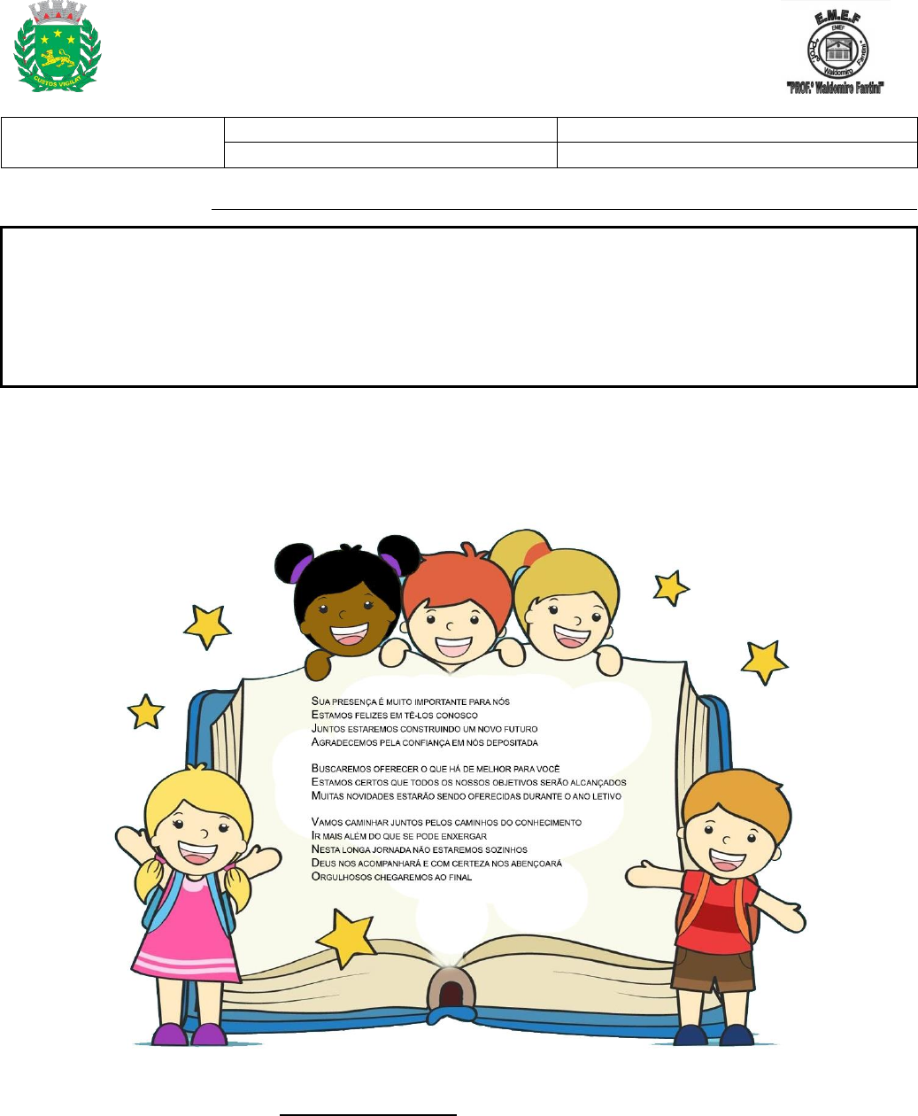 1 PREFEITURA MUNICIPAL DE BAURU Secretaria Municipal da Educação EMEF “Prof. Waldomiro Fantini” 2º ANO C PERÍODO LETIVO COMPONENTE CURRICULAR AVALIAÇÃO DIAGNOSTICA NOME DO ALUNO: CONTEÚDOS ESSENCIAIS: PÔRTUGUÊS: FONEMA-GRAFEMA; SÍLABAS, PALAVRAS, FRASES, SEGMENTAÇÃO, GÊNEROS TEXTUAIS; LISTA DE PALAVRAS; RETOMADA DOS CONTEÚDOS DO QUARTO BIMESTRE 1º ANO. MATEMÁTICA: NÚMEROS NATURAIS; CONTAGEM NUMÉRICA; SEQUÊNCIA NUMÉRICA; SUCESSOR E ANTECESSOR; ADIÇÃO E SUBTRAÇÃO; GRÁFICO E TABELA. OBJETIVOS: AVALIAR AS HABILIDADES DE LEITURA E MATEMÁTICA QUE OS ESTUDANTES JÁ DOMINAM, SUAS DIFICULDADES E QUAIS HABILIDADES CONSOLIDAR. OLÁ! TUDO BEM COM VOCÊ? Disponível em: < https://cutt.ly/lk0LiLZ >. Acesso em 12 de fevereiro de 2021. QUERIDOS ALUNOS, PAIS E RESPONSÁVEIS, ASSIM COMO AS ÃGUAS DE MARÇO TRAZEM VIDA AS PLANTAS, ENCHEM OS RIOS, MATAM A SEDE E FAZEM O OUTONO FRUTIFICAR, DESEJO QUE NOSSOS SONHOS SEJAM REALIZADOS! VAMOS JUNTOS CONTINUAR NOSSA JORNADA EM BUSCA DE CONHECIMENTO, COM MUITA FÉ E ESPERANÇA EM DIAS MELHORES, SUPERANDO NOSSOS MEDOS E DESAFIOS. DESEJO QUE O AMOR E ALEGRIA ESTEJAM PRESENTES DURANTE O ANO LETIVO. 2 CAROS PAIS E RESPONSÁVEIS, ESTA PRIMEIRA AVALIAÇÃO, A SER EFETUADA NO INÍCIO DO ANO LETIVO, TEM COMO PRINCIPAL OBJETIVO REALIZAR DIAGNÓSTICO DOS NÍVEIS DE ALFABETIZAÇÃO MATEMÁTICA E LÍNGUA PORTUGUESA DOS ALUNOS, APÓS UM ANO DE ESTUDOS. DE MANEIRA QUE, AS INFORMAÇÕES OBTIDAS POSSAM ORIENTAR O TRABALHO PEDAGÓGICO E PLANEJAMENTO DURANTE O PROCESSO DE ENSINO E APRENDIZAGEM. AVALIAÇÃO DIAGNÓSTICA - LÍNGUA PORTUGUESA ATIVIDADE 1: VOGAIS - GRAFIA E FONEMA A) VOCÊ JÁ APRENDEU TODAS AS LETRAS DO ALFABETO, ENTRE ELAS TÊM AS 5 VOGAIS QUE AJUDAM A FORMAR MUITAS PALAVRAS. LIGUE A VOGAL A FIGURA CUJO NOME SE INICIA COM A SUA LETRA. Disponível em: < https://cutt.ly/4k0DdYN >. Acesso em 12 de fevereiro de 2021. QUQUQUQQ QUERIDO(A) ALUNO(A), AGORA VOCÊ VAI COLOCAR EM PRÃTICA TUDO QUE JÁ SABE, PRESTE ATENÇÃO EM TUDO QUE FOR LIDO E COM A AJUDA DE UM FAMILIAR FAÇA TODAS AS ATIVIDADES PROPOSTAS COM CARINHO. LEMBRE-SE QUE VOCÊ DEVE RESPONDER SOZINHO. BOM ESTUDO!!! PROF. CÉLIA https://cutt.ly/4k0DdYN 3 B) ESCREVA A VOGAL QUE ESTÁ FALTANDO NO NOME DAS FRUTAS. Disponível em: < https://cutt.ly/vk0HA5D >. 13 de fevereiro de 2021. C) COMPLETE O NOME DAS FIGURAS COM AS VOGAIS: A – E – I – O – U. DEPOIS FAÇA UMA LISTA COM O NOME DAS FIGURAS E PINTE BEM BONITO! Disponível em: < https://cutt.ly/tk0JQiW >. Acesso em 12 de fevereiro de 2021. https://cutt.ly/tk0JQiW 4 ATIVIDADE 2: ALFABETO, GRAFIA E FONEMA A) FALE E ESCREVA A LETRA INICIAL DE CADA FIGURA E DESCUBRA AS 26 LETRAS DO ALFABETO. PINTE AS FIGURAS BEM COLORIDAS!!! Disponível em: < https://cutt.ly/sk0BuJr >. Acesso em 12 de fevereiro de 2021. 5 B) ALGUMAS LETRAS DOS NOMES DAS FIGURAS SUMIRAM! FALE O NOME DAS FIGURAS E COMPLETE COM A CONSOANTE QUE ESTÁ FALTANDO: B – C – D – F – G – H – J – K – L – M – N – P – Q – R – S – T – V – W- X – Y- Z Disponível em < https://cutt.ly/Xk0BjUK >. Acesso em 13 de fevereiro de 2021. 6 ATIVIDADE 3: SÍLABAS, FONEMA, FORMAÇÃO DA PALAVRA A) AS PALAVRAS SÃO FORMADAS POR PEDAÇOS QUE CHAMAMOS DE SÍLABAS. LEIA E PINTE AS SÍLABAS DO NOME DAS FIGURAS E ESCREVA O NOME DE CADA FIGURA NA ORDEM CORRETA. Disponível em: < https://cutt.ly/fk2IHcy >. Acesso em 13 de fevereiro de 2021. 7 B) FALE O NOME DAS FIGURAS E DESCUBRA AS SÍLABAS QUE FALTAM. USE O BANCO DE SÍLABAS PARA COMPLETAR: NE - VE - TO – SO - MA - VE - RA Disponível em: < https://cutt.ly/zk0B3r0 >. Acesso em 13 de fevereiro de 2021. C) MARQUE UM X NA SÍLABA INICIAL DE CADA FIGURA. USE AS SÍLABAS AO LADO DE CADA FIGURA PARA ESCREVER O NOME DELA CORRETAMENTE. Disponível em: < https://cutt.ly/Sk0Ngkq >. Acesso em 13 de fevereiro de 2021. 8 D) FALE O NOME DA FIGURA, PROCURE O NOME NO BANCO DE PALAVRAS: BOTA – BODE – BULE –BOLA - COCO – CAMA - DADO – DEDO. ESCREVA O NOME DA FIGURA E DEPOIS SEPARE O NOME EM SÍLABAS. Disponível em: < https://cutt.ly/bk0NCEY >. Acesso em fevereiro de 2021. ATIVIDADE 4: PARLENDA, INTERPRETAÇÃO DE TEXTO A) LEIA A PARLENDA COLOCANDO O DEDO SOBRE CADA PALAVRA. CIRCULE NO TEXTO: AVÓ - TIA – CASA - CIPÓ - MÃO - BONITO - CORAÇÃO. PREENCHA A CRUZADINHA COM O NOME DAS FIGURAS. Disponível em: < https://cutt.ly/9k03O0m >. Acesso em 13 de fevereiro. 9 B) ORGANIZE CORRETAMENTE AS PALAVRAS DA PARLENDA “CORRE CUTIA” CORRECUTIA _________ - ________ NACASADATIA ______ _______ _____ _____ CORRECIPÓ _________ ________ NACASADAVÓ ______ _______ ______ _____ LENCINHONAMÃO ______________ _____ ______ CAIUNOCHÃO _________ ____ ________ C) PROCURE NO TEXTO AS RESPOSTAS PARA ESTAS PERGUNTAS: QUAL É O TÍTULO DA PARLENDA? QUEM CORRE NA CASA DA TIA? QUEM CORRE NA CASA DA VÓ? O QUÊ CAIU NO CHÃO? ESCREVA PALAVRAS QUE RIMAM COM: CIPÓ CUTIA MÃO _____________ _______________ _______________ D) O TEXTO QUE VOCÊ LEU É: ( ) UM CONVITE ( ) UMA PARLENDA ( ) UMA POESIA 10 ATIVIDADE 5: NOMENCLATURA, PALAVRA E FRASE A) NOMEAR AS FIGURAS ABAIXO Disponível em: < https://cutt.ly/Ok08EsW >. Acesso em 14 de fevereiro de 2021. B) ESCREVA DO SEU JEITO NA LINHA ABAIXO, UMA FRASE COM A FRUTA QUE VOCÊ MAIS GOSTA, NÃO PODE DITAR AS LETRAS PARA A CRIANÇA.: https://cutt.ly/Ok08EsW 11 AVALIAÇÃO DIAGNÓSTICA - MATEMÁTICA ATIVIDADE 1: NÚMEROS NATURAIS, IDENTIFICAR OS NUMERAIS, MAIOR E MENOR, SEQUÊNCIA NUMÉRICA, SUCESSOR, ANTECESSOR, ORDEM CRESCENTE E DECRESCENTE. A) DESCUBRA OS NÚMERAIS ESCONDIDOS E CIRCULE TODOS ELES. Disponível em: < https://cutt.ly/gk04W14 >. Acesso em 14 de fevereiro de 2021. B) ESCREVA NA TABELA OS NÚMEROS QUE VOCÊ ENCONTROU QUAL FOI O MAIOR NÚMERO ENCONTRADO?........................... QUAL FOI O MENOR NÚMERO ENCONTRADO?.......................... C) DESCUBRA OS NÚMEROS ESCONDIDOS E ESCREVA- OS AO LADO DAS FIGURAS ABAIXO: Disponível em: < https://cutt.ly/1k2s97I >. Acesso em 14 de fevereiro de 2021