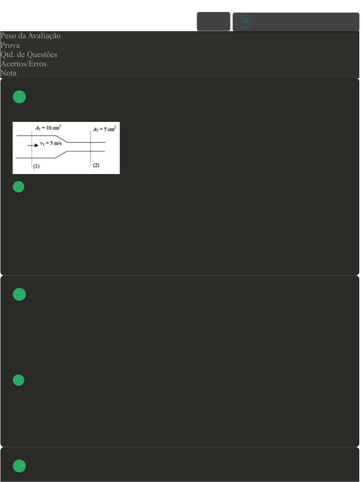 Prova Impressa GABARITO | Avaliação II - Individual (Cod.:828010) Peso da Avaliação 1,50 Prova 62723005 Qtd. de Questões 10 Acertos/Erros 10/0 Nota 10,00 Na tubulação convergente da figura a seguir, calcule a velocidade na seção 2, sabendo que o fluido é incompressível. Assinale a alternativa CORRETA que apresenta o resultado: A 10 m/s. B 14 m/s. C 12 m/s. D 13 m/s. Não existem valores precisos de números de Reynolds que definem os regimes de escoamento. A transição de um regime de escoamento laminar para turbulento vai do grau de perturbação do escoamento por rugosidade da parede do tubo, vibrações da tubulação e flutuações no escoamento a montante. Assinale a alternativa CORRETA que apresenta a classificação de um regime laminar: A Re maior que 4000. B Re menor que 2300. C Re maior que 5000. D Re maior que 2800. A equação de Bernoulli pode ser aplicada para descrever o balanço de energias mecânicas em um escoamento de fluido em regime permanente. A partir de um somatório da energia potencial, VOLTAR A+ Alterar modo de visualização 1 2 3 energia cinética e energia de fluxo de um fluido é possível determinar a sua carga hidráulica de escoamento. Com base no balanço de energia mecânica aplicado ao escoamento em regime permanente de um fluido e nas formas de apresentação da equação de Bernoulli, faça uma análise dimensional das equações apresentadas e associe os itens, utilizando o código a seguir: I- Esta forma da equação de Bernoulli apresenta os termos de energia mecânica na unidade de pressão, por exemplo, "Pascal". II- Esta forma da equação de Bernoulli apresenta os termos de energia mecânica na unidade de comprimento, por exemplo, "metro". III- Esta forma da equação de Bernoulli apresenta os termos de energia mecânica na unidade de energia por massa, por exemplo, "J/kg". Assinale a alternativa CORRETA: A III - I - II. B I - II - III. C II - I - III. D II - III - I. É uma região do espaço selecionada, onde há escoamento de massa. Nesse sistema, massa e energia podem cruzar a fronteira. Essa definição se refere a quê? A Fronteira. B Massa de controle. C Volume de controle. D Vizinhança. 4 [Laboratório Virtual – Experimento de Reynolds] Na prática experimental do laboratório virtual desta disciplina, você conheceu o Experimento de Reynolds, executado para observação e caracterização dos regimes de escoamento de um fluido com base nas forças inerciais e forças viscosas atuantes. Com base no sumário teórico, roteiro da prática e na condução do experimento no laboratório virtual, qual foi a dependência principal observada pelo engenheiro Osborne Reynolds nos seus experimentos envolvendo escoamento de um fluido em uma tubulação, em torno de 1880? A Reynolds observou a relação e dependência entre as forças inerciais e forças viscosas do fluido no escoamento dentro da tubulação. B Reynolds observou a relação e dependência entre as forças centrípetas e forças viscosas do fluido no escoamento dentro da tubulação. C Reynolds observou a relação e dependência entre as forças centrípetas e a força gravitacional do fluido no escoamento dentro da tubulação. D Reynolds observou a relação e dependência entre as forças inerciais e a força de velocidade do fluido no escoamento dentro da tubulação. O diagrama de Moody é um dos diagramas mais utilizados na Engenharia. Ele apresenta o fator de atrito de Darcy para o escoamento em um tubo como uma função do número de Reynolds e de rugosidade relativa em um amplo intervalo. Com base neste conceito, avalie as asserções a seguir e a relação proposta entre elas: I- Para um tubo com diâmetro constante, a rugosidade relativa é um parâmetro constante e não se altera ao longo do tempo devido ao uso da tubulação. PORQUE II- A rugosidade das tubulações disponíveis comercialmente não é uniforme e aumenta devido ao depósito de materiais sólidos dissolvidos na superfície interna dos tubos. Assinale a alternativa CORRETA: A A asserção I é uma proposição falsa e a asserção II é uma proposição verdadeira. B A asserção I é uma proposição verdadeira e a asserção II é uma proposição falsa. C As asserções I e II são proposições falsas e a asserção II não é uma justificativa correta da asserção I. D As asserções I e II são proposições verdadeiras e a asserção II é uma justificativa correta da asserção I. Uma tubulação de aço para condução de água (peso específico igual a 9790N/m³) é constituída por um trecho totalmente horizontal, sem acessórios, de comprimento igual a 2300 m e diâmetro interno de 200 mm. A vazão do escoamento é de 2,33 m³/min. O fator de atrito de Darcy da 5 6 7 tubulação pode ser considerado fD = 0,021. Adote g=9,81 m/s². Calcule a perda de carga total aproximada, em "metros", pela tubulação e utilize a equação de Bernoulli para determinar a queda de pressão aproximada (P1-P2) ao longo do comprimento desta tubulação e , em seguida, assinale a alternativa CORRETA: A Perda de carga = 0,0658 m. P1-P2= 644,182Pa. B Perda de carga = 5,18 m. P1-P2= 834891,2Pa. C Perda de carga = 18,8 m. P1-P2= 184052Pa. D Perda de carga = 2,41 m. P1-P2= 4013,9Pa. Dois reservatórios cúbicos de 10 m e 5 m de aresta são enchidos por água proveniente de uma mesma tubulação em 500 s e 100 s, respectivamente. Determine a velocidade da água na tubulação, sabendo que o seu diâmetro é 1,0 m, e assinale a alternativa CORRETA: A 5,43 m/s. B 5,23 m/s. C 4,47 m/s. D 4,13 m/s. [Laboratório Virtual – Experimento de Reynolds] Na prática experimental do laboratório virtual desta disciplina, você conheceu o Experimento de Reynolds, executado para observação e caracterização dos regimes de escoamento de um fluido com base nas forças inerciais e forças viscosas atuantes. Com base no sumário teórico, roteiro da prática e na condução do experimento no laboratório virtual, qua