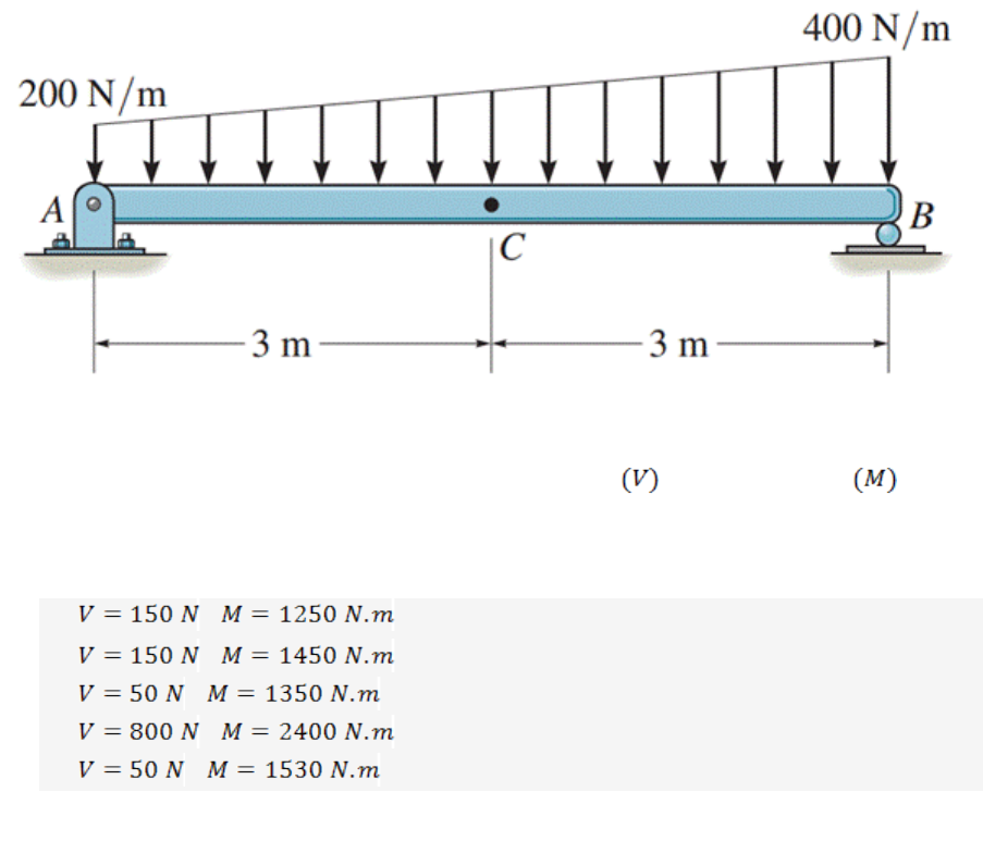 Para dimensionar uma estrutura metálica é fundamental que o engenheiro projetista conheça as forças atuam internamente no membro estrutural, para assim possibilitar a seleção do material e geometria capazes de suportar a carga de projeto. Considere a viga ilustrada a seguir. Figura 3: Representação de uma viga medindo 6 metros, com aplicação de forças sobre ela. Fonte: HIBBELER, 2016, p. 355. Agora, determine os valores máximos do esforço cortante e momento fletor em C, e assinale a alternativa que traz a resposta correta. · e . · e . · e . · e . · e . PULAR RESPOSTA: Alternativa 3.